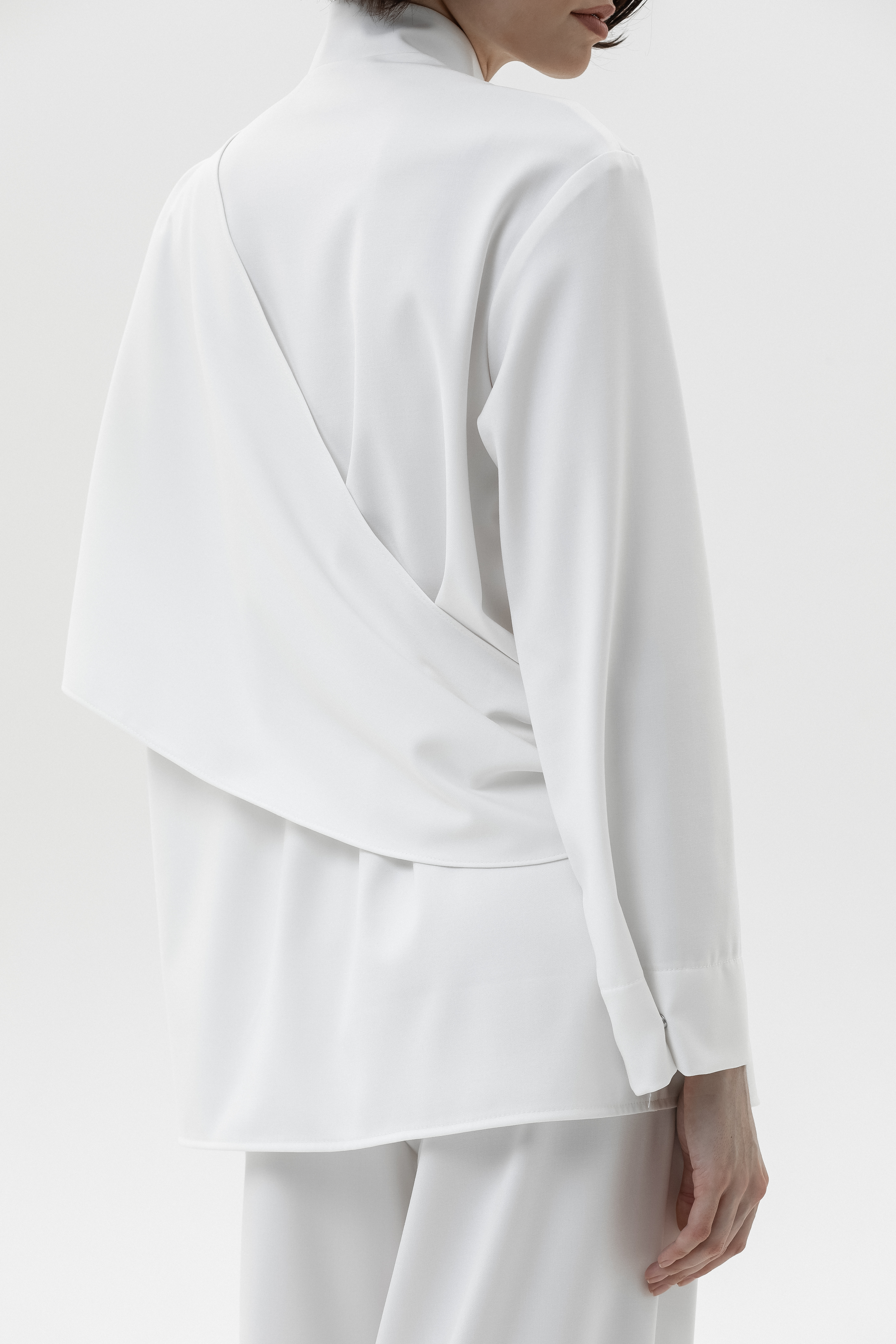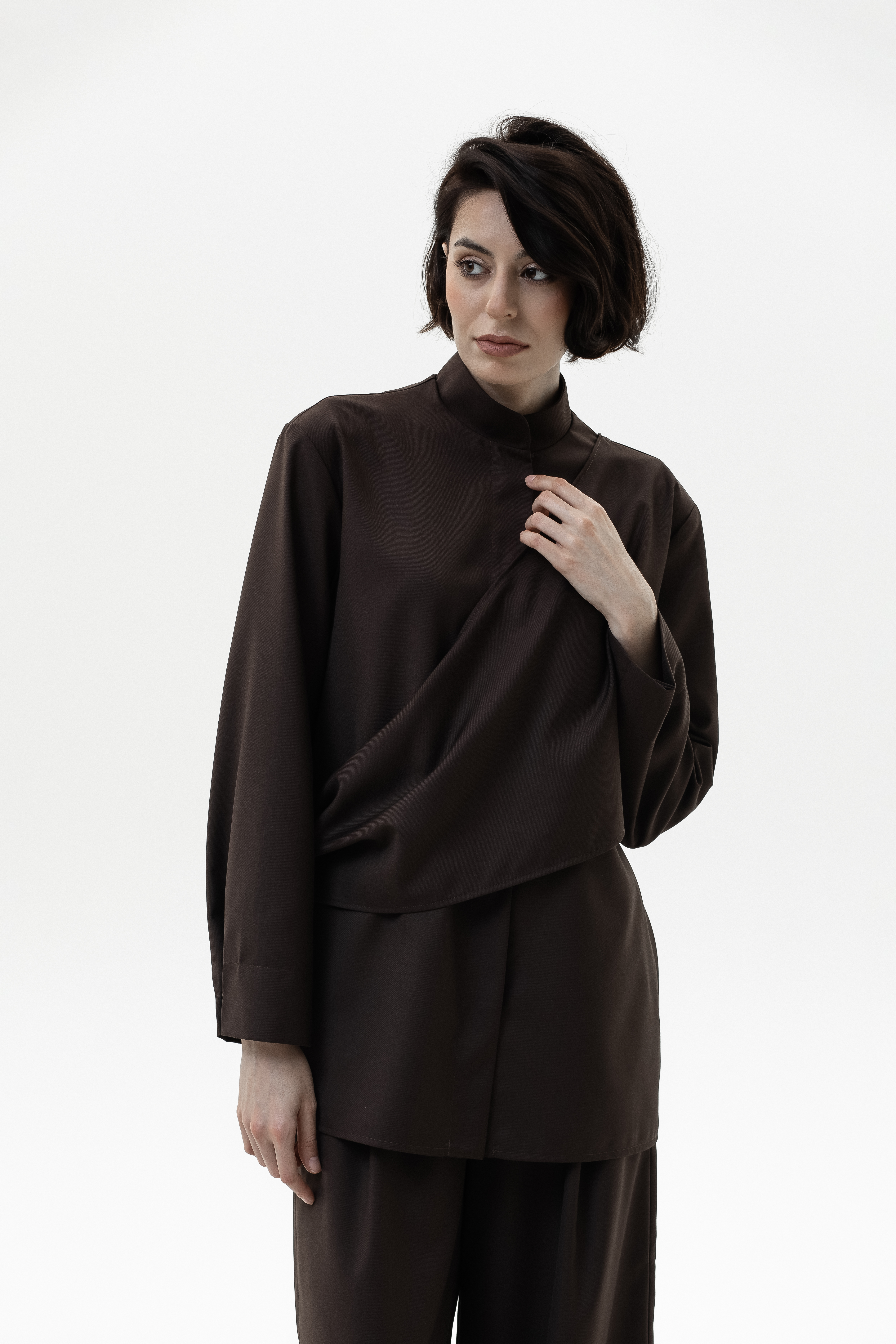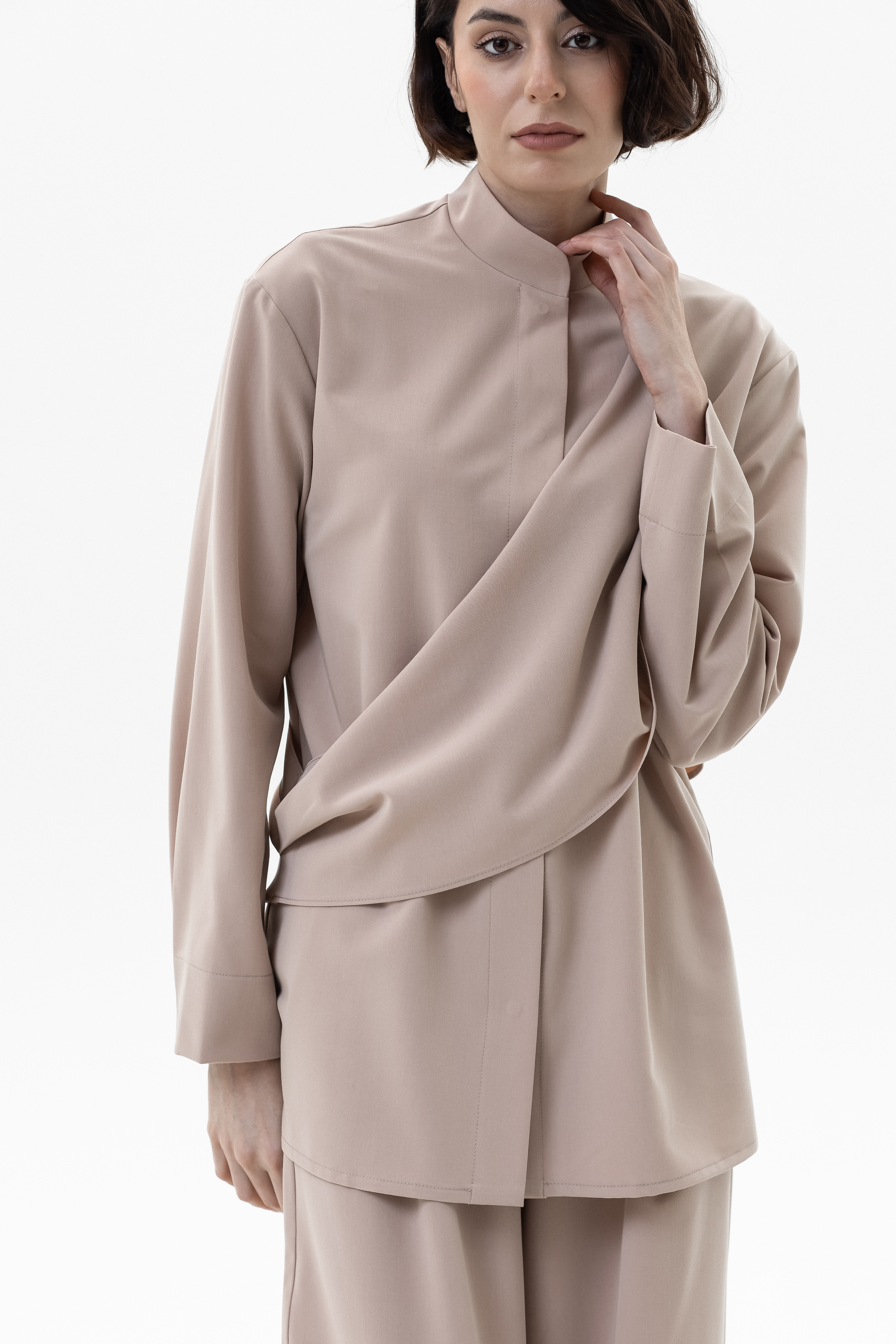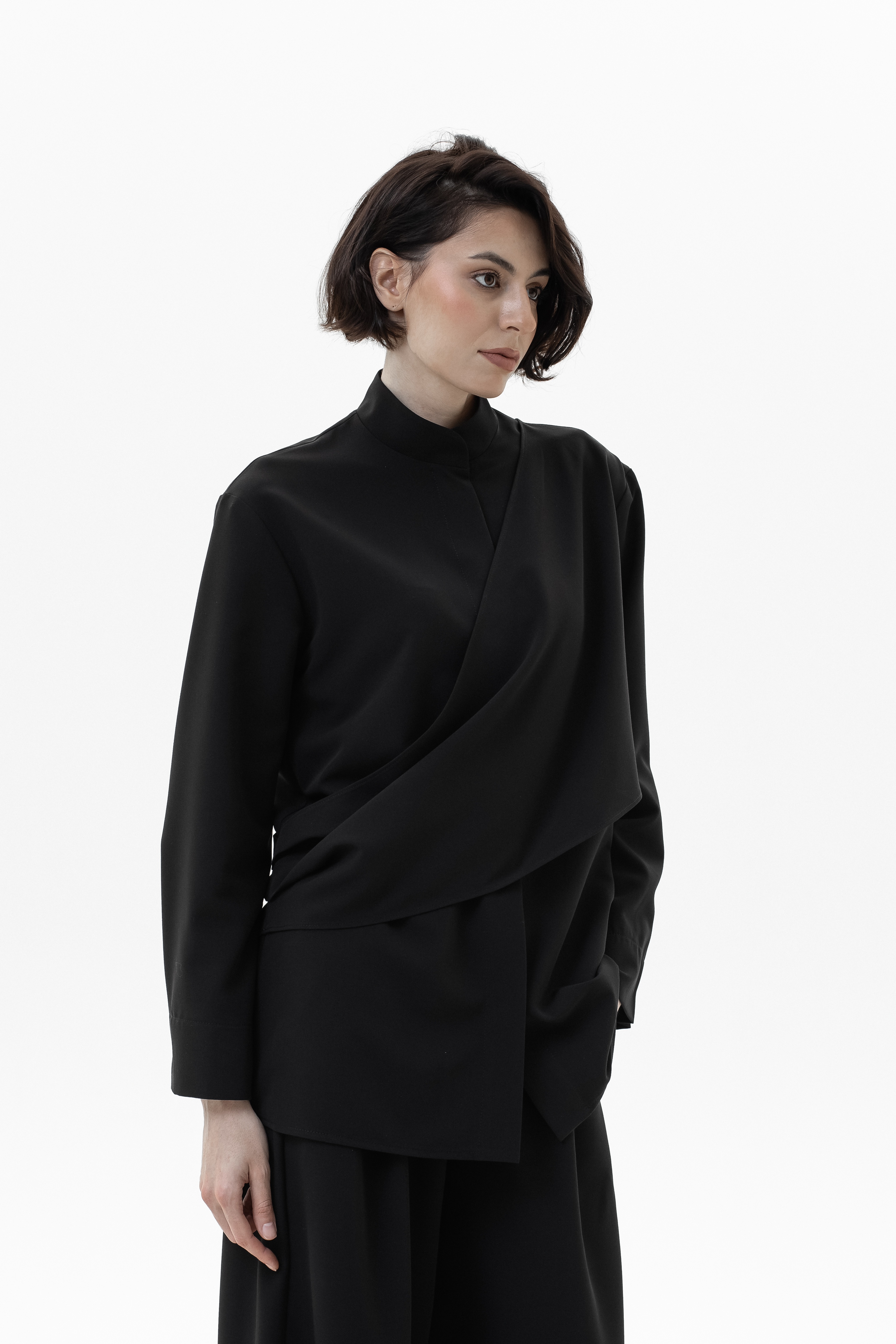 Блуза Mirage выполнена из мягкой, дышащей и комфортной ткани, идеально подходящей для длительного ношения. Шелковистая поверхность материала подчеркивает премиальный вид изделия, а эластичность обеспечивает свободу движений. Декоративная драпировка спереди и на спинке создаёт изящный силуэт, воротник-стойка добавляет строгости, а застежка на кнопках делает модель практичной. Рукава фиксируются кнопками, позволяя регулировать посадку.