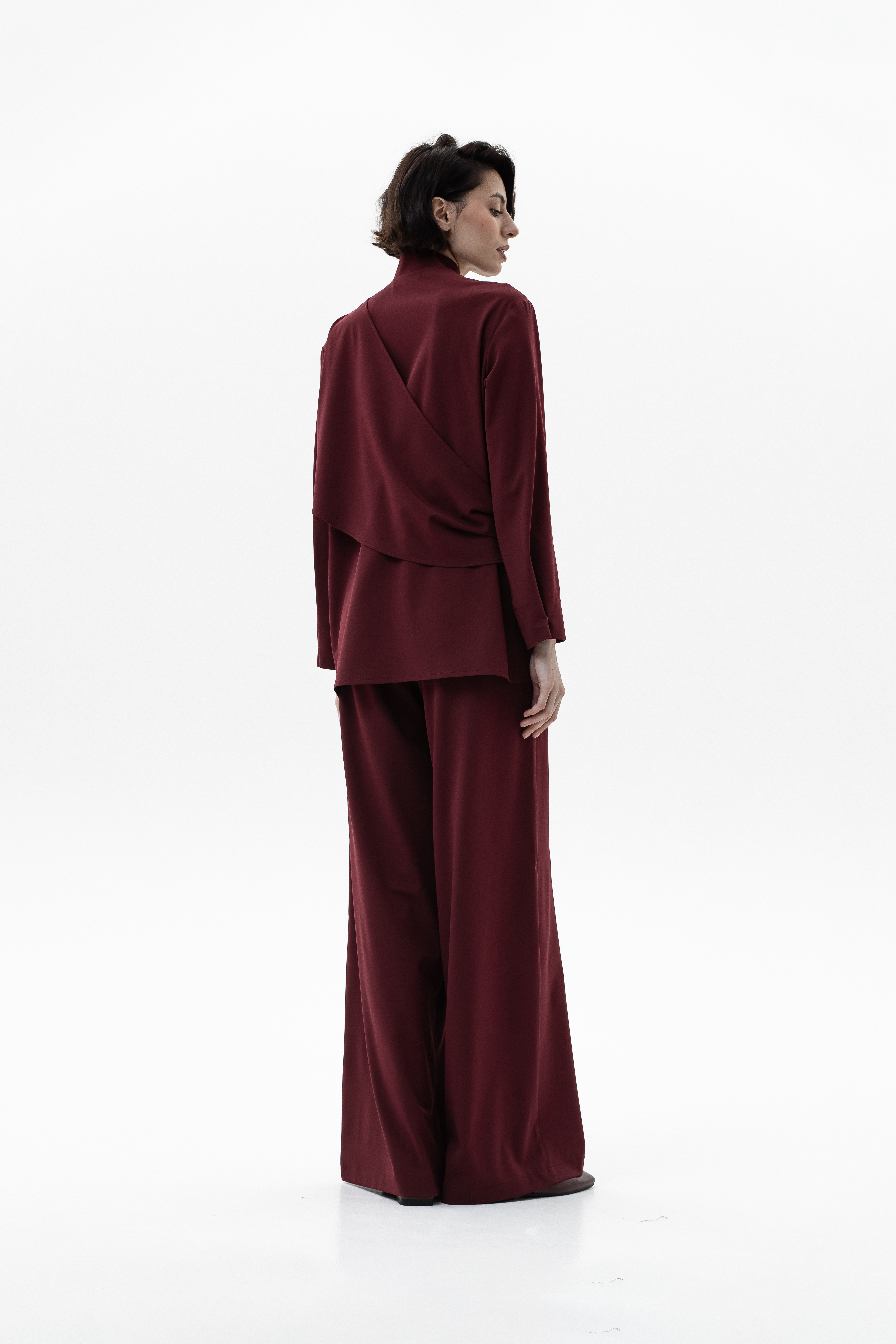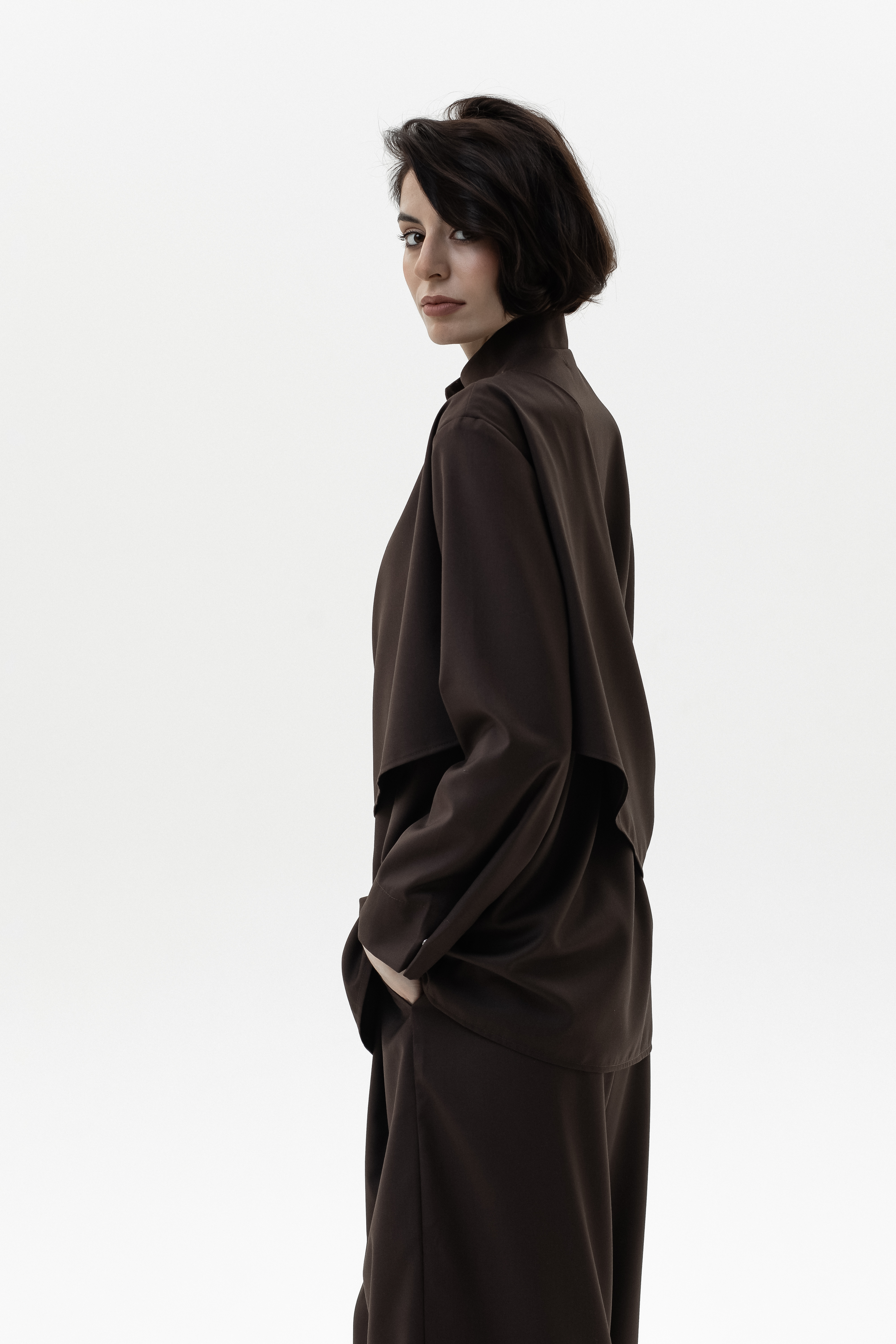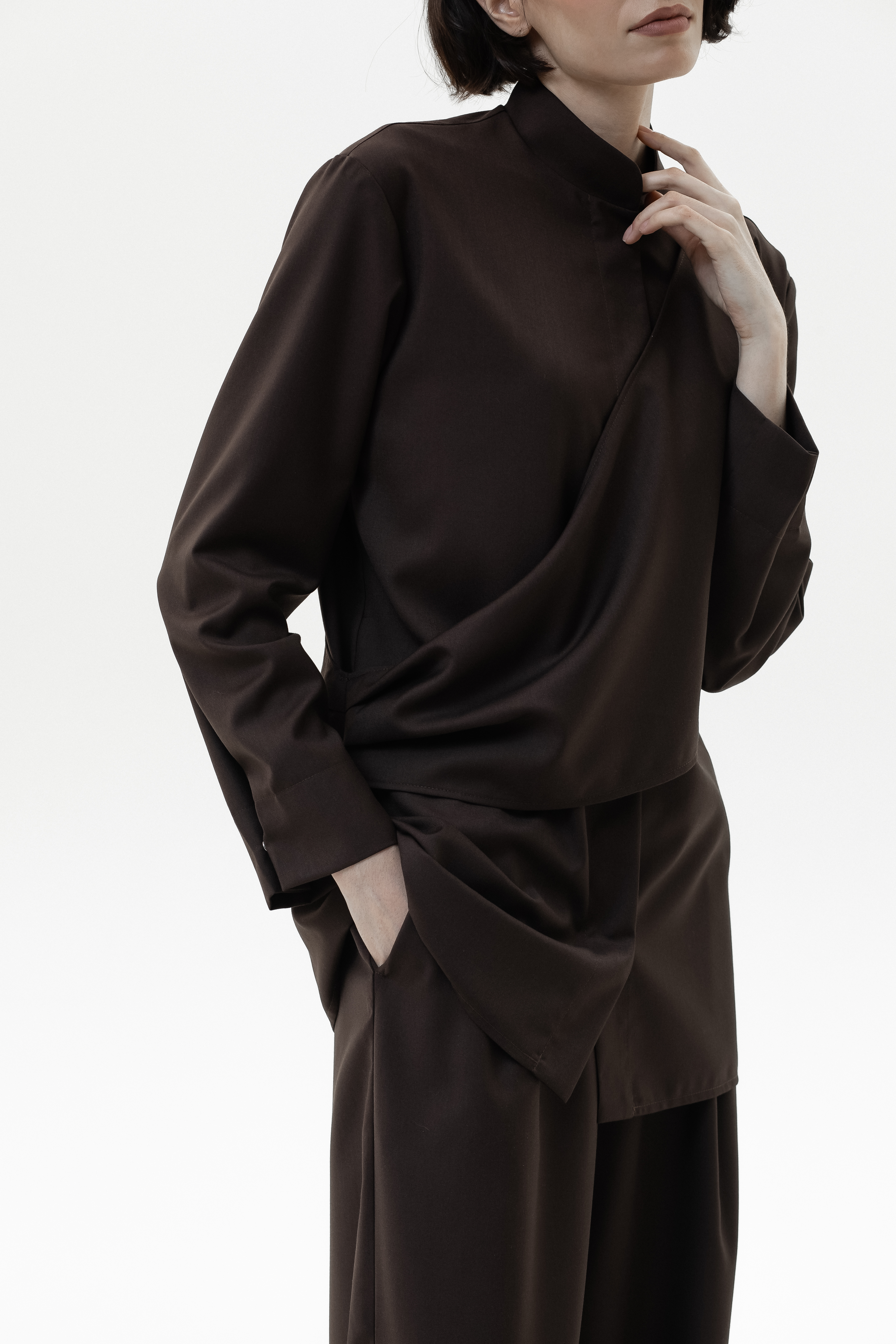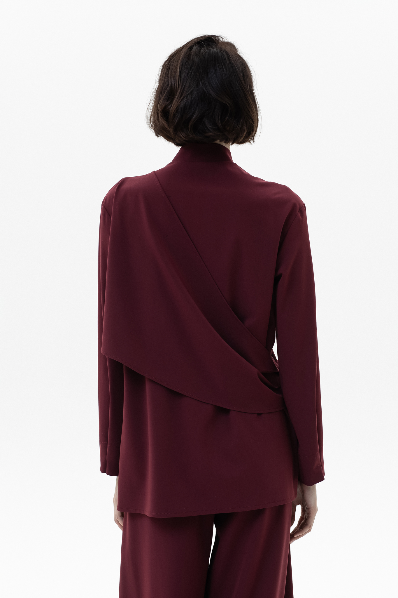 Блуза Mirage выполнена из мягкой, дышащей и комфортной ткани, идеально подходящей для длительного ношения. Шелковистая поверхность материала подчеркивает премиальный вид изделия, а эластичность обеспечивает свободу движений. Декоративная драпировка спереди и на спинке создаёт изящный силуэт, воротник-стойка добавляет строгости, а застежка на кнопках делает модель практичной. Рукава фиксируются кнопками, позволяя регулировать посадку.