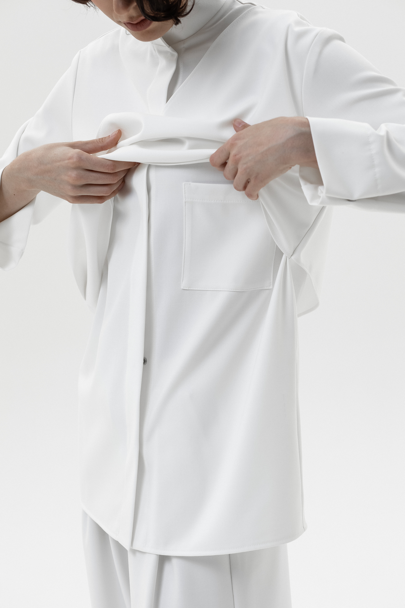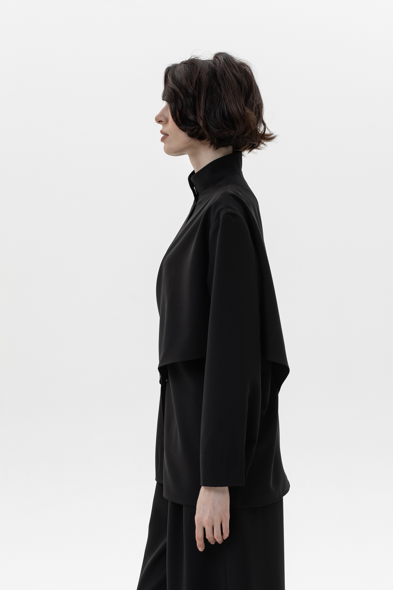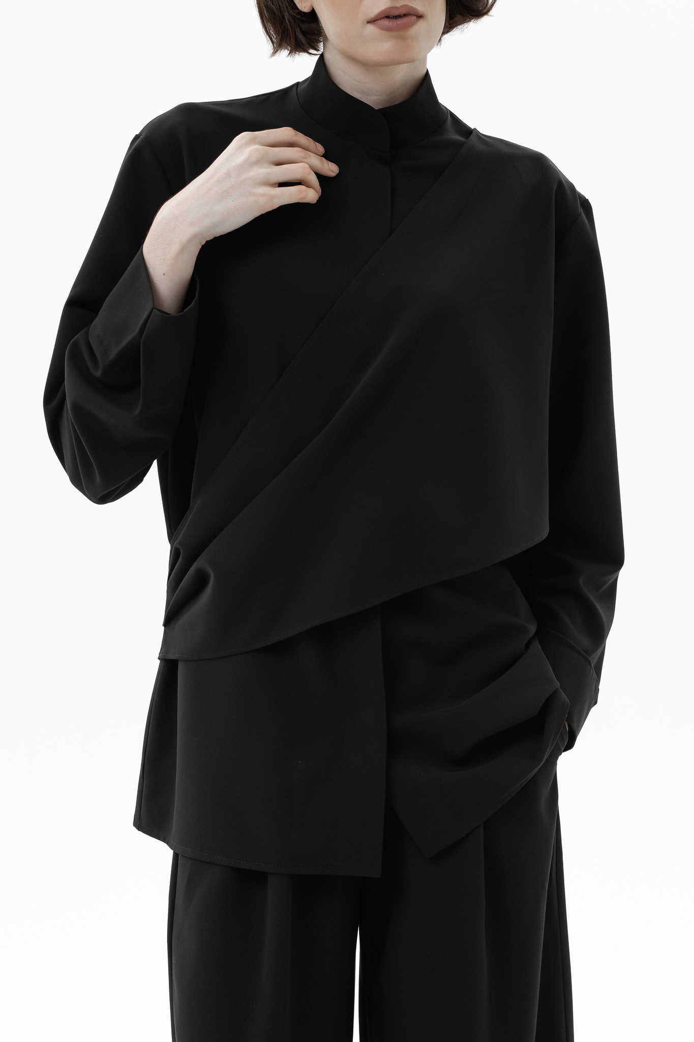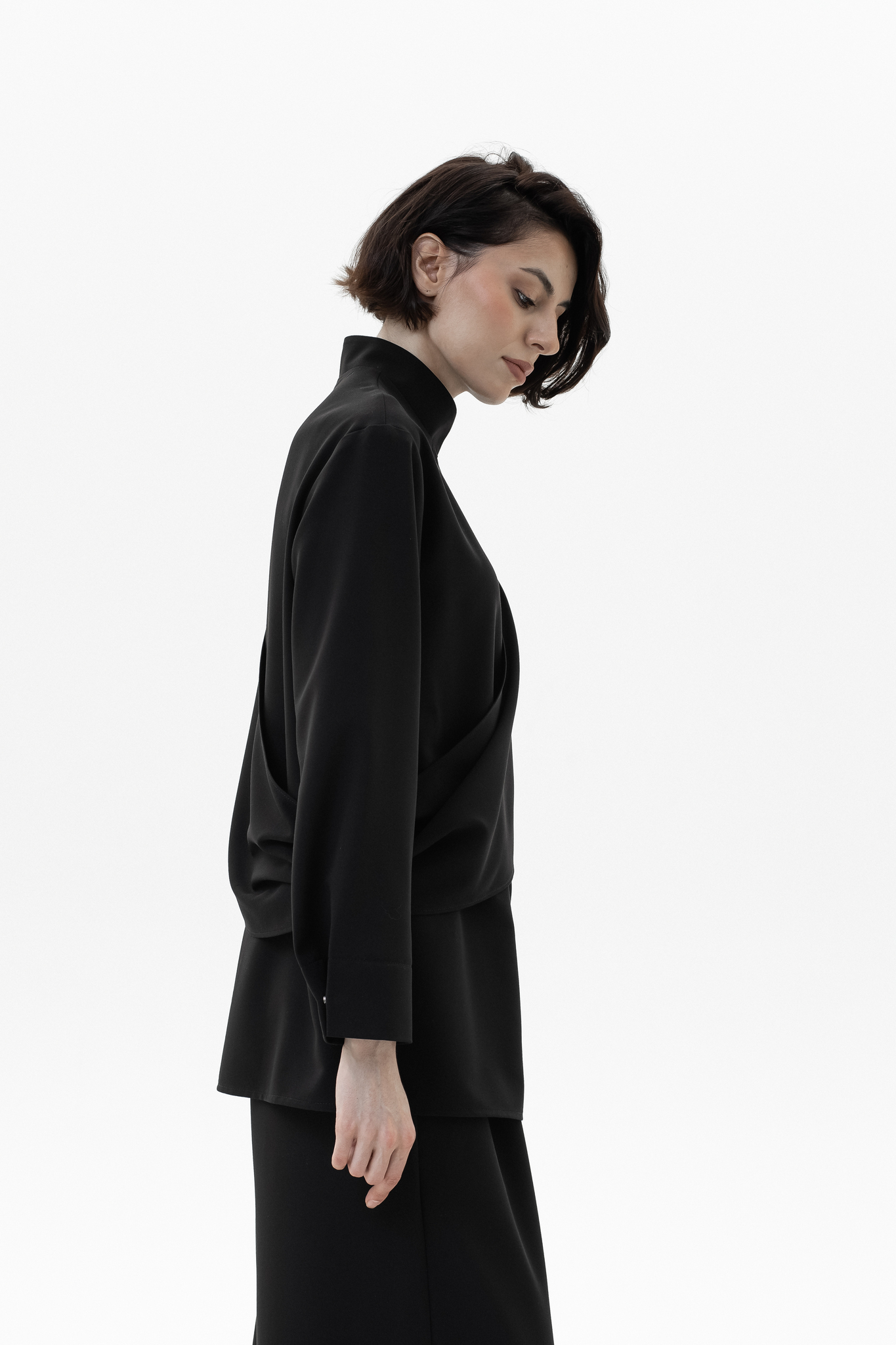 Блуза Mirage выполнена из мягкой, дышащей и комфортной ткани, идеально подходящей для длительного ношения. Шелковистая поверхность материала подчеркивает премиальный вид изделия, а эластичность обеспечивает свободу движений. Декоративная драпировка спереди и на спинке создаёт изящный силуэт, воротник-стойка добавляет строгости, а застежка на кнопках делает модель практичной. Рукава фиксируются кнопками, позволяя регулировать посадку.