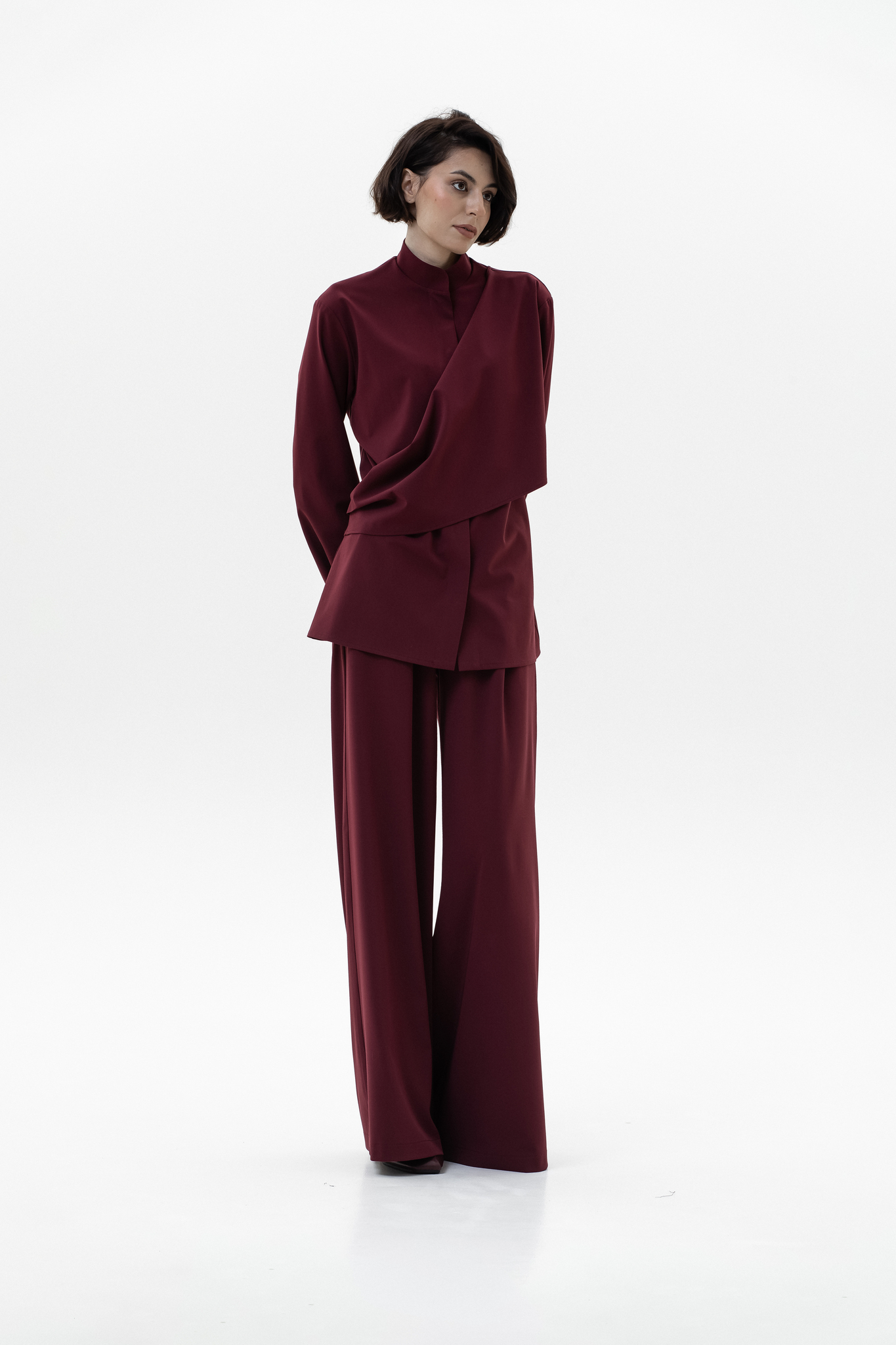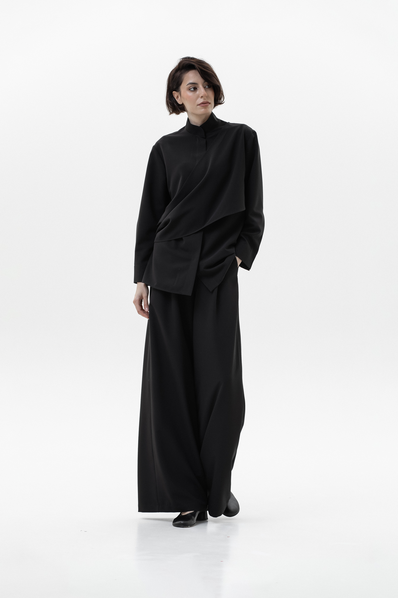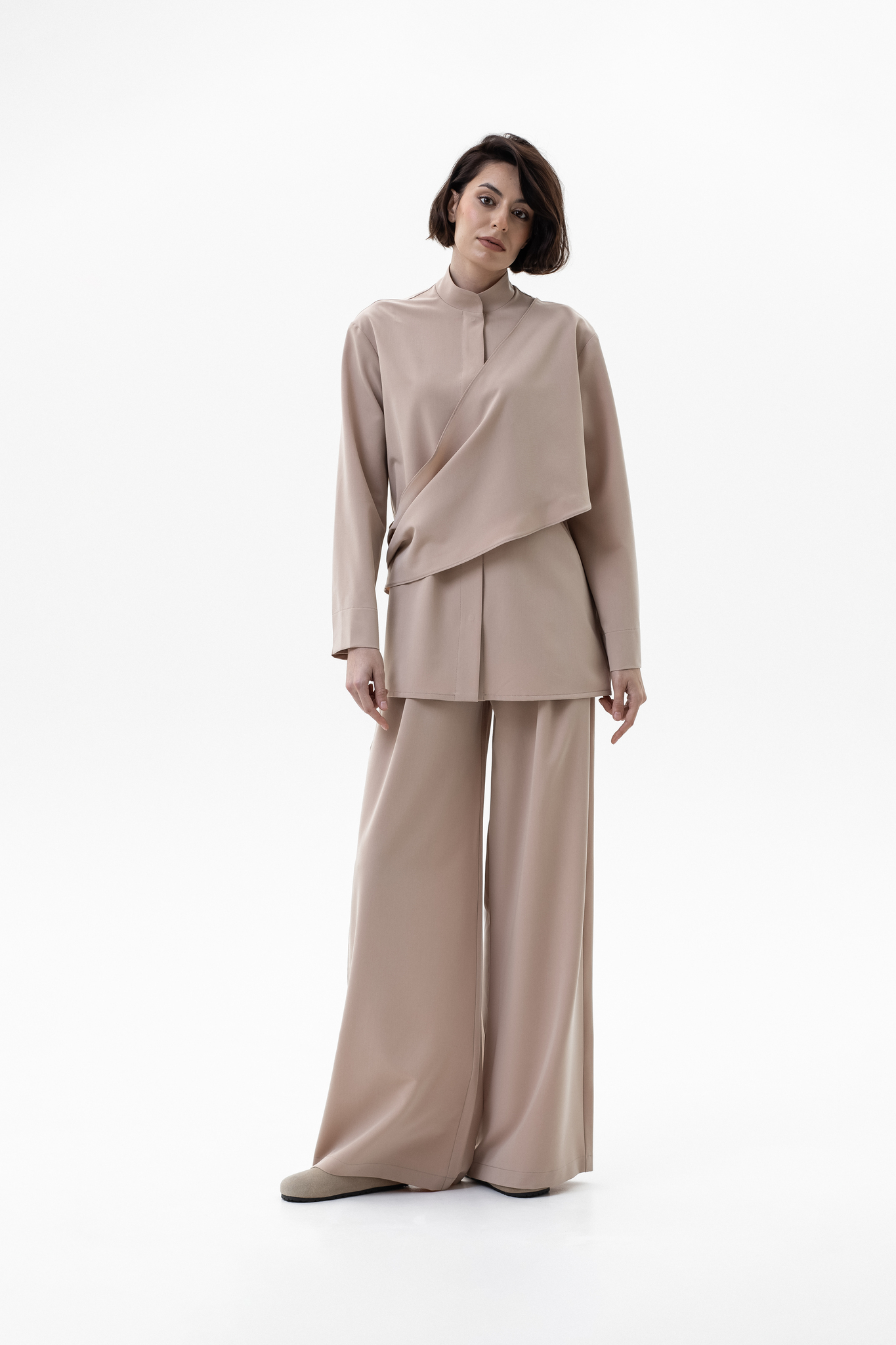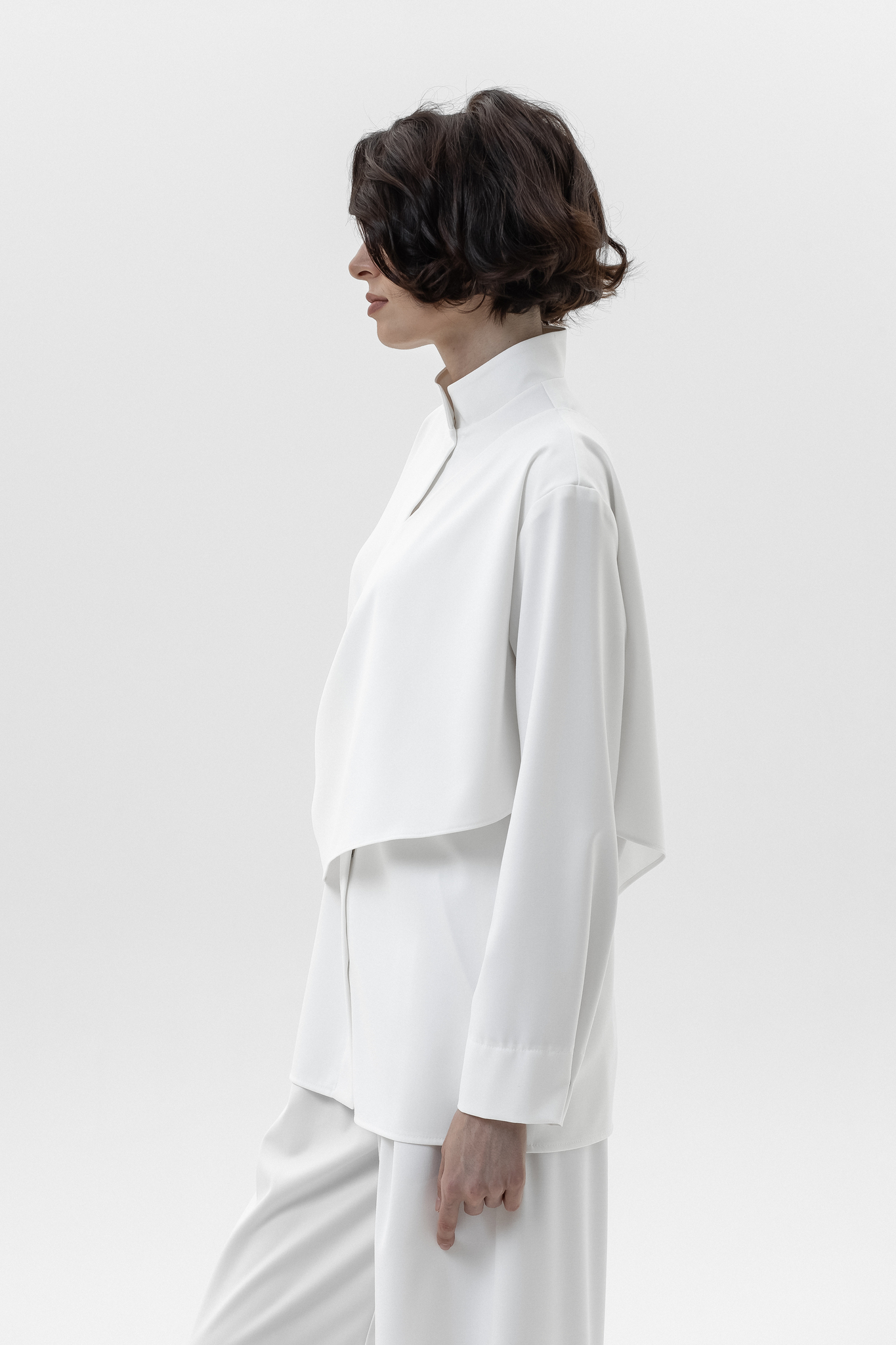 Блуза Mirage выполнена из мягкой, дышащей и комфортной ткани, идеально подходящей для длительного ношения. Шелковистая поверхность материала подчеркивает премиальный вид изделия, а эластичность обеспечивает свободу движений. Декоративная драпировка спереди и на спинке создаёт изящный силуэт, воротник-стойка добавляет строгости, а застежка на кнопках делает модель практичной. Рукава фиксируются кнопками, позволяя регулировать посадку.