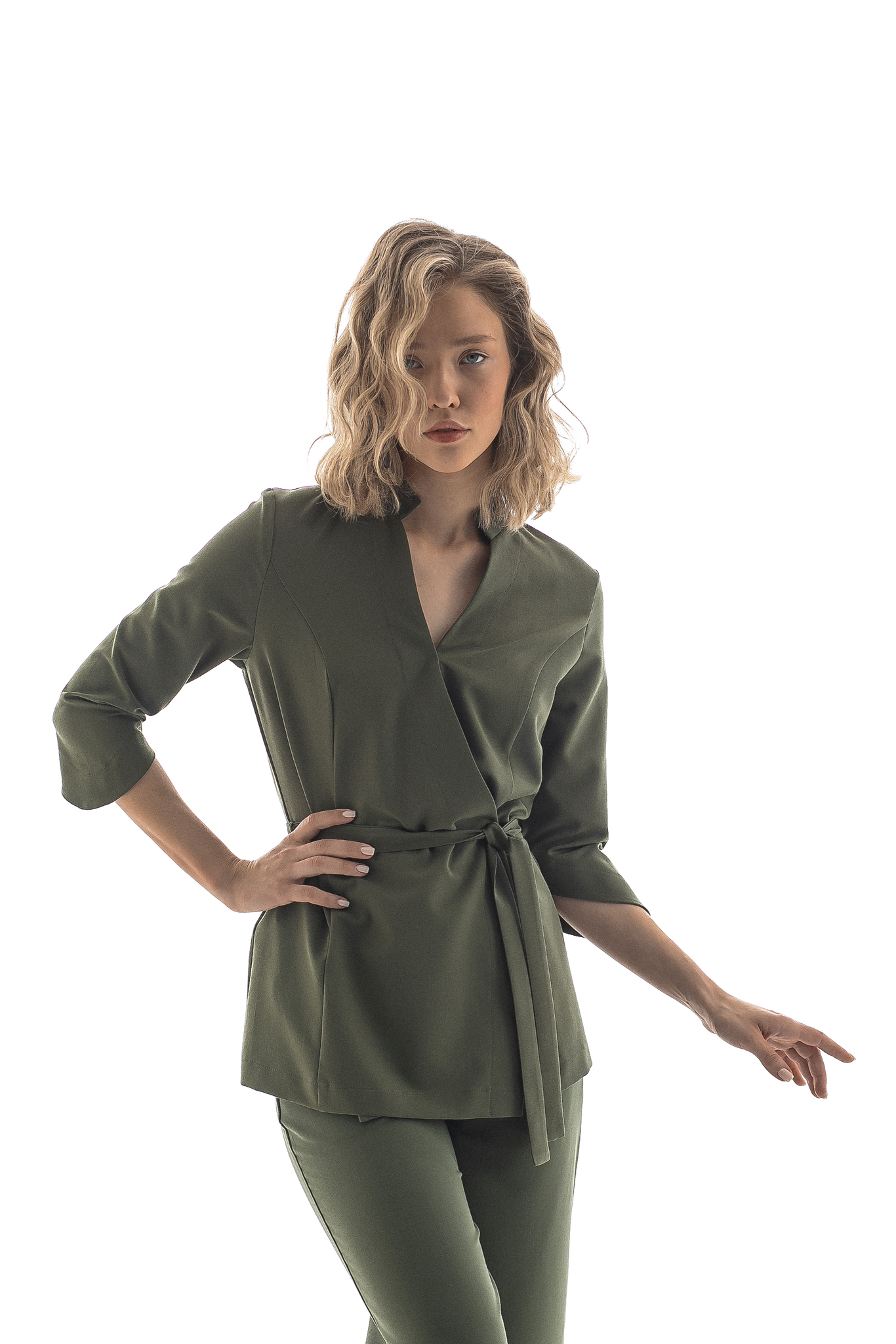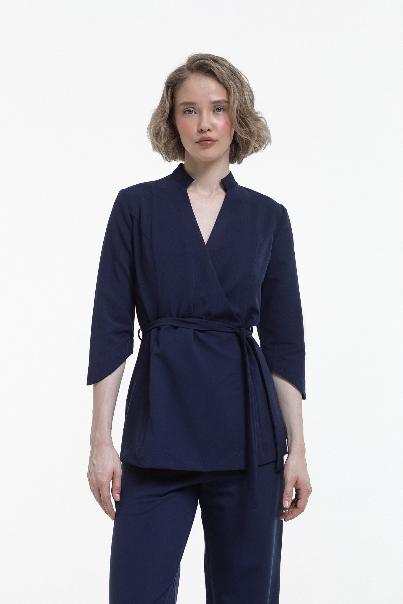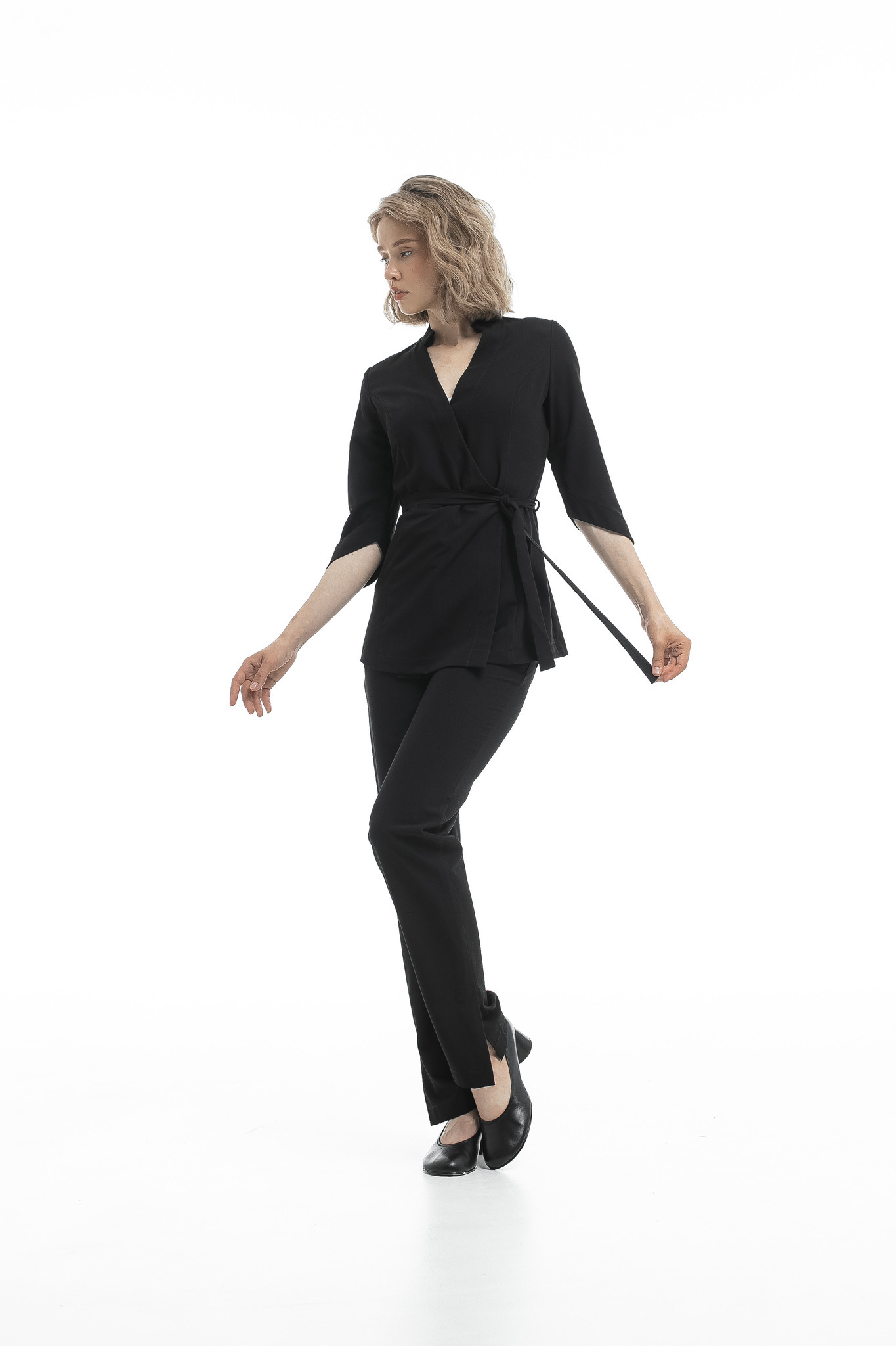 Две кнопки на изделии надежно фиксируют ткань в зоне декольте, а внутренняя завязка и пояс позволяют отрегулировать размер под обхват вашей талии. Комфортная длина рукава обеспечивает свободу движений и не вызывает дискомфорта при работе. Ткань отлично тянется, что делает блузу удобной даже при интенсивной деятельности.