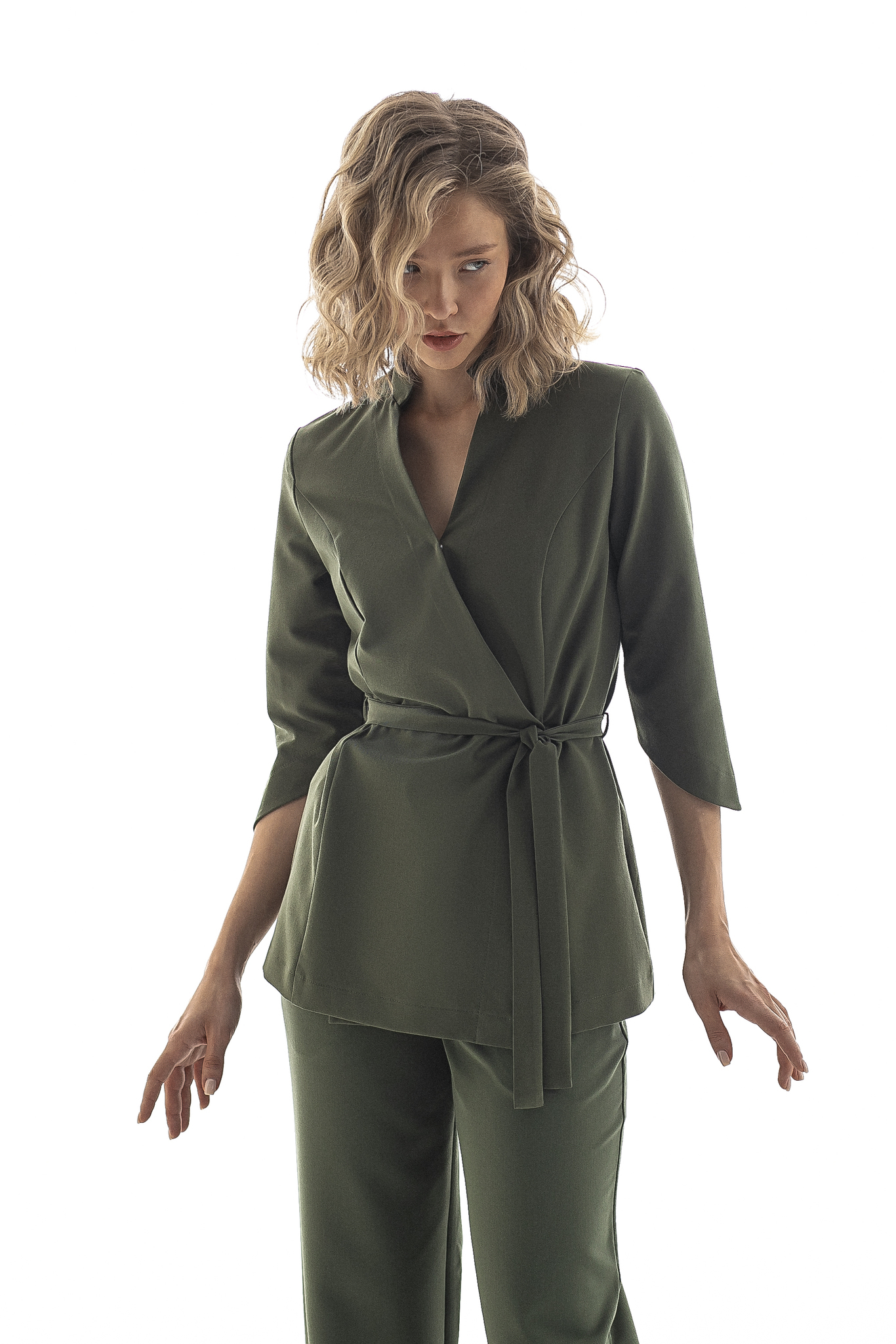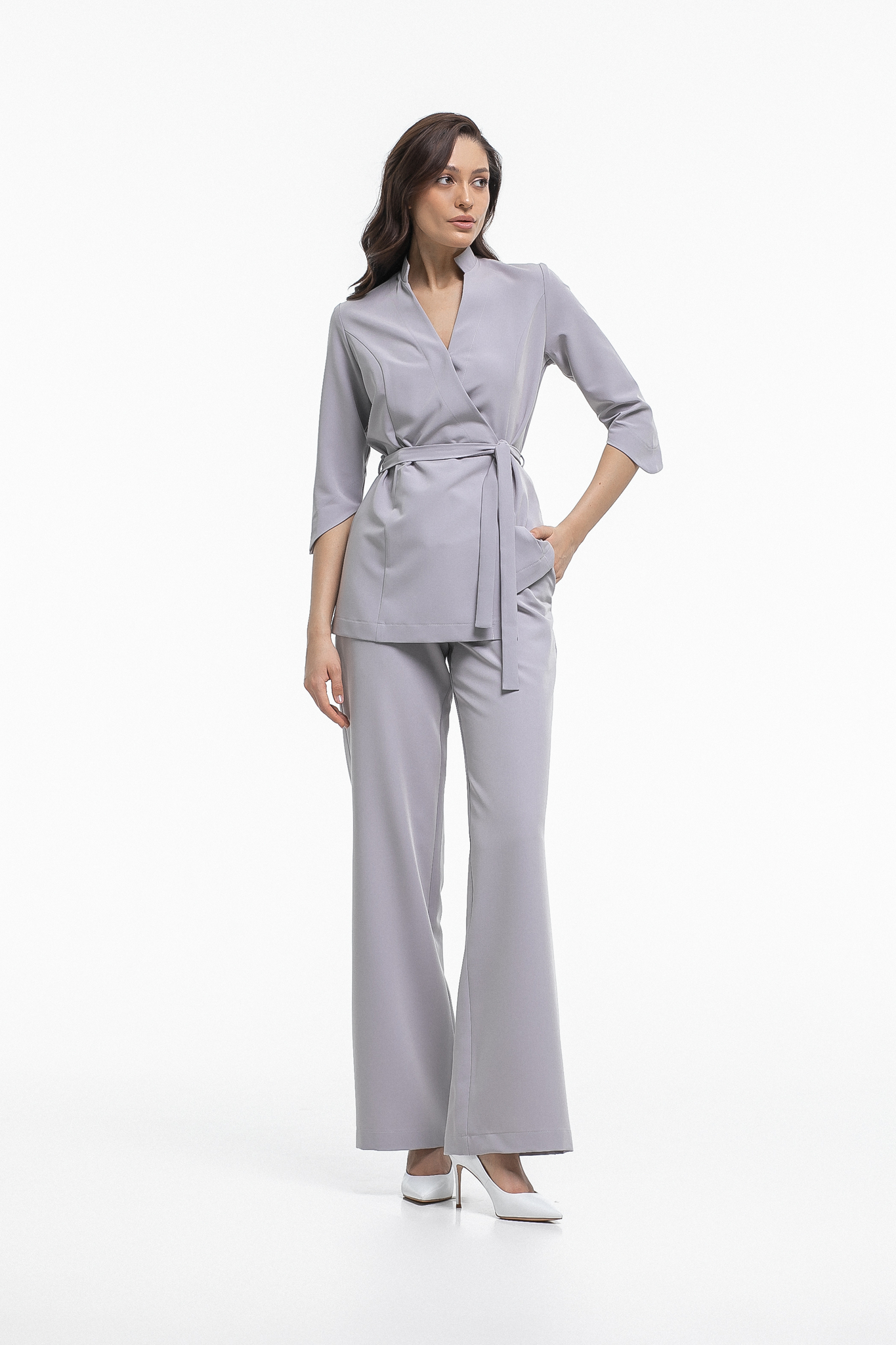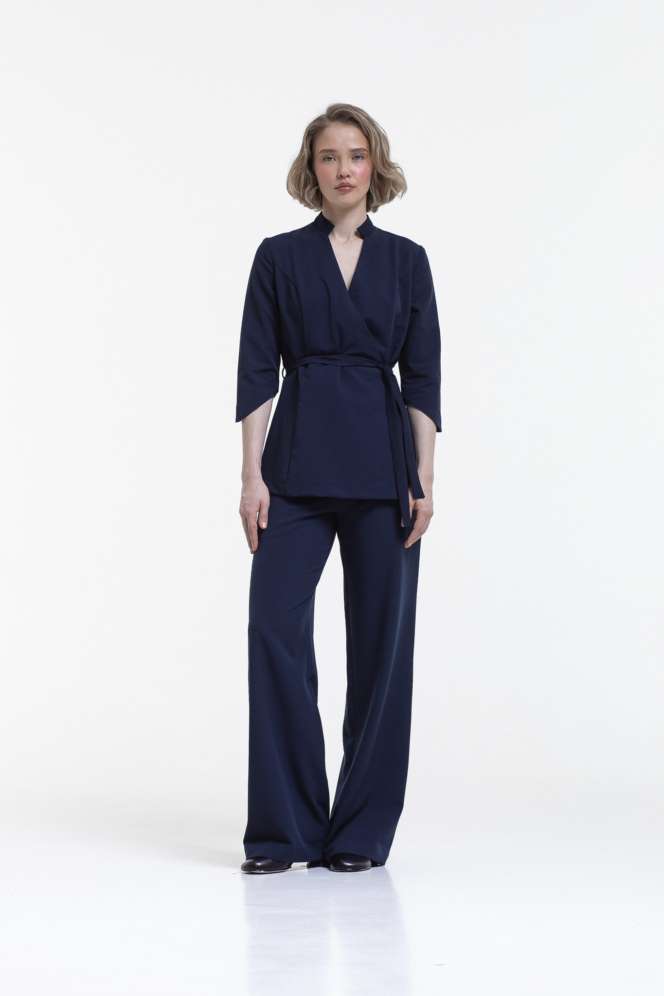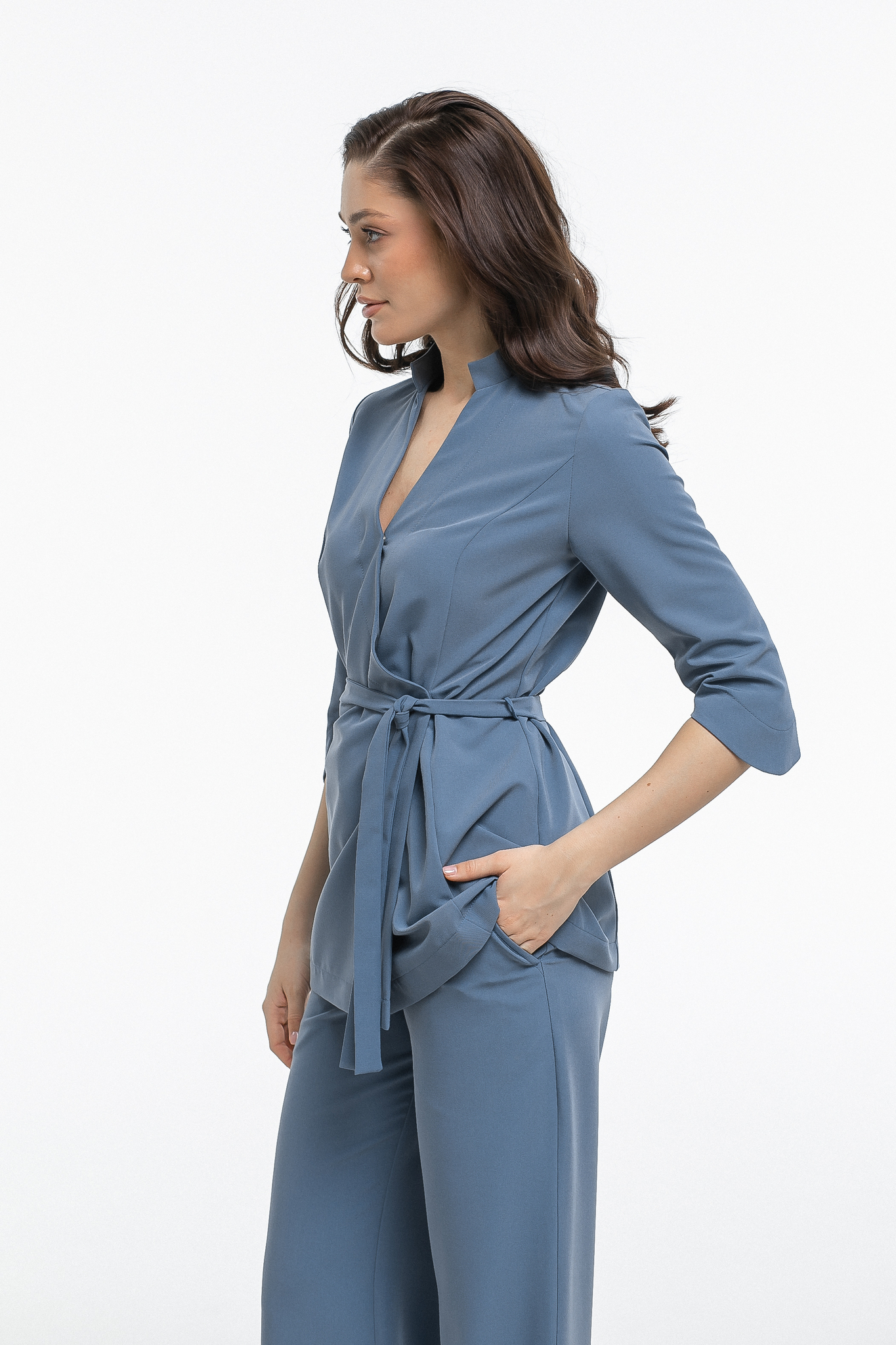 Две кнопки на изделии надежно фиксируют ткань в зоне декольте, а внутренняя завязка и пояс позволяют отрегулировать размер под обхват вашей талии. Комфортная длина рукава обеспечивает свободу движений и не вызывает дискомфорта при работе. Ткань отлично тянется, что делает блузу удобной даже при интенсивной деятельности.