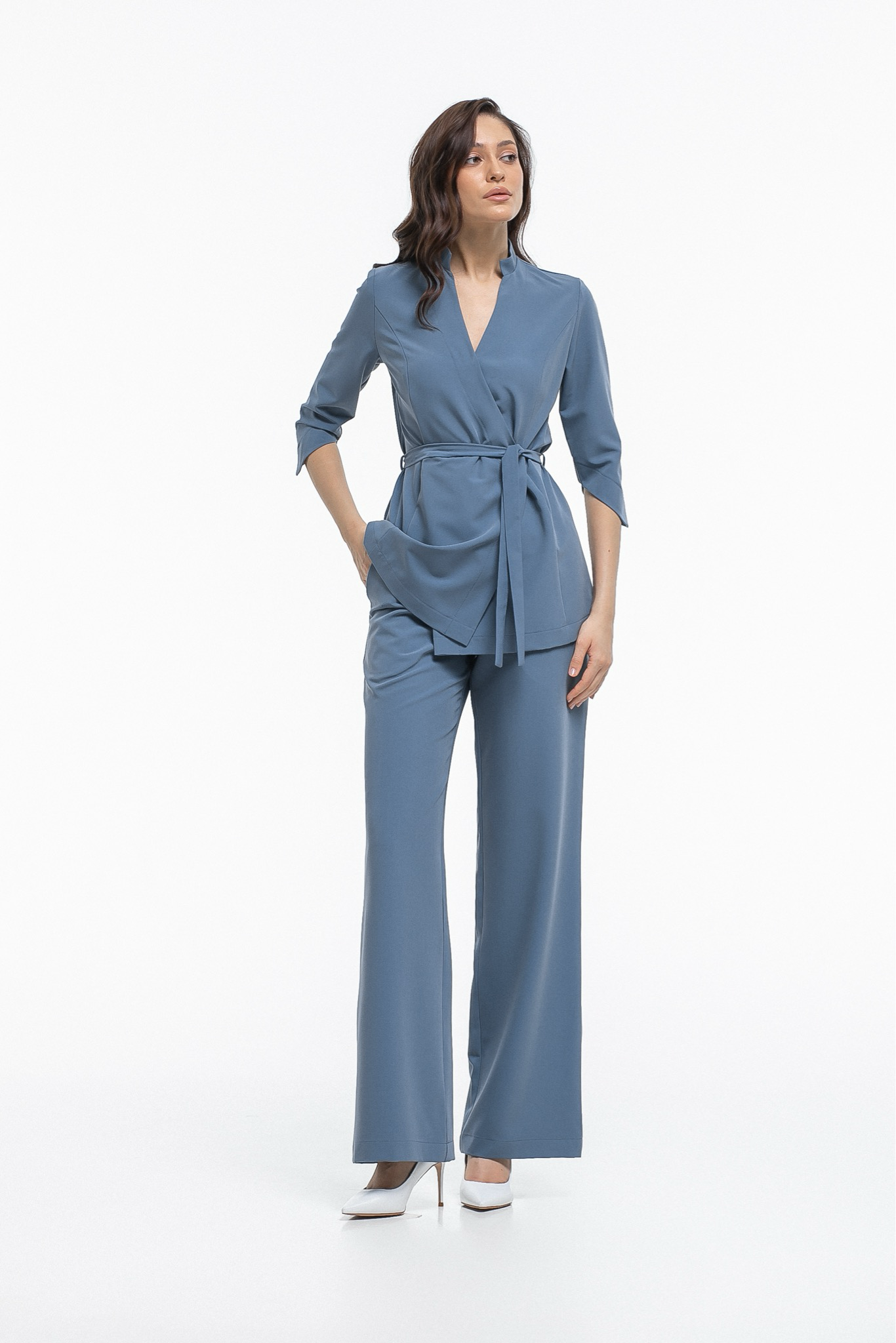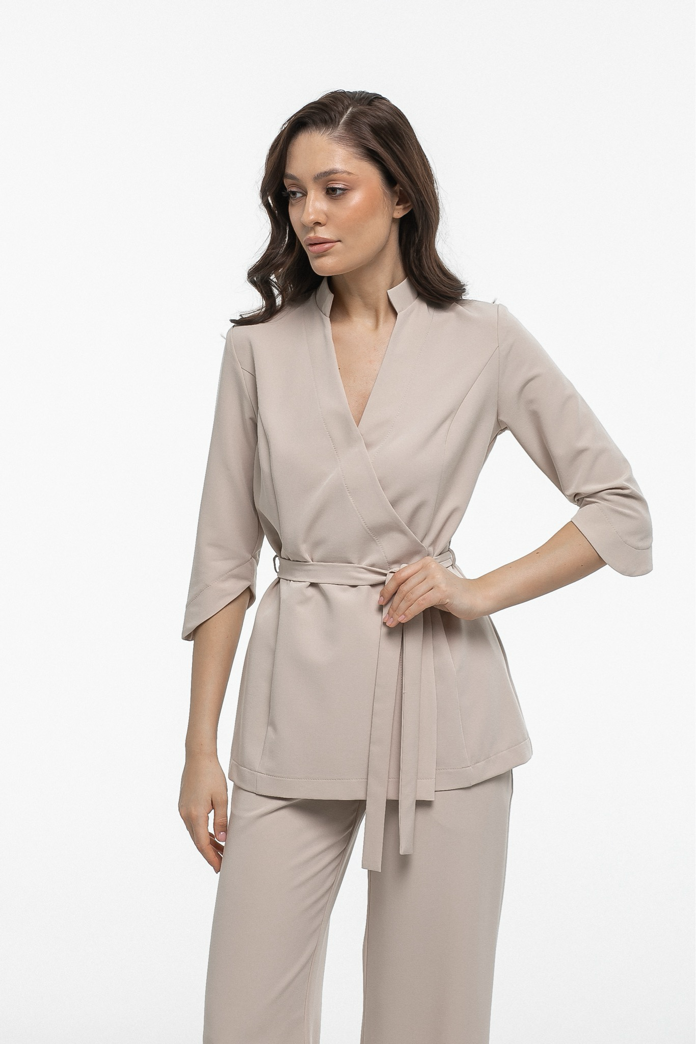 Две кнопки на изделии надежно фиксируют ткань в зоне декольте, а внутренняя завязка и пояс позволяют отрегулировать размер под обхват вашей талии. Комфортная длина рукава обеспечивает свободу движений и не вызывает дискомфорта при работе. Ткань отлично тянется, что делает блузу удобной даже при интенсивной деятельности.
