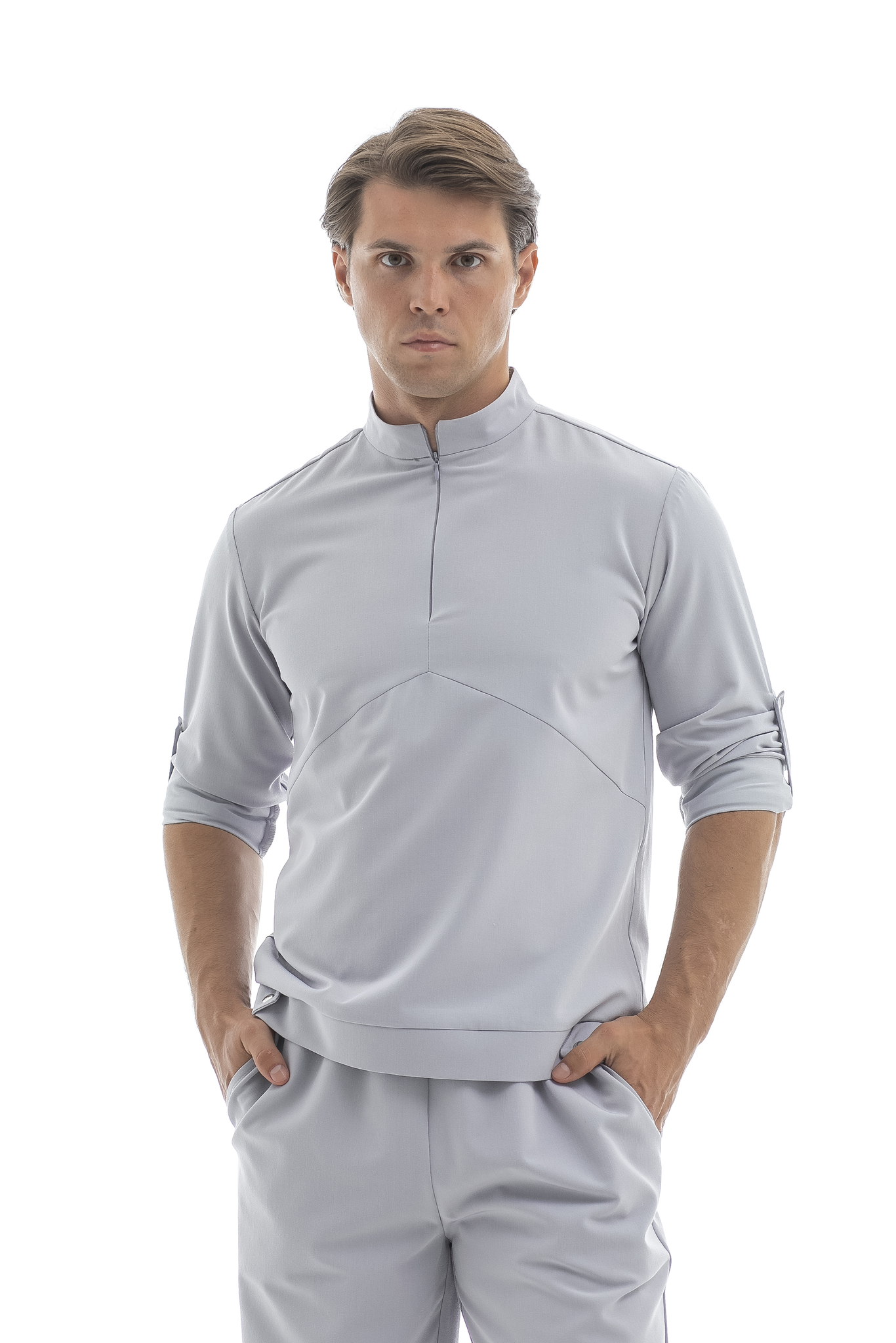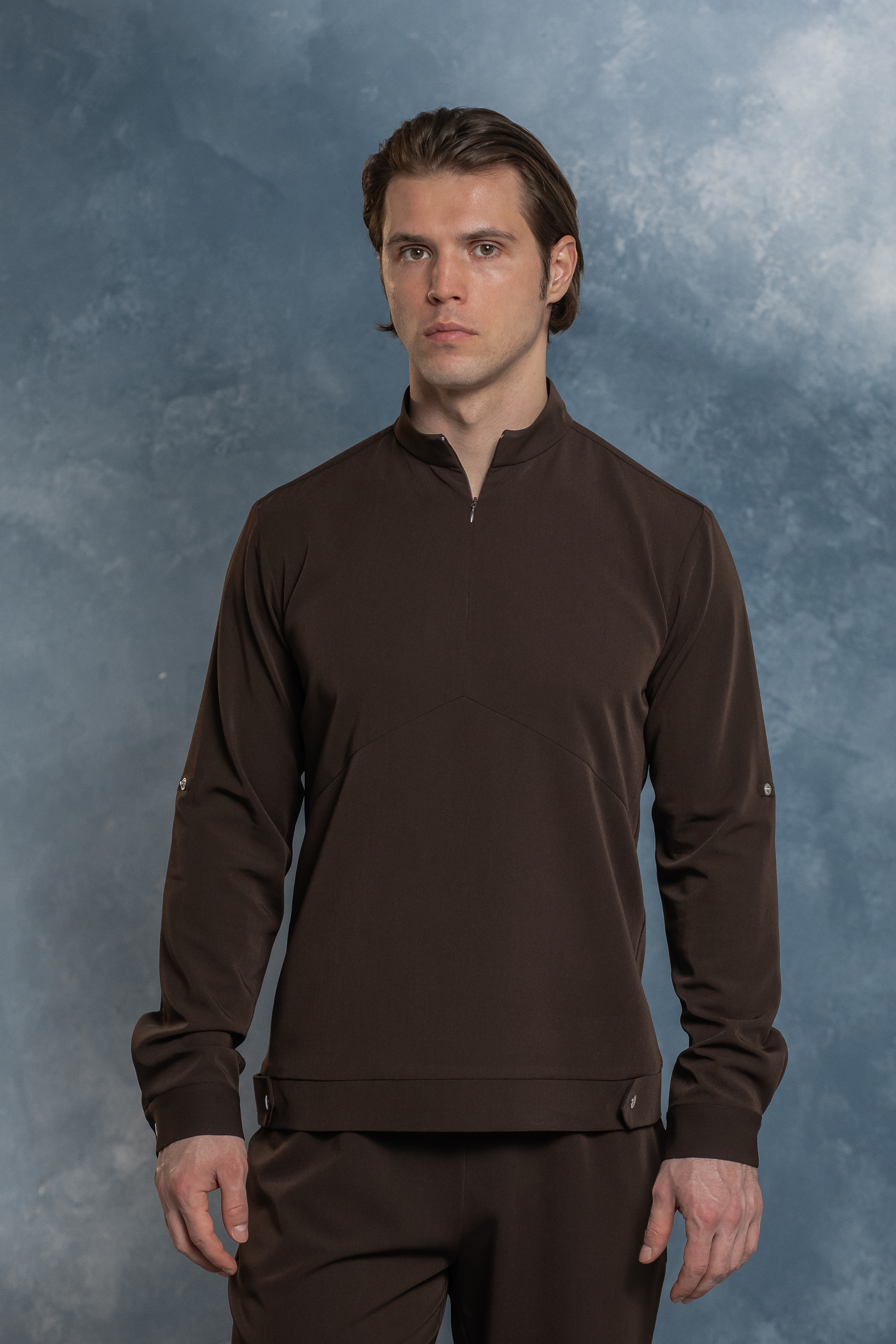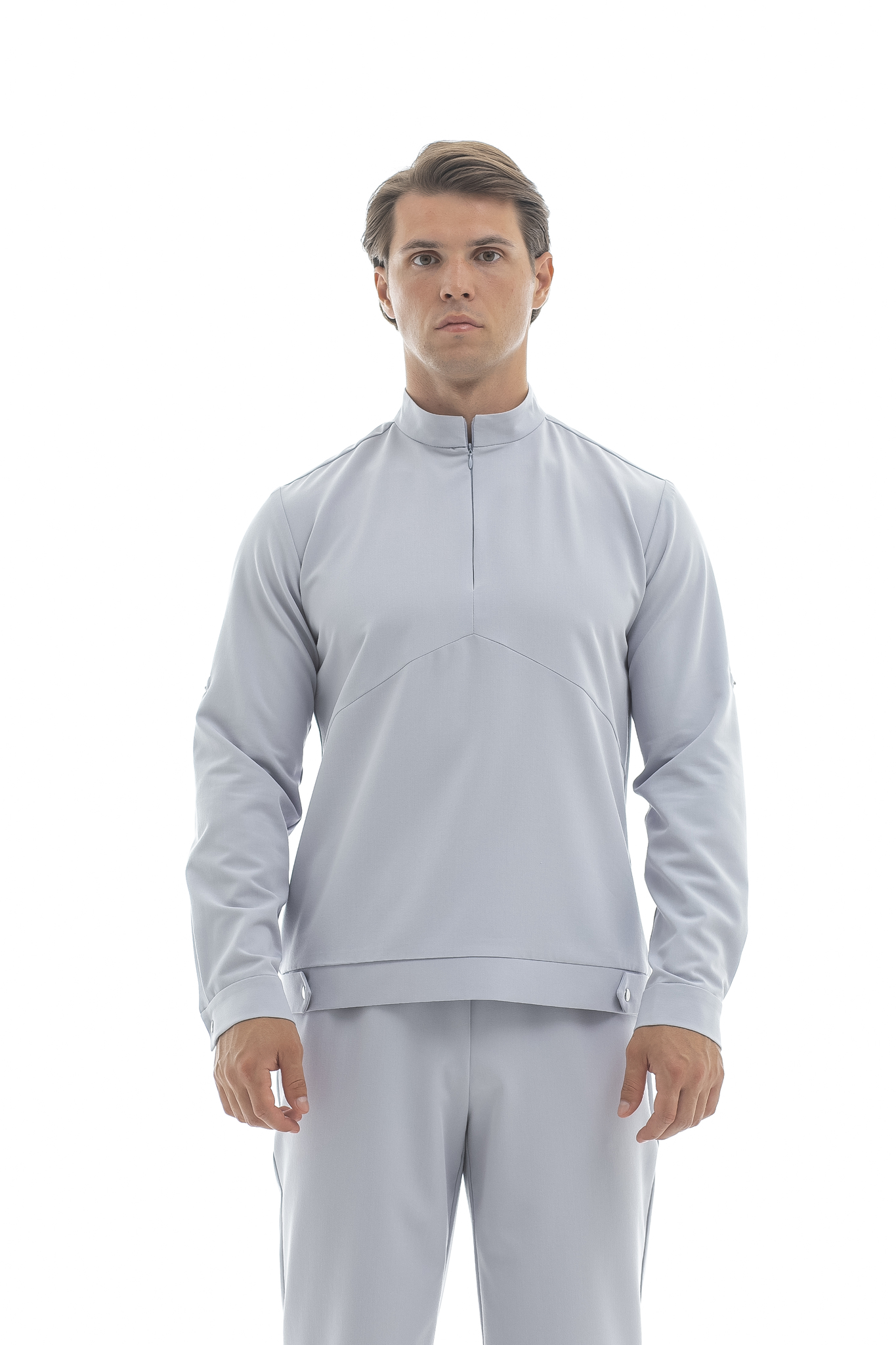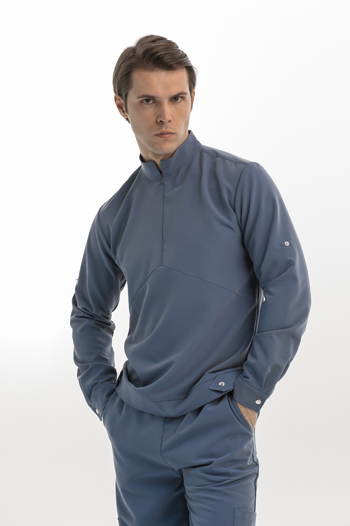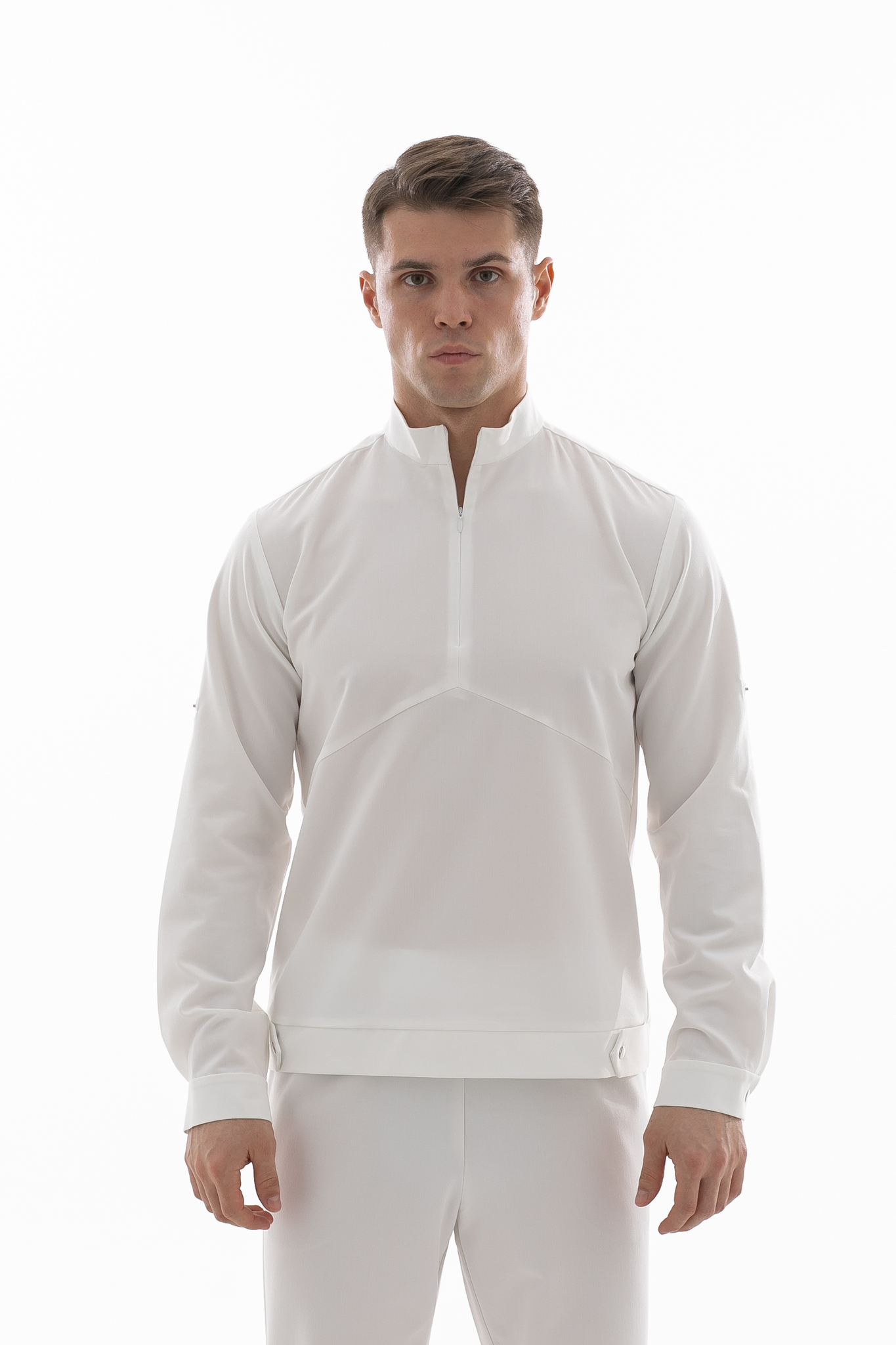 Свободная блуза в стиле оверсайз для максимального комфорта. Удобная горловина с молнией позволяет регулировать посадку, а рукава с кнопками можно закатать. Универсальная модель, которая легко сочетается с брюками Balance и джоггерами. Идеальная основа для расслабленного рабочего образа.