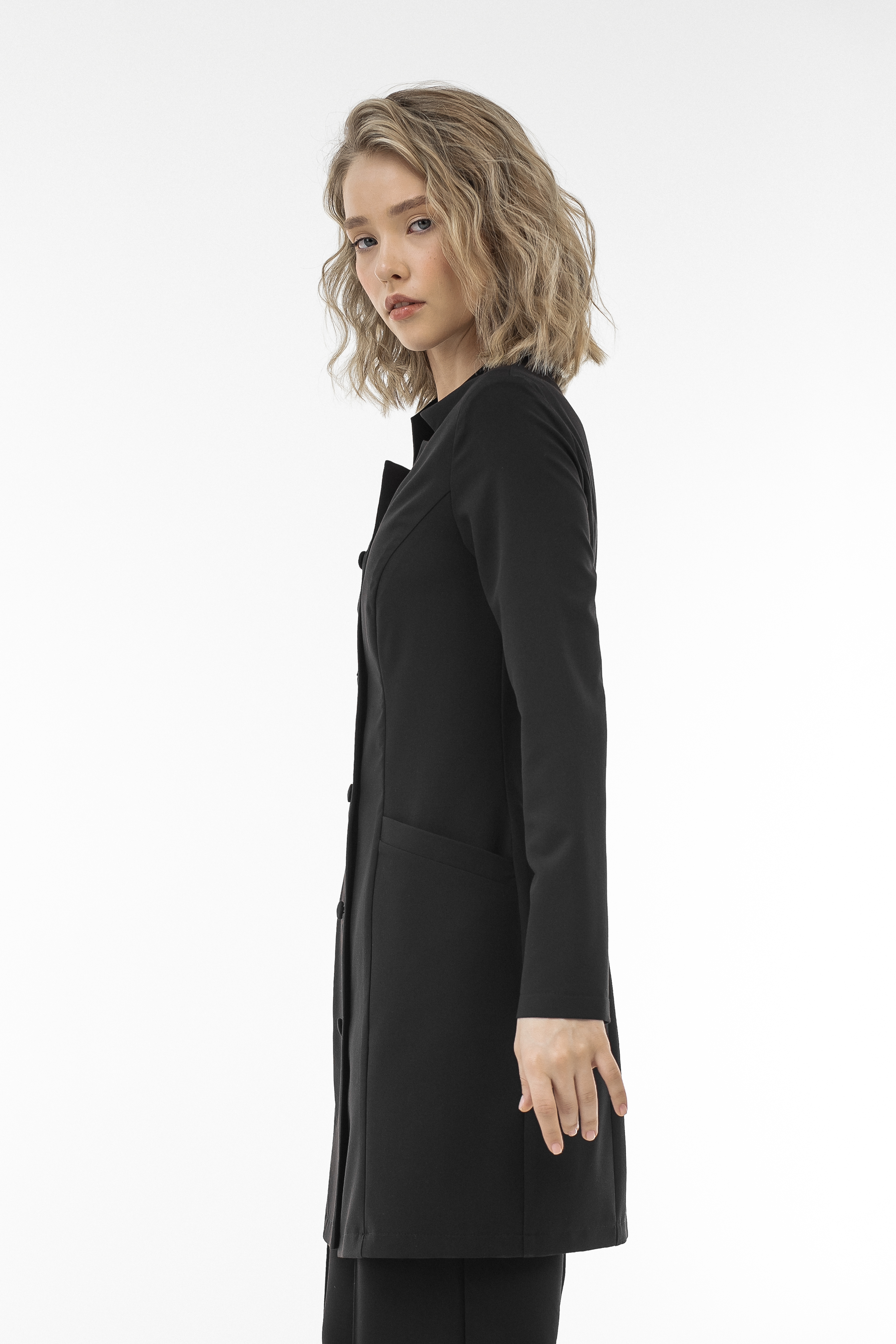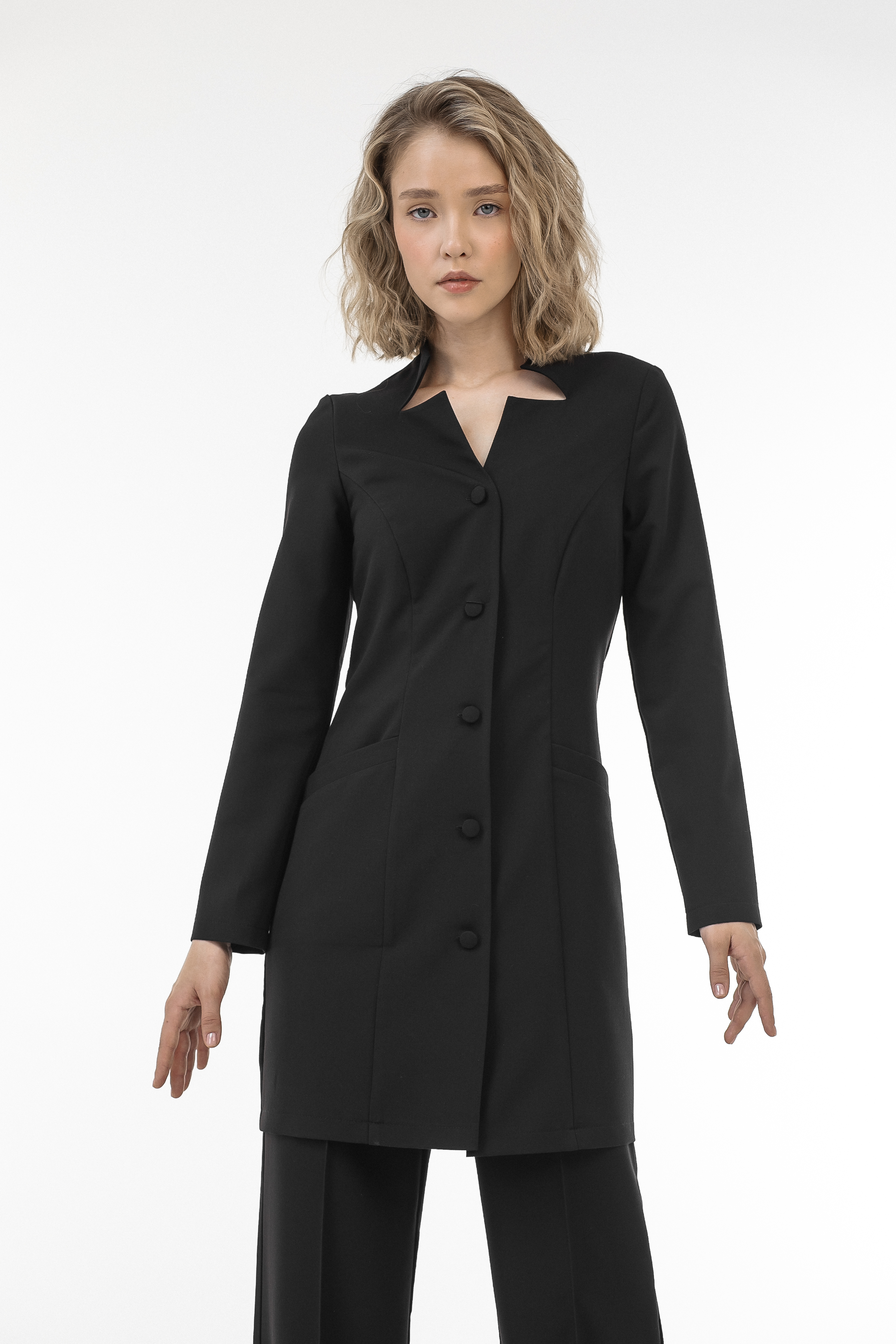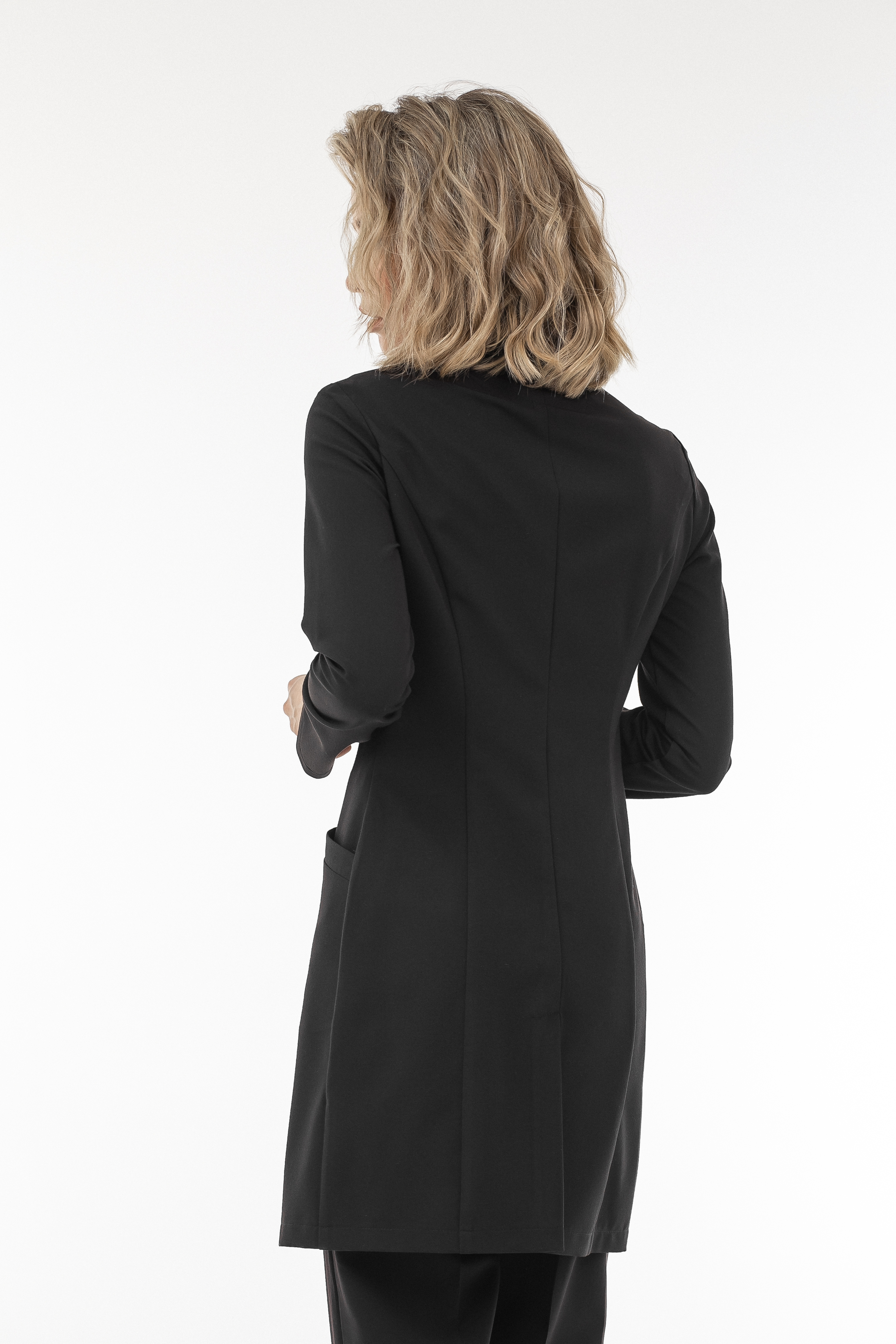Халат «Лили» с фигурным вырезом — элегантная приталенная модель с акцентом на аккуратный силуэт. Воротник-стойка с фигурным вырезом и однобортная застёжка подчёркивают женственный дизайн, а длинные рукава делают халат удобным для повседневной работы.