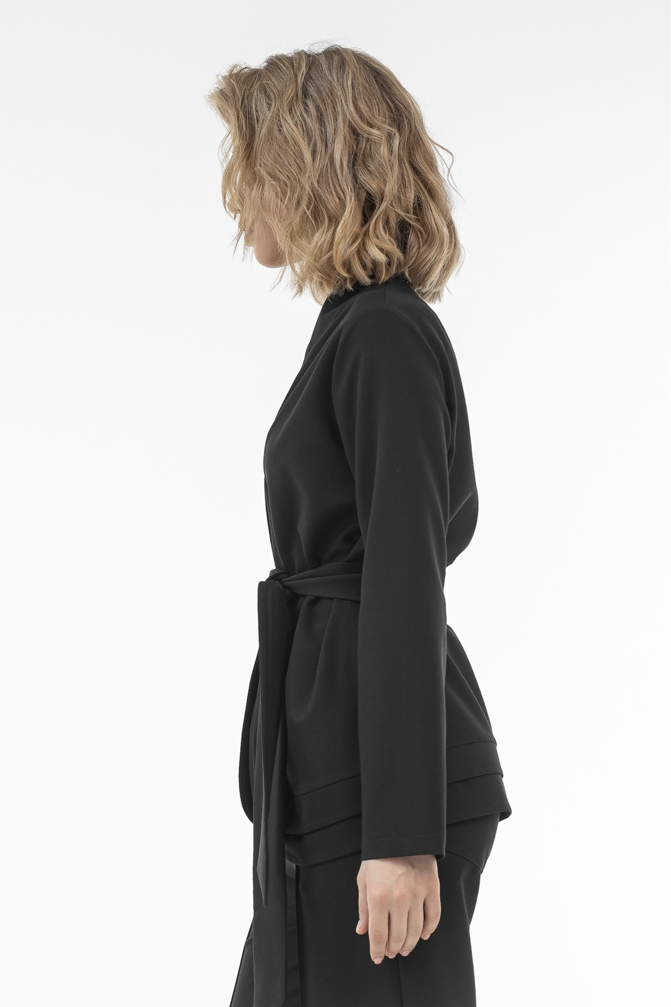 Утонченное кимоно с прямым кроем и длинными рукавами для особых случаев. Воротник-стойка с треугольным вырезом и декоративный пояс создают строгий и элегантный вид. Удобная фиксация на скрытых кнопках обеспечивает аккуратный внешний вид. Прекрасно дополняет образы с брюками клеш и со стрелками.