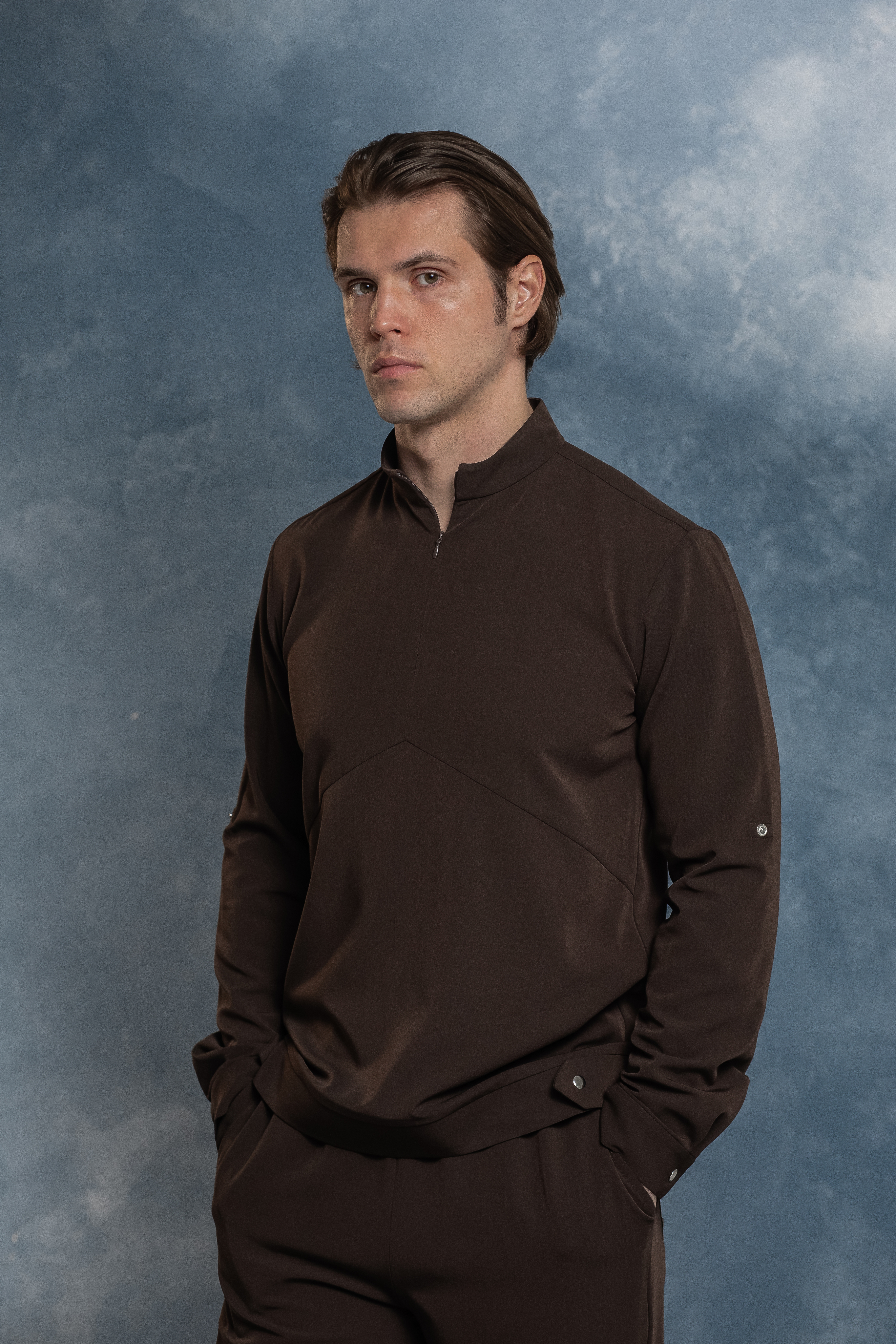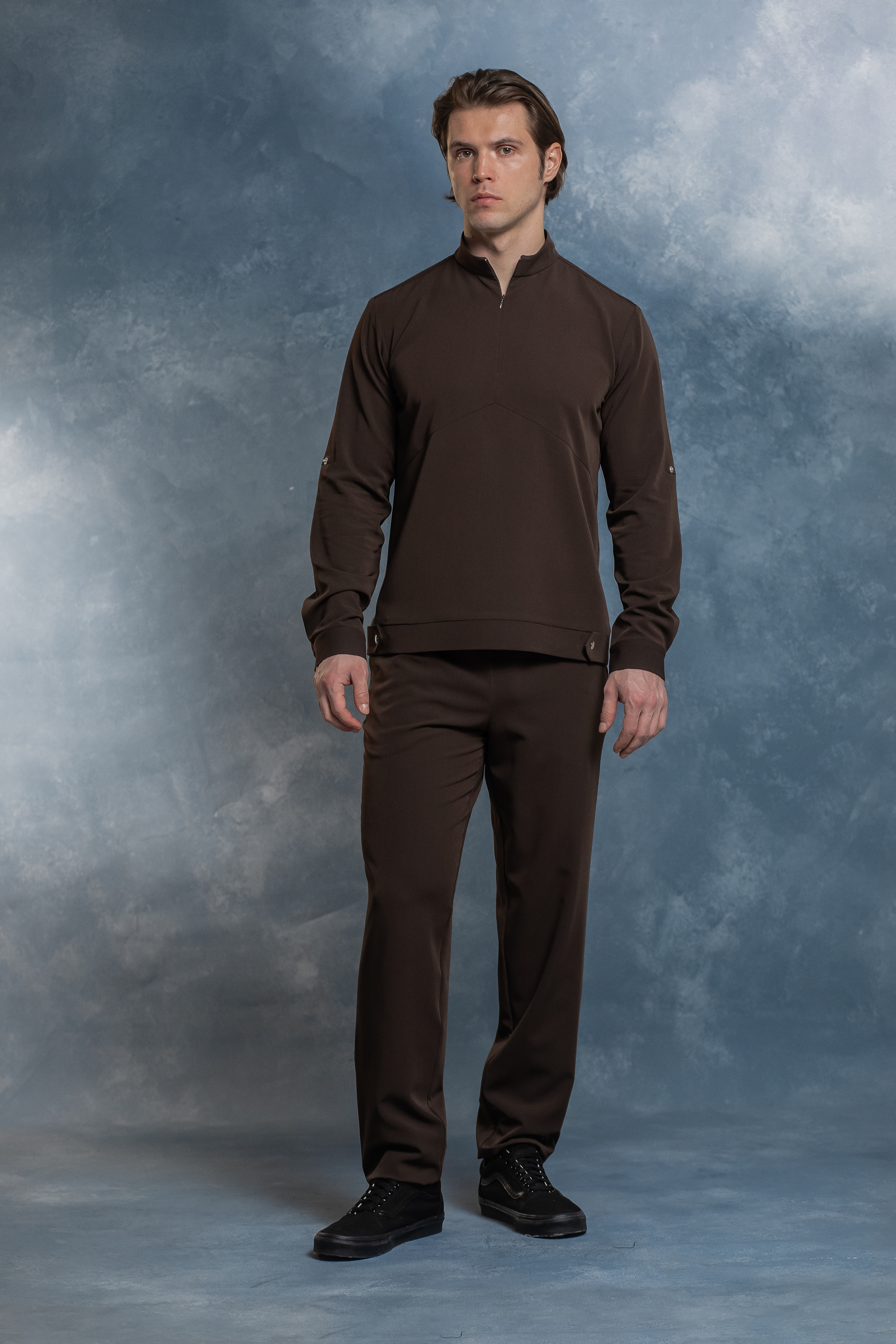 Удобная горловина блузы обеспечивает комфорт, не давит на шею, а молния позволяет подстроить прилегание горловины под ваши предпочтения. При необходимости рукава можно закатать и зафиксировать кнопками, что добавляет функциональности.
