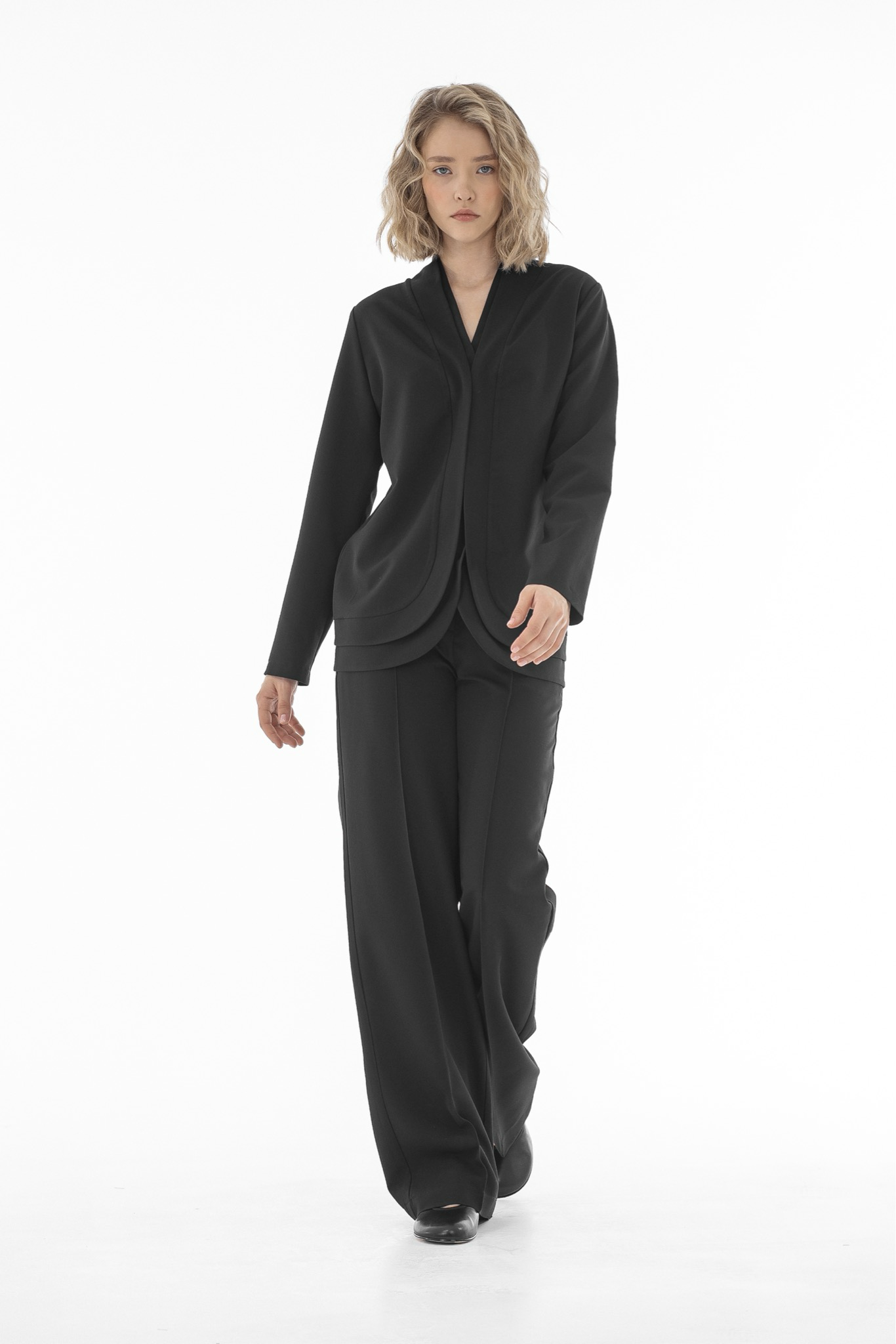 Классические брюки прямого кроя с прошитыми стрелками идеально дополняют кимоно. Застежка спереди выполнена в виде гульфика и молнии, а на задней части изделия предусмотрена резинка для комфортной посадки на талии. Для хранения рабочих мелочей брюки оснащены четырьмя карманами: двумя внутренними спереди и двумя накладными сзади.
