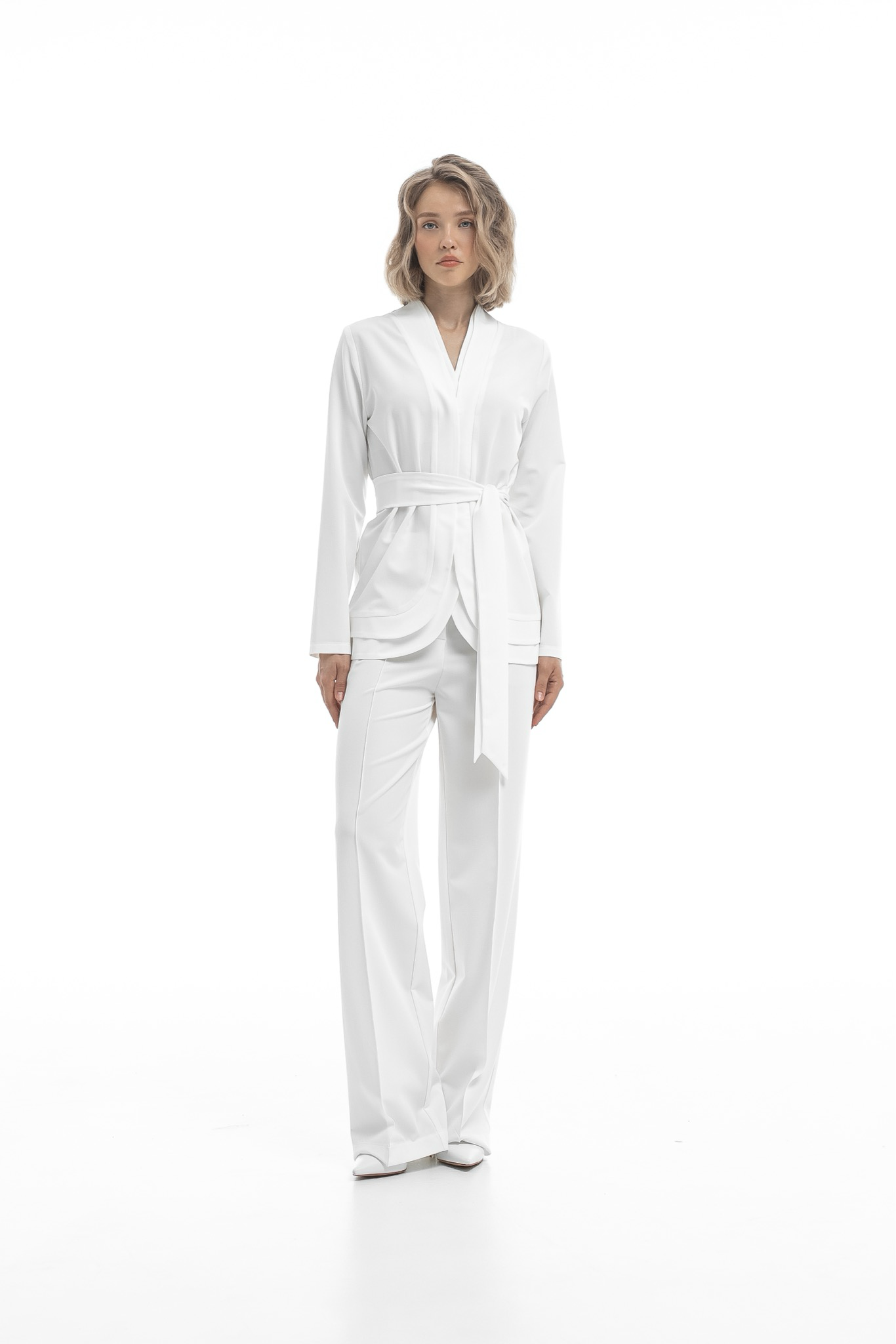 Кимоно это утонченное изделие со сложным кроем, длинными рукавами и двумя вариантами посадки. Воротник-стойка с треугольным вырезом и двойной отлитной борт придают изделию строгий и элегантный внешний вид. Кимоно прямого кроя, поэтому в комплекте к нему предусмотрен декоративный широкий пояс, который выделит зону талии и добавит акцент. Для удобства кимоно фиксируется кнопками, спрятанными под бортом.