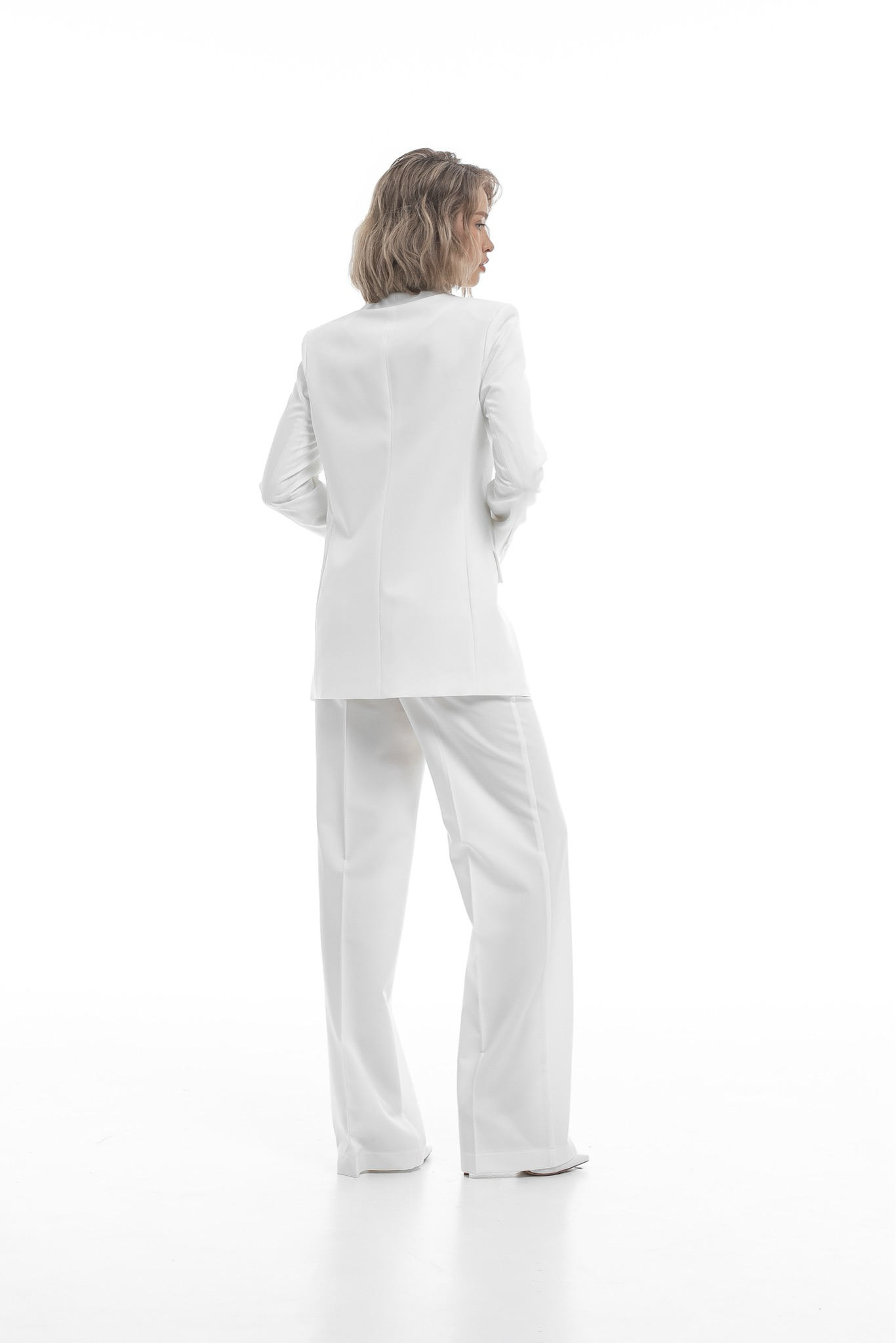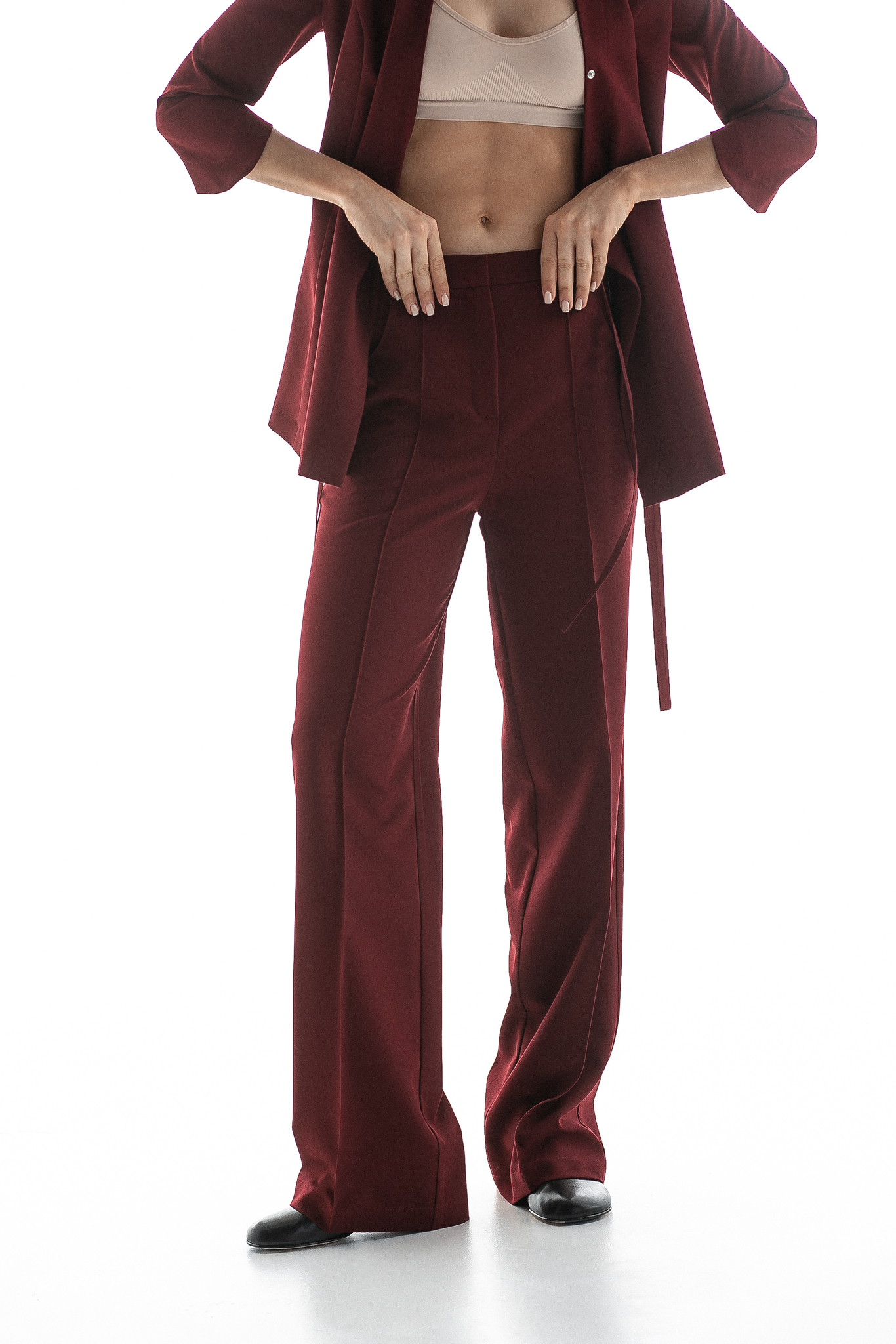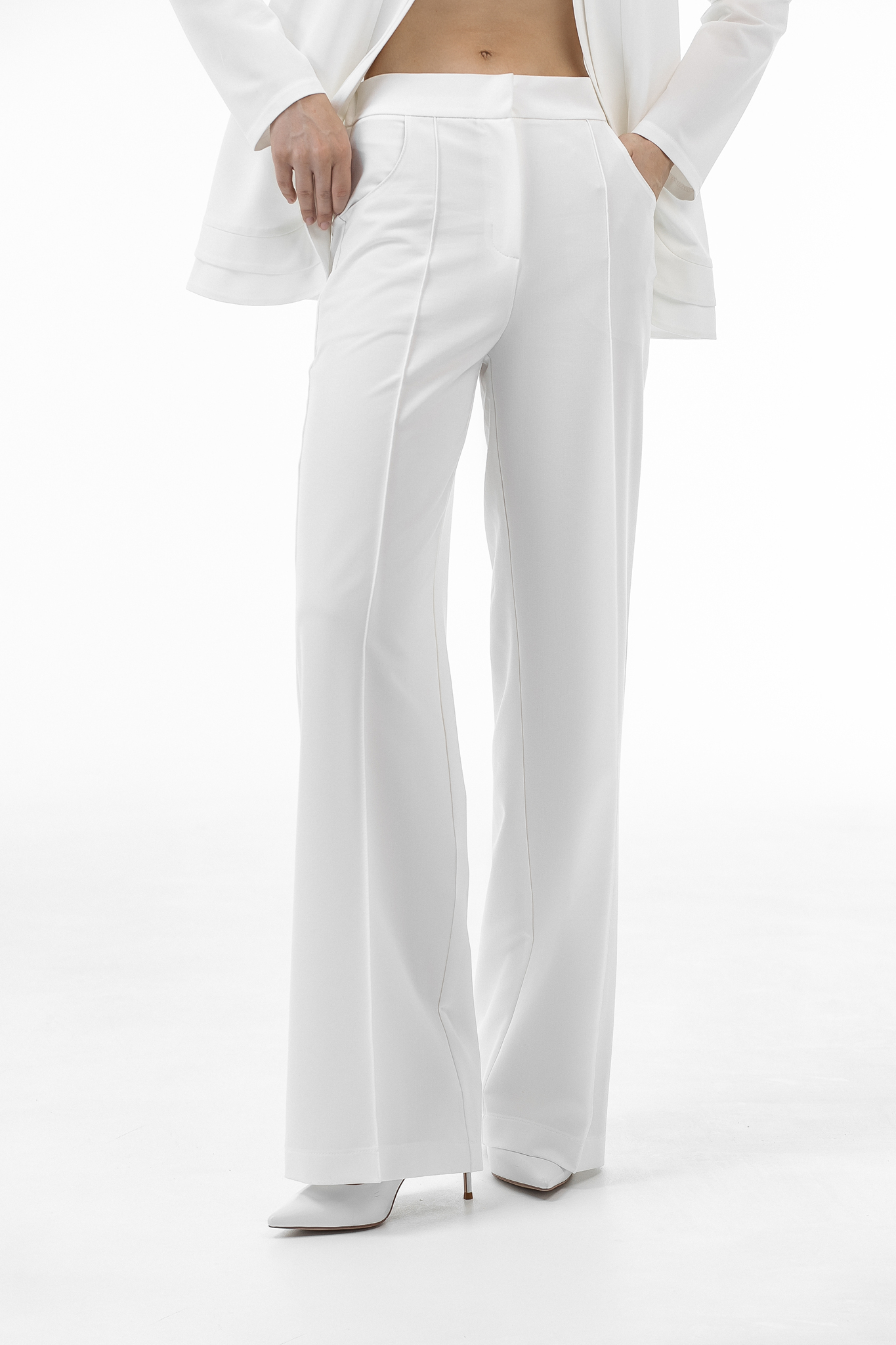 Классические брюки прямого кроя с прошитыми стрелками. Застежка спереди выполнена в виде гульфика и молнии, на задней части изделия предусмотрена резинка для комфортной посадки на талии. Для рабочих мелочей на брюках есть 4 кармана: 2 внутренних спереди и 2 накладных сзади.