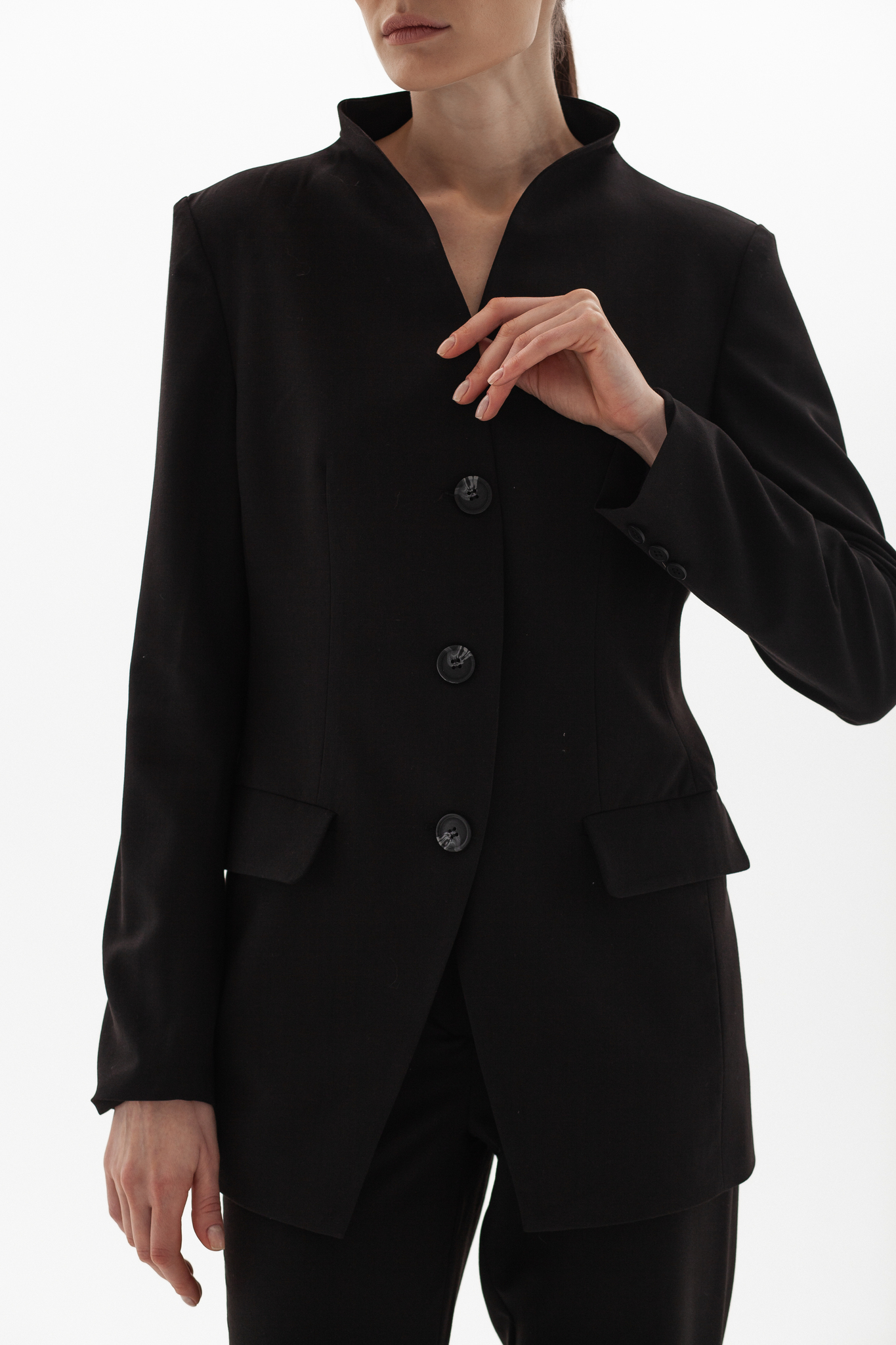 Однобортный приталенный жакет с воротником-стойкой и интересным разрезом в нижней части бортов. Функционал, как и внешний вид, продуман до мелочей - 2 вместительных кармана для необходимых вещей, правильная длина, удобная застежка на 3 пуговицы и комфортная для работы посадка.