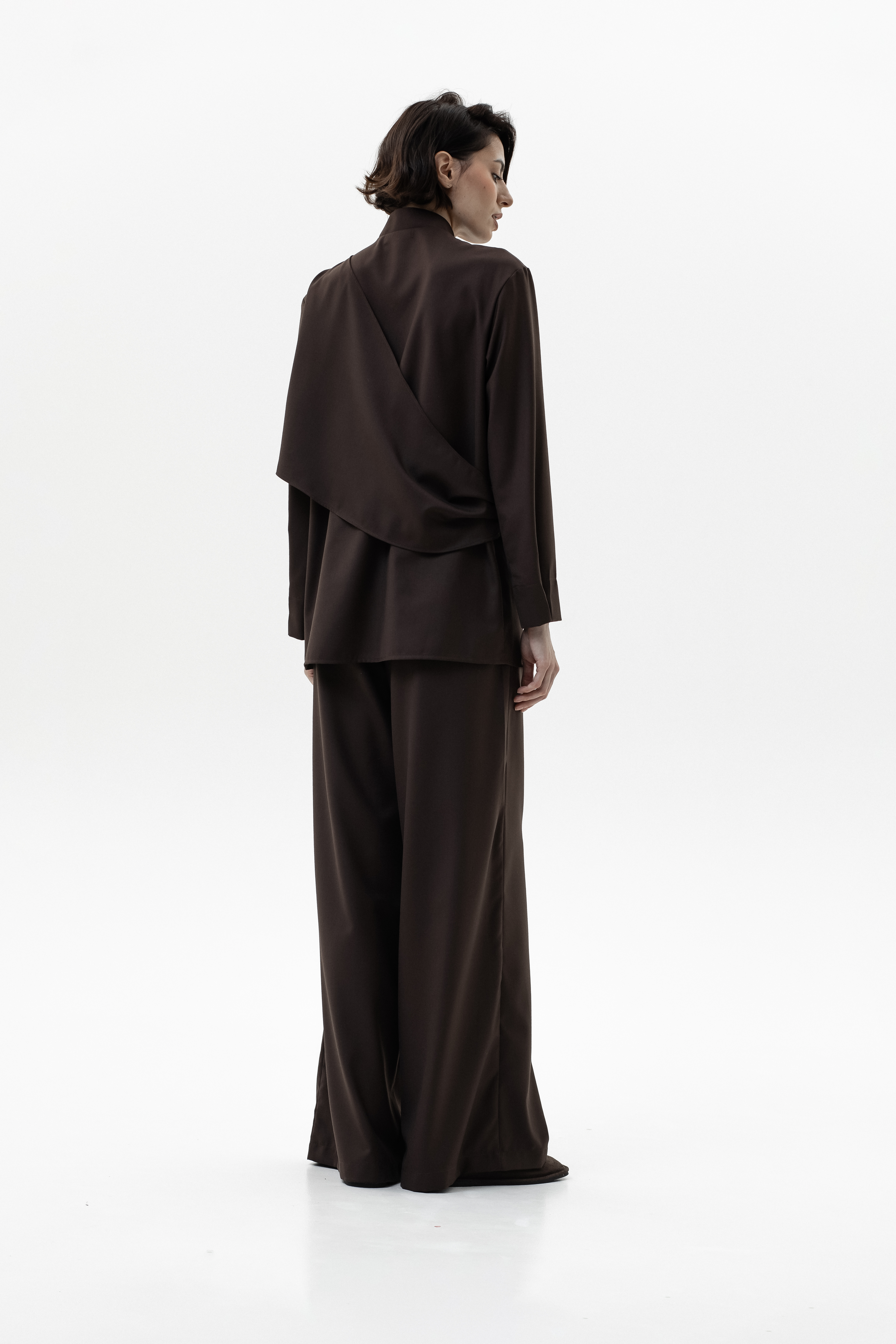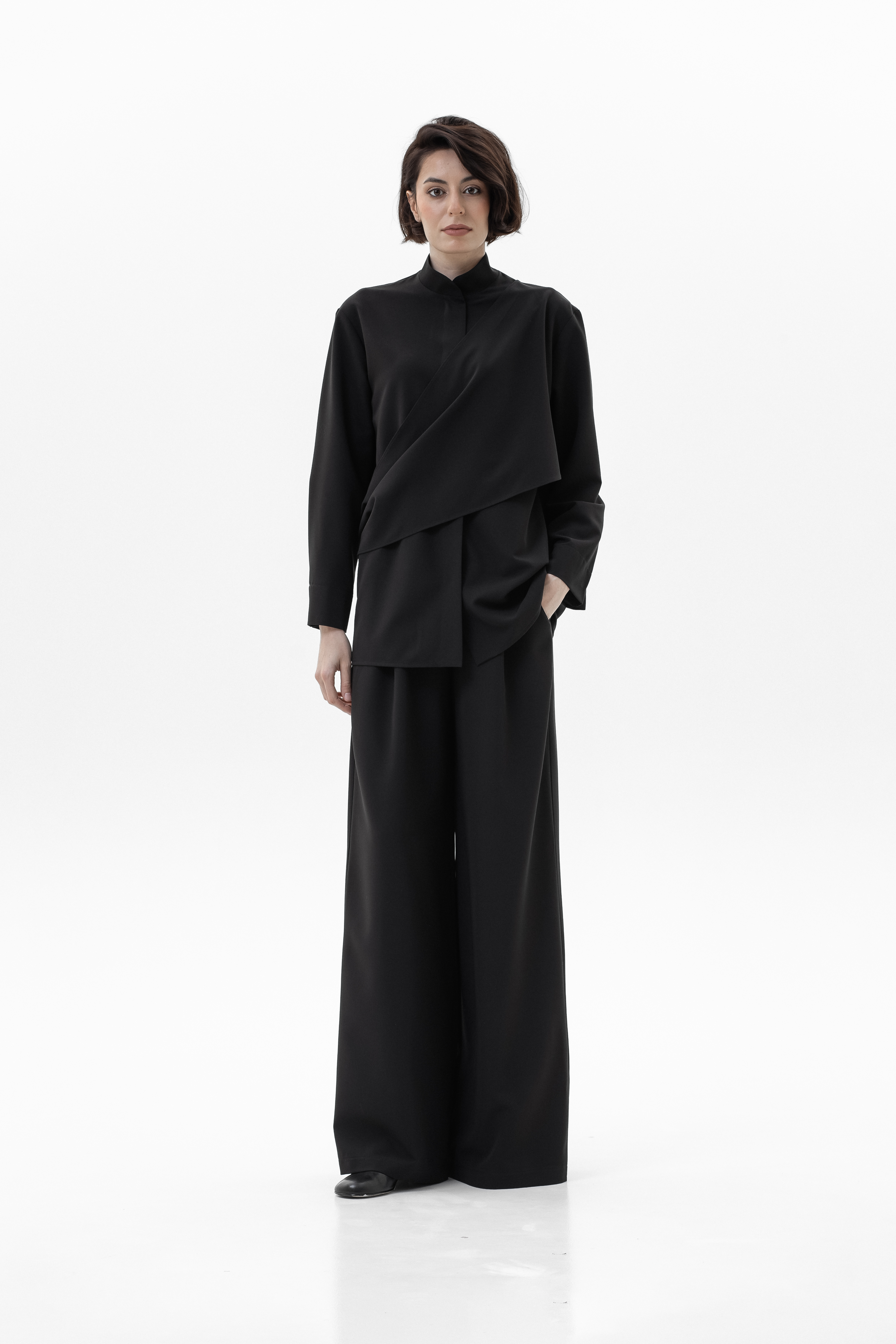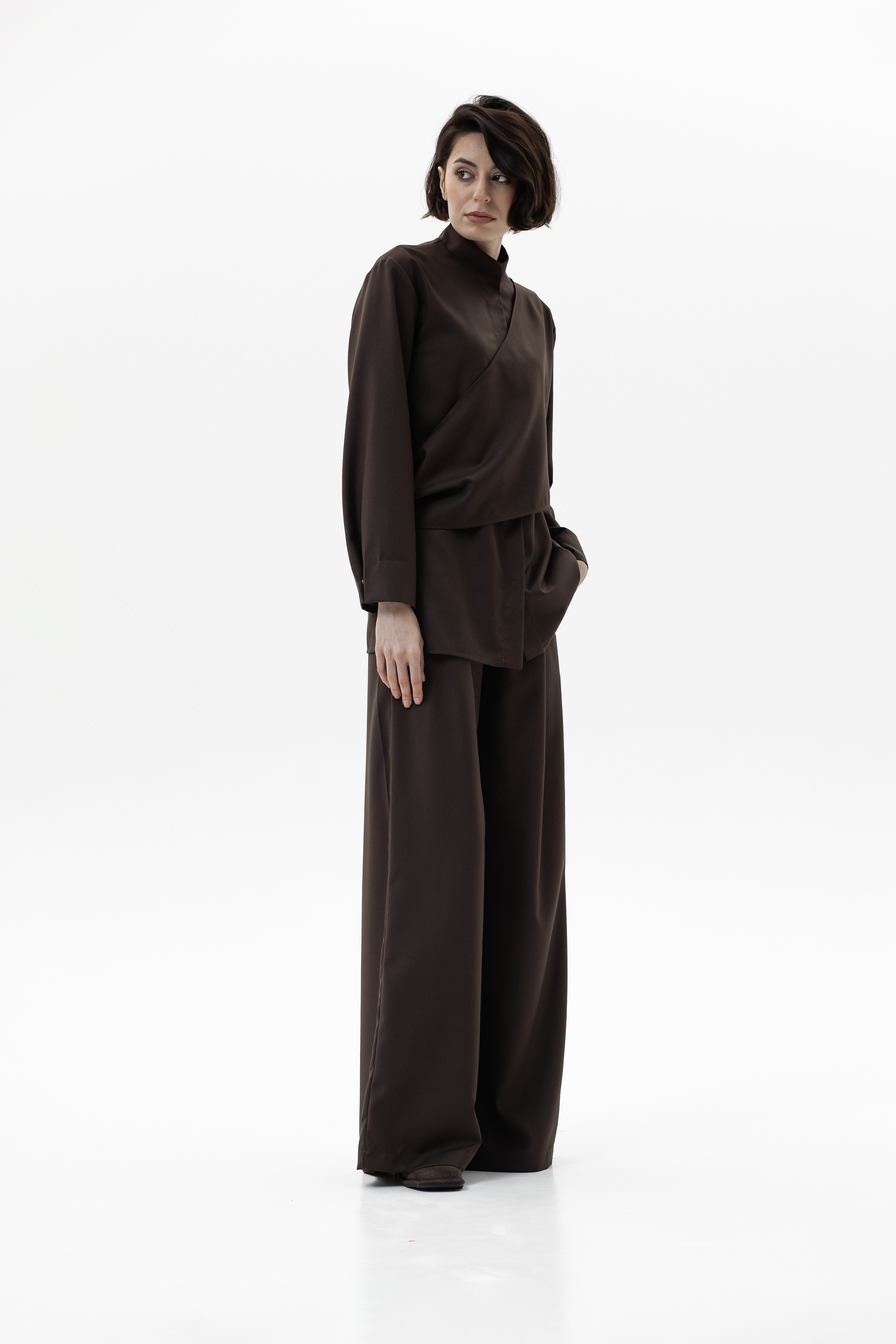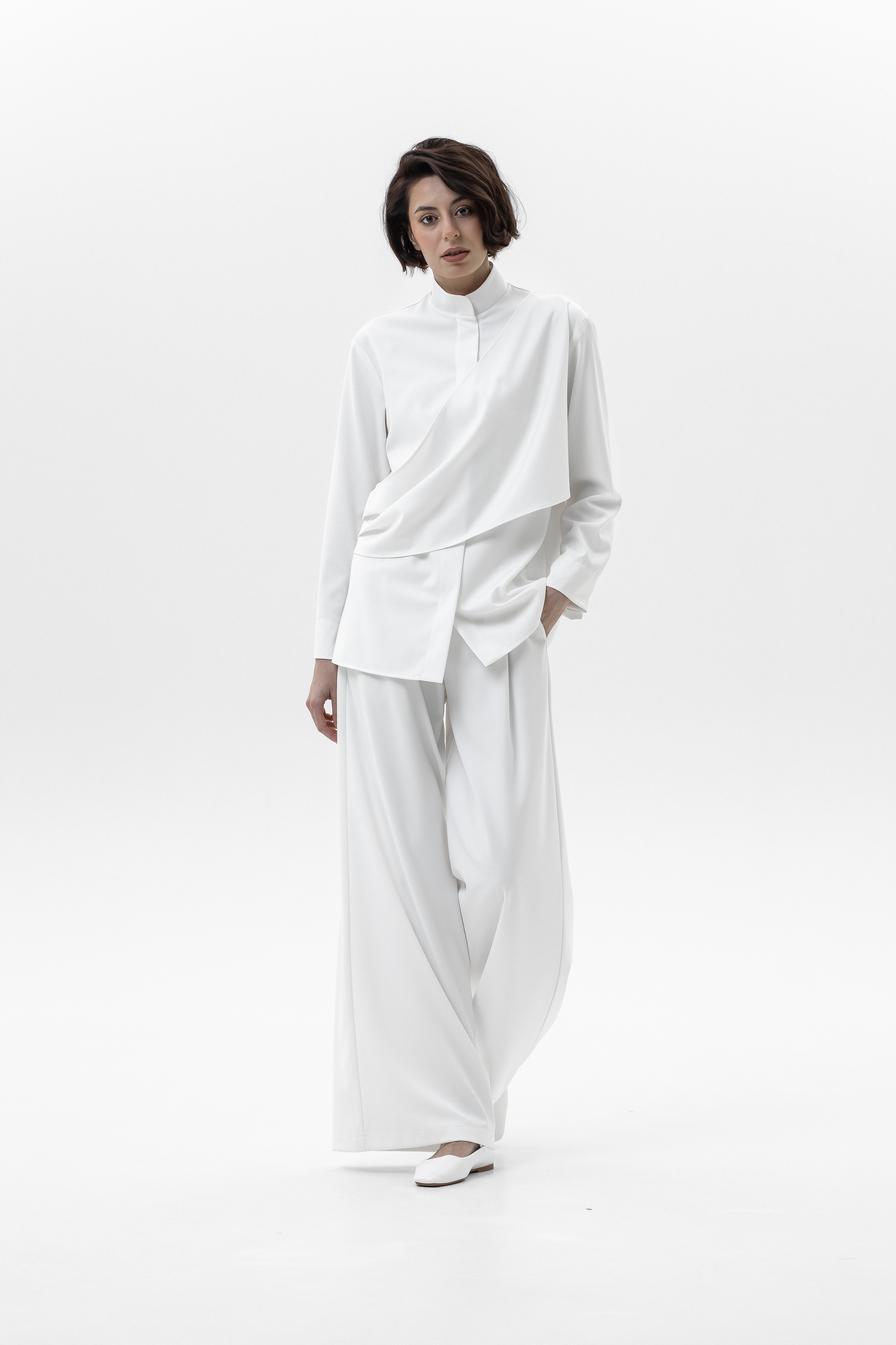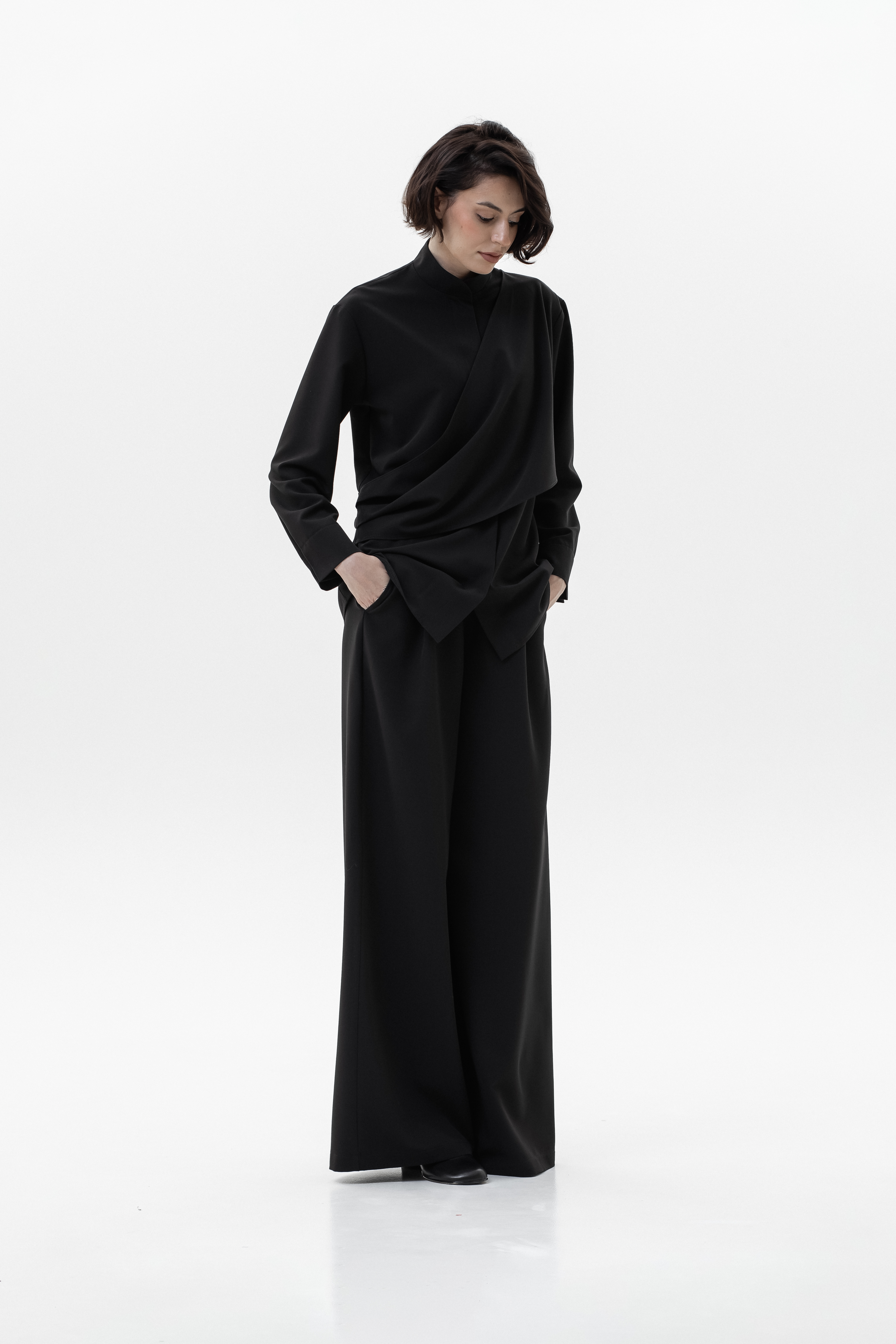 Элегантный и комфортный комплект, сочетающий блузу Mirage и брюки-палаццо, создан для стильных и уверенных в себе женщин. Блуза из мягкой, дышащей ткани с шелковистой текстурой и декоративной драпировкой спереди и на спинке подчеркивает изящный силуэт, а воротник-стойка и практичная застежка на кнопках добавляют строгости и функциональности. Рукава регулируются кнопками для идеальной посадки. Брюки-палаццо из поливискозы с широким кроем обеспечивают свободу движений и комфорт в течение всего дня. Пояс на резинке со шнурком и врезные карманы делают образ удобным и практичным, сохраняя при этом элегантность.