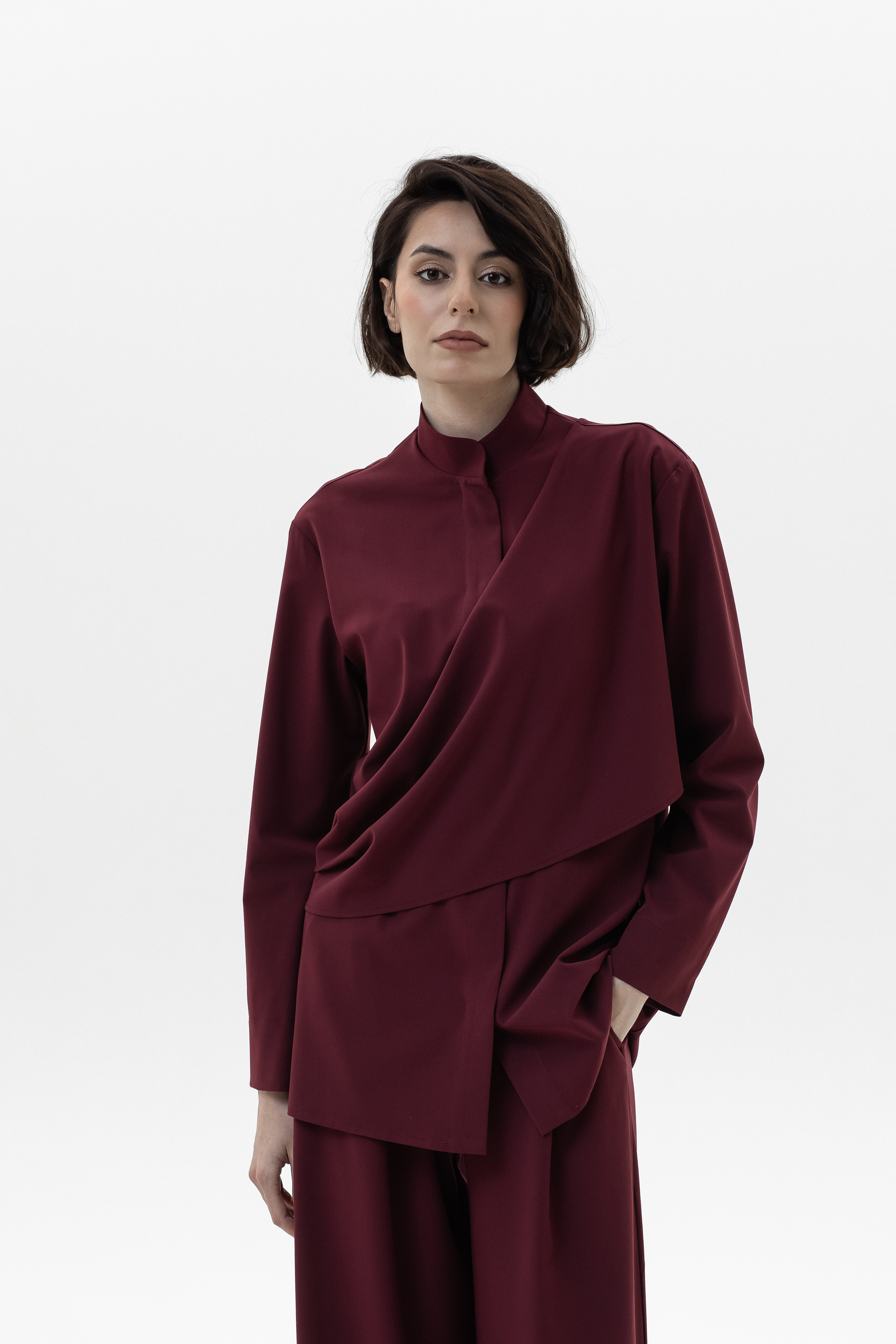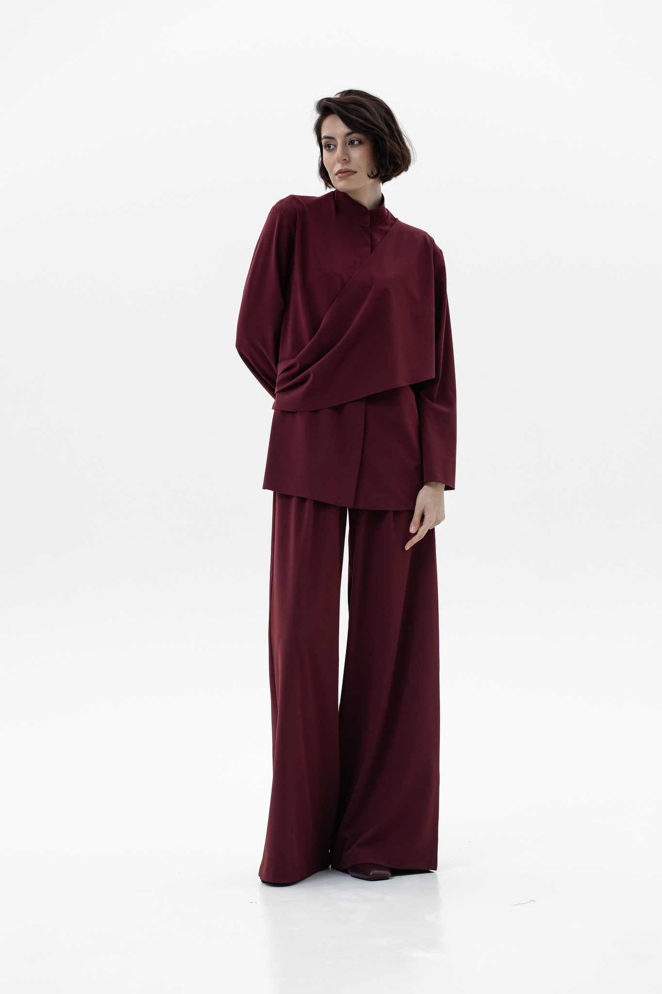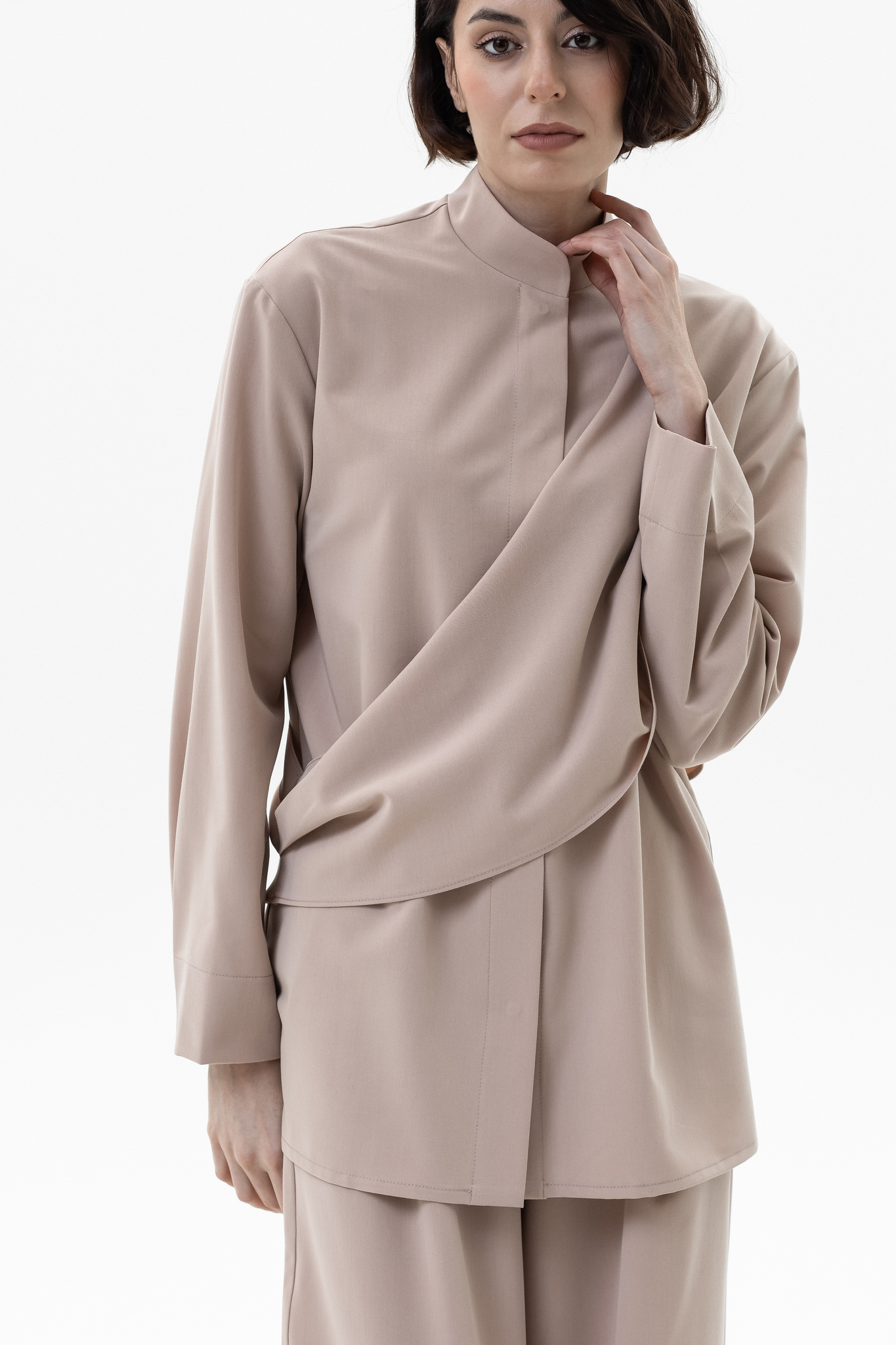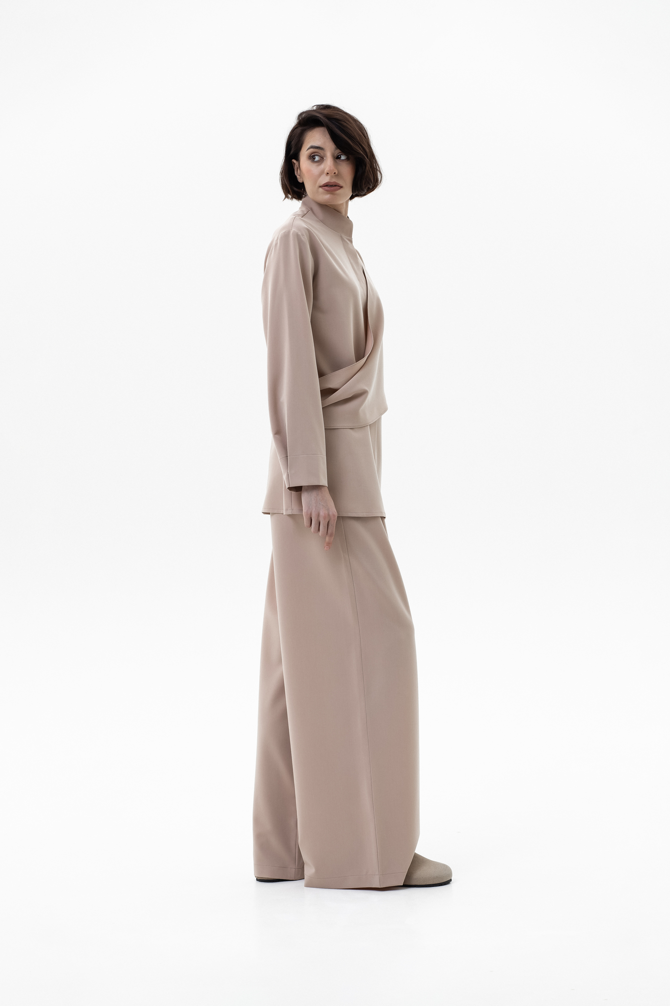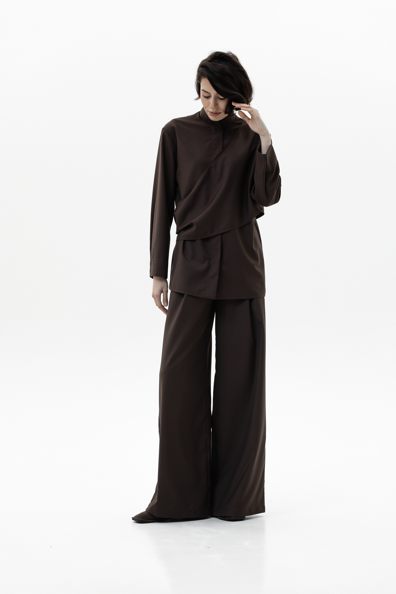 Элегантный и комфортный комплект, сочетающий блузу Mirage и брюки-палаццо, создан для стильных и уверенных в себе женщин. Блуза из мягкой, дышащей ткани с шелковистой текстурой и декоративной драпировкой спереди и на спинке подчеркивает изящный силуэт, а воротник-стойка и практичная застежка на кнопках добавляют строгости и функциональности. Рукава регулируются кнопками для идеальной посадки. Брюки-палаццо из поливискозы с широким кроем обеспечивают свободу движений и комфорт в течение всего дня. Пояс на резинке со шнурком и врезные карманы делают образ удобным и практичным, сохраняя при этом элегантность.