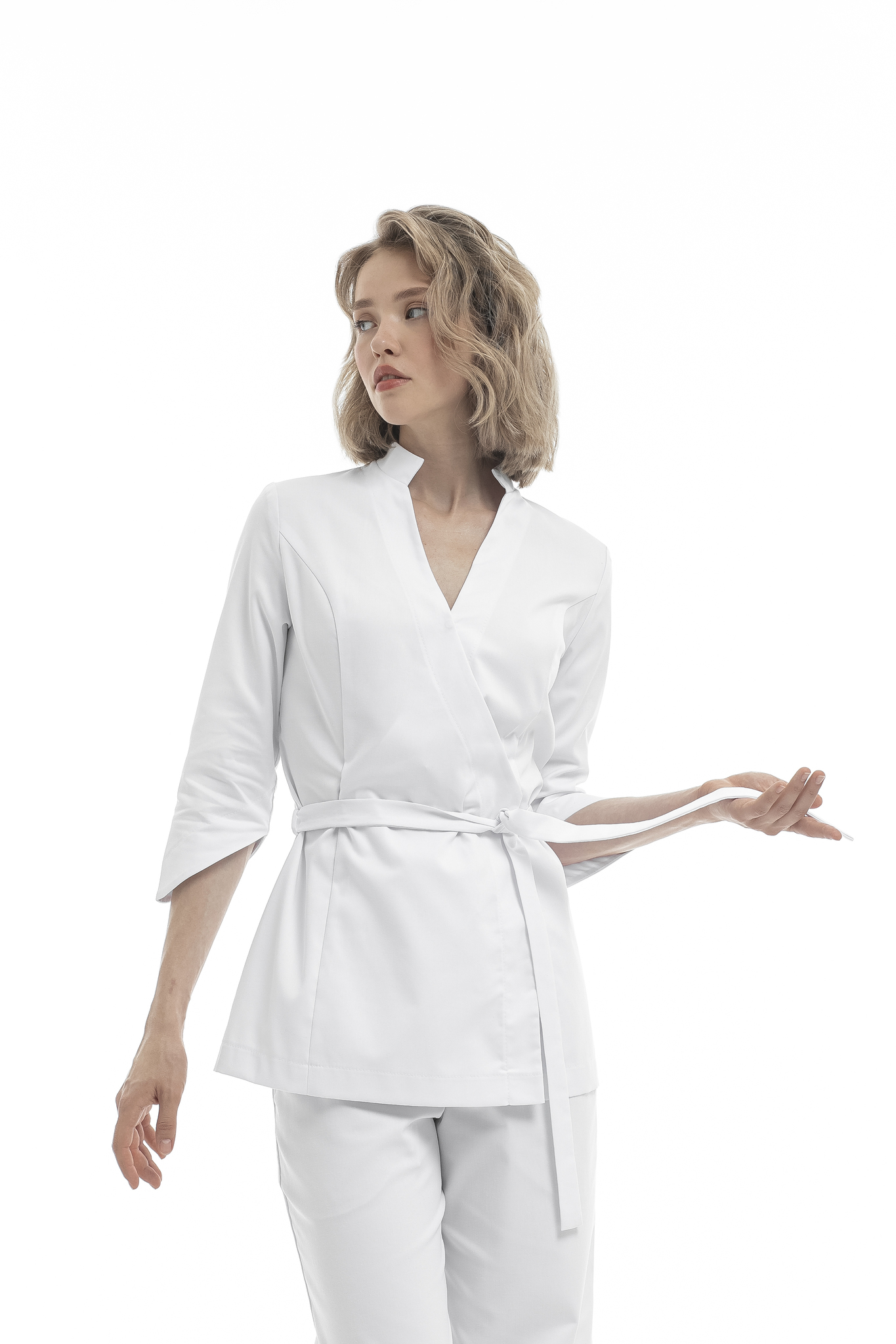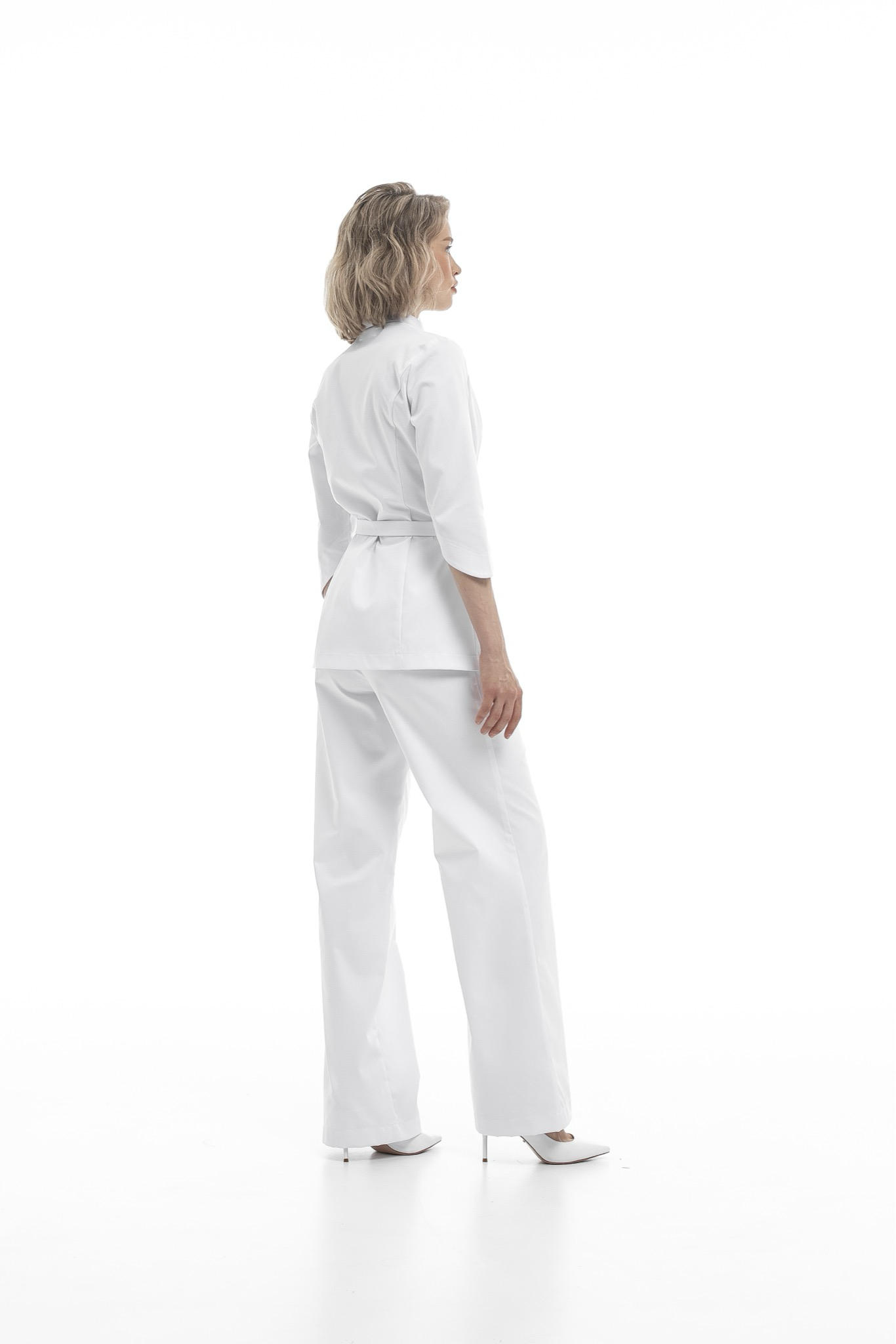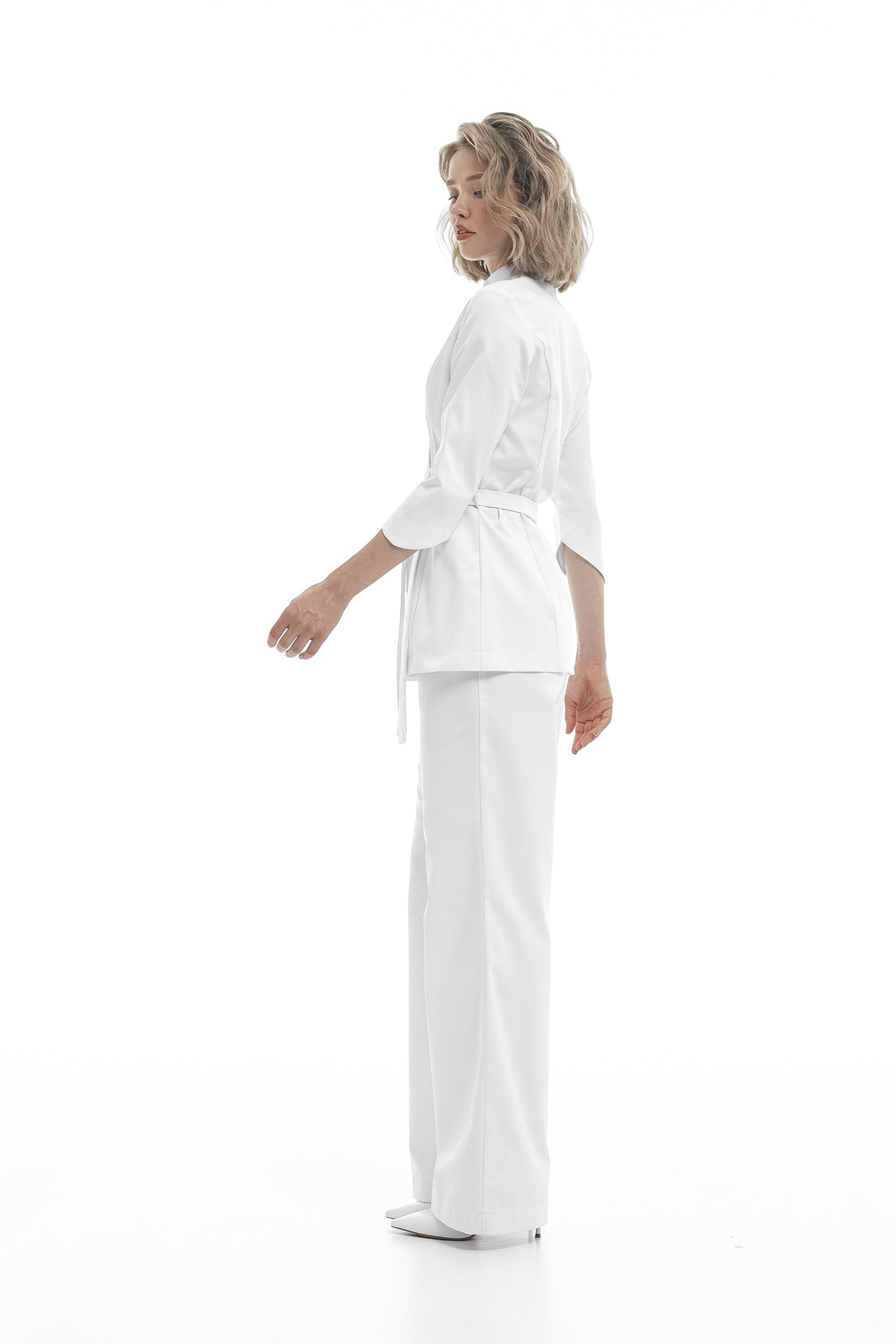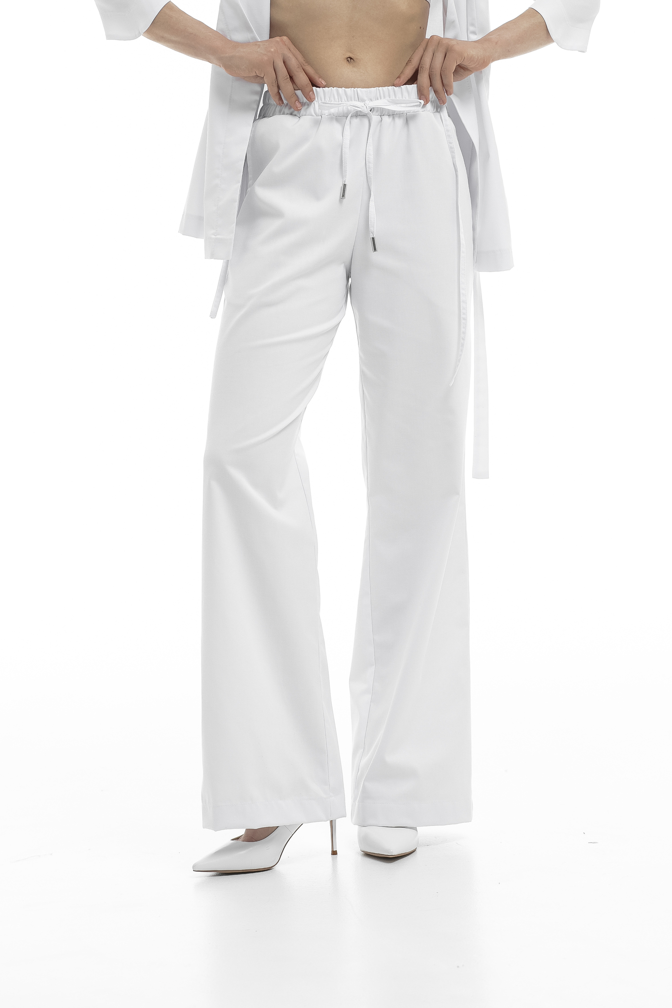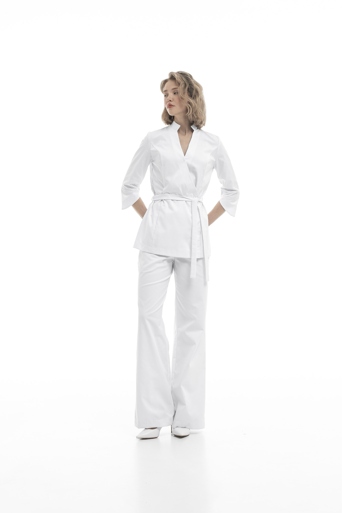 Откройте для себя бестселлер от NINE.ELEVEEN — женственный и утонченный комплект, состоящий из блузы на запах и брюк клеш, выполненный из высококачественного уплотненного хлопка!