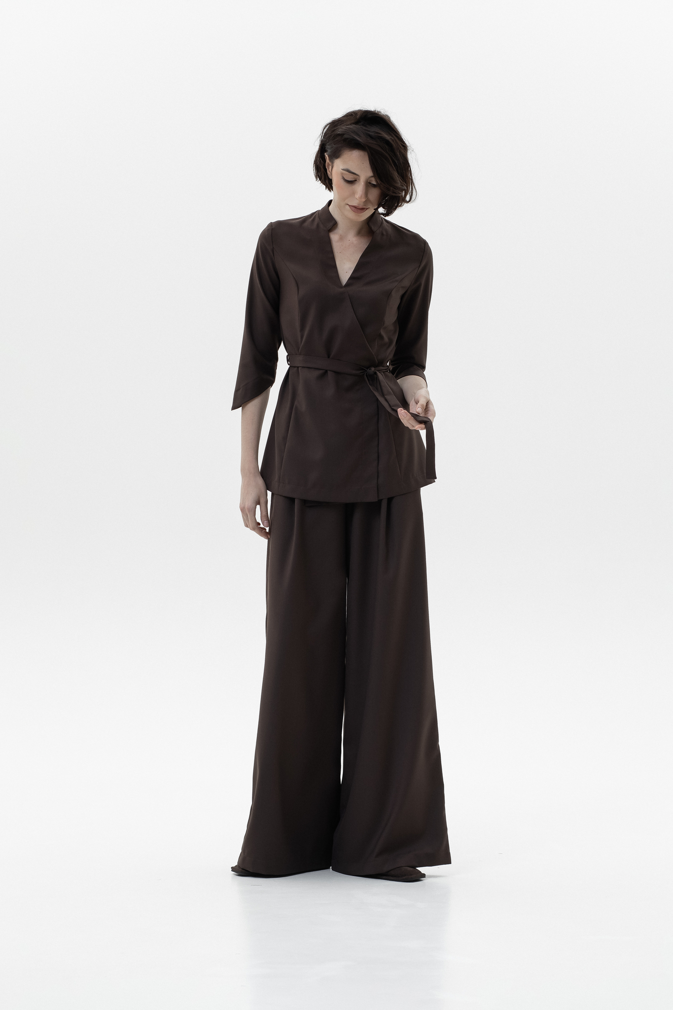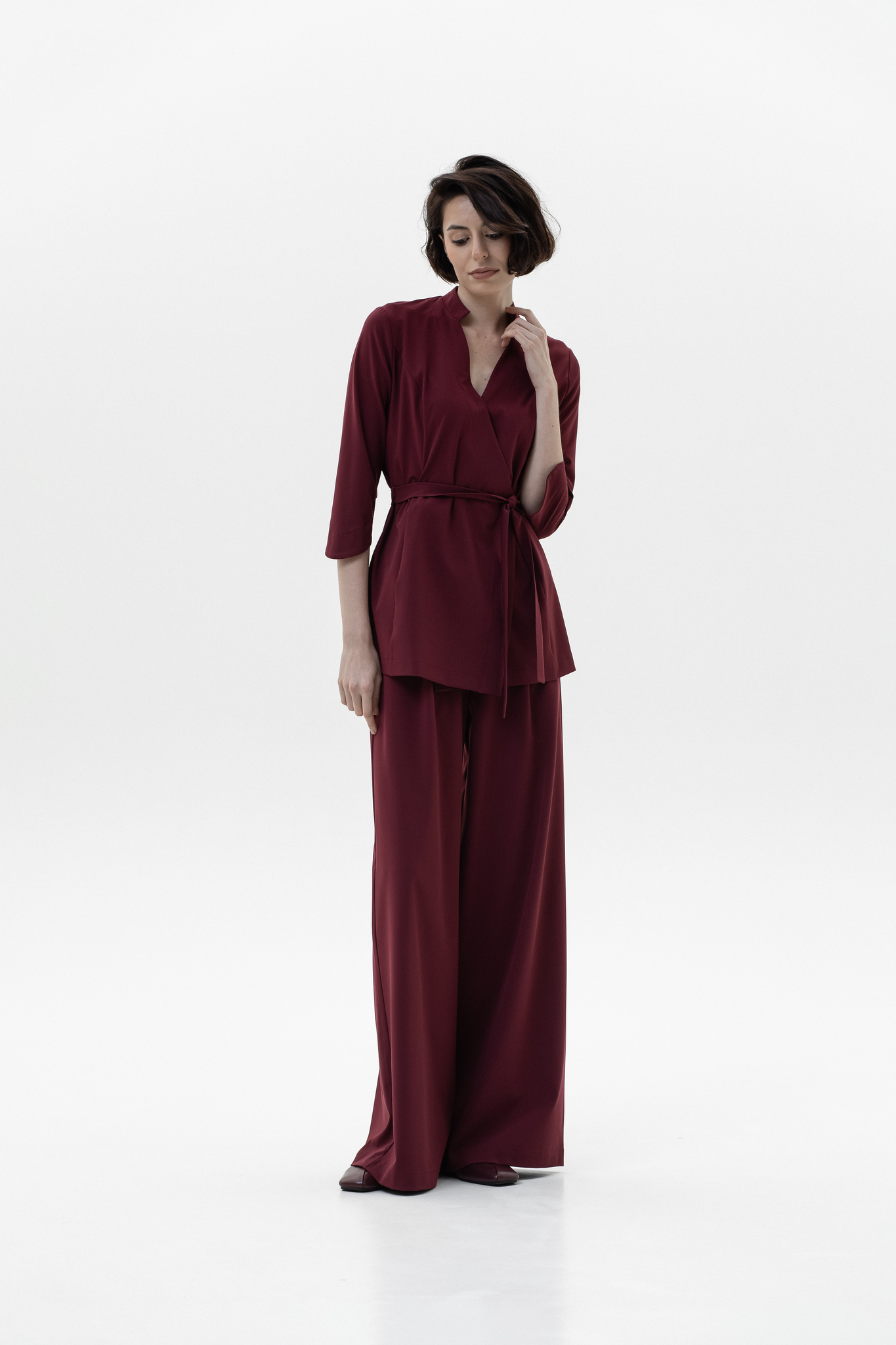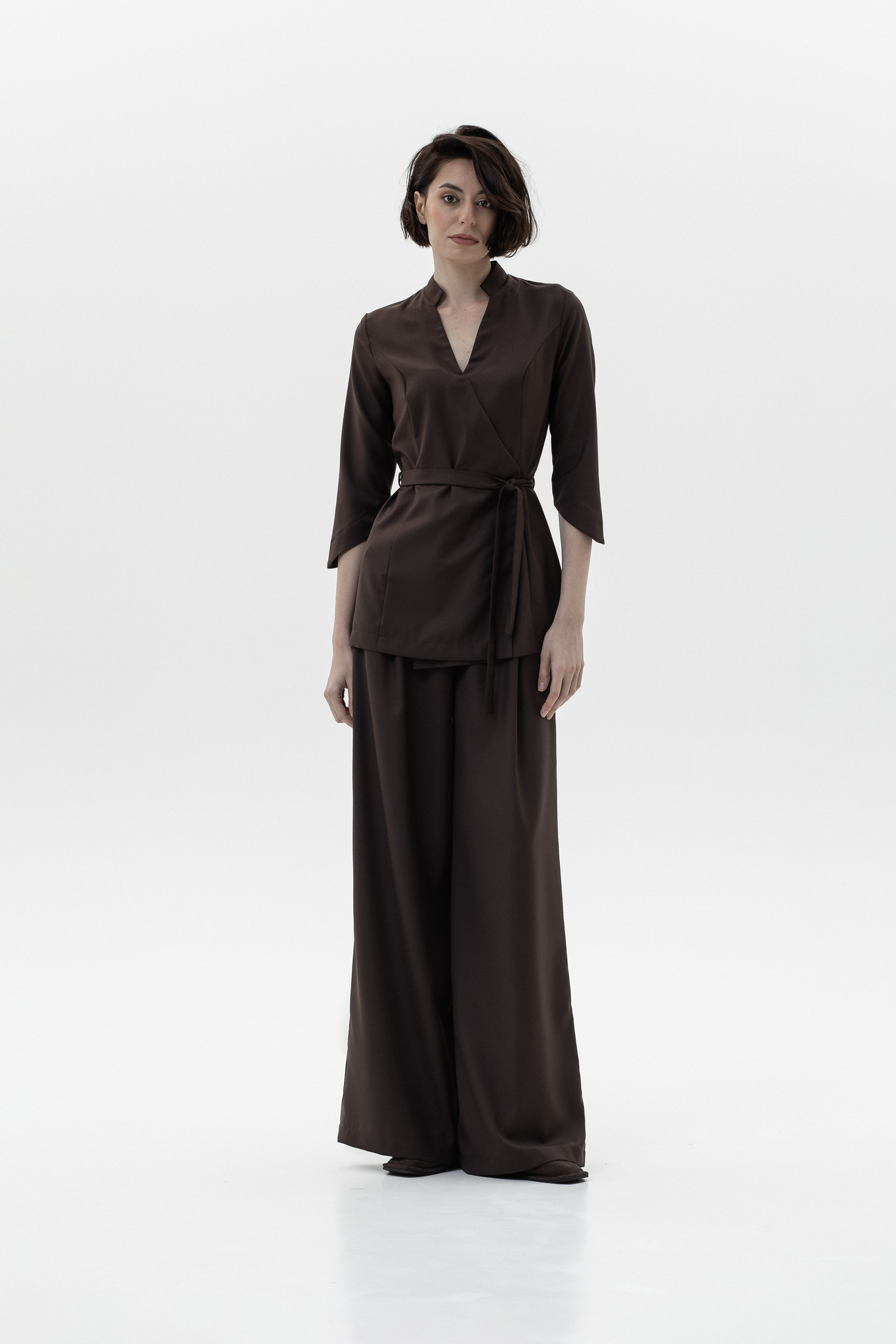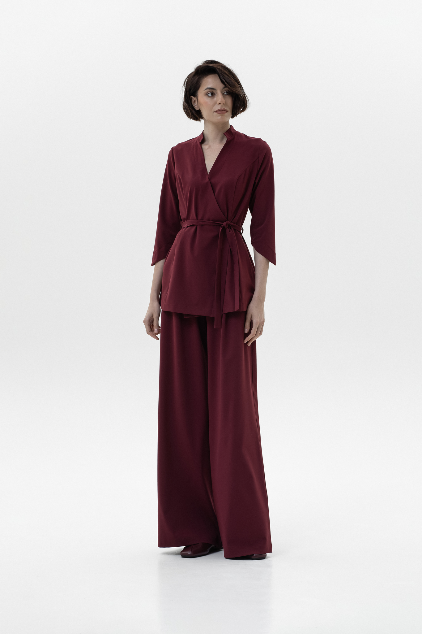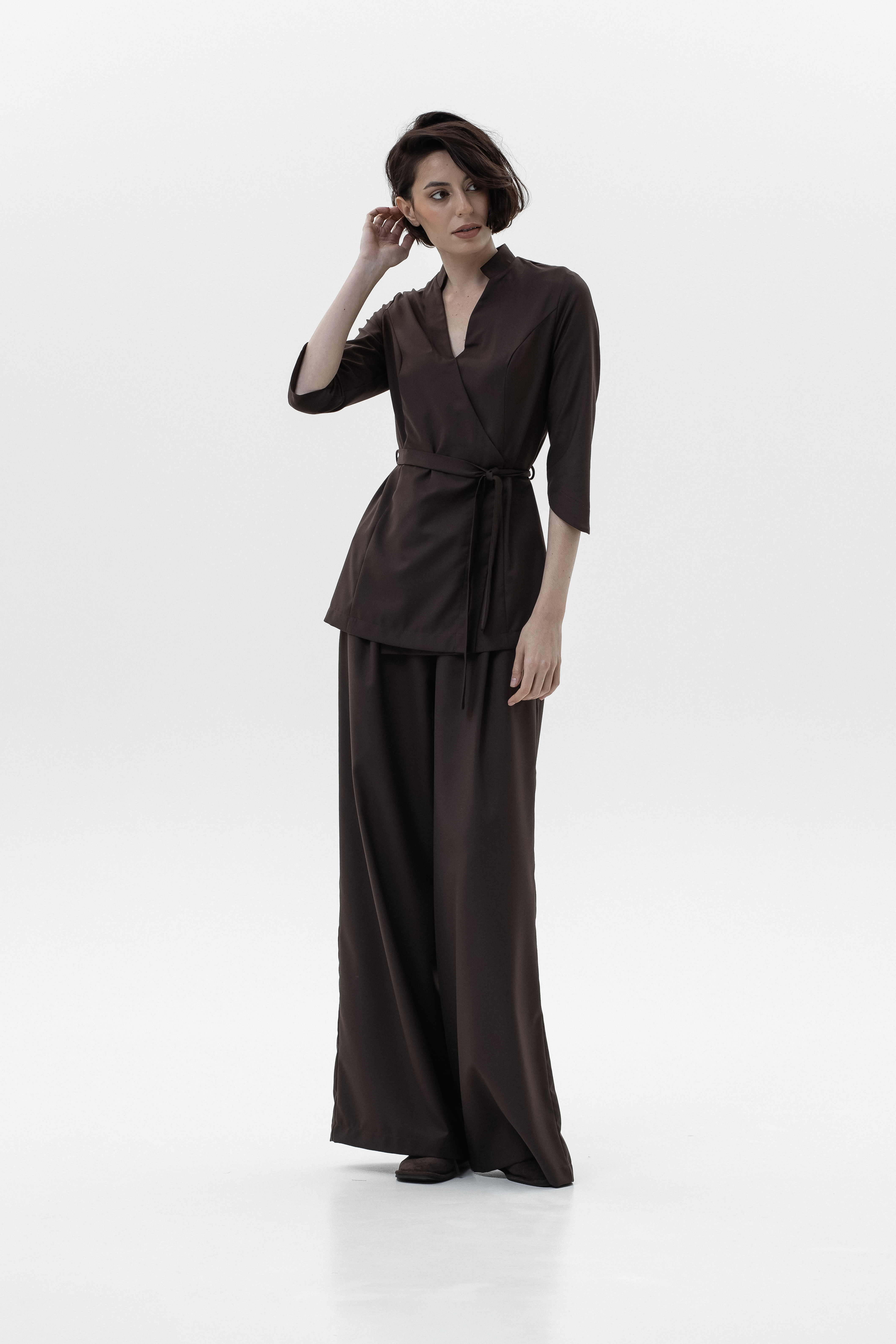 Блуза на запах, благодаря крою выгодно подчеркивает фигуру. Две кнопки на изделии надежно фиксируют ткань в зоне декольте, а внутренняя завязка и пояс позволяют отрегулировать размер под обхват вашей талии. Комфортная длина рукава обеспечивает свободу движений и не вызывает дискомфорта при работе. Ткань отлично тянется, что делает блузу удобной даже при интенсивной деятельности.