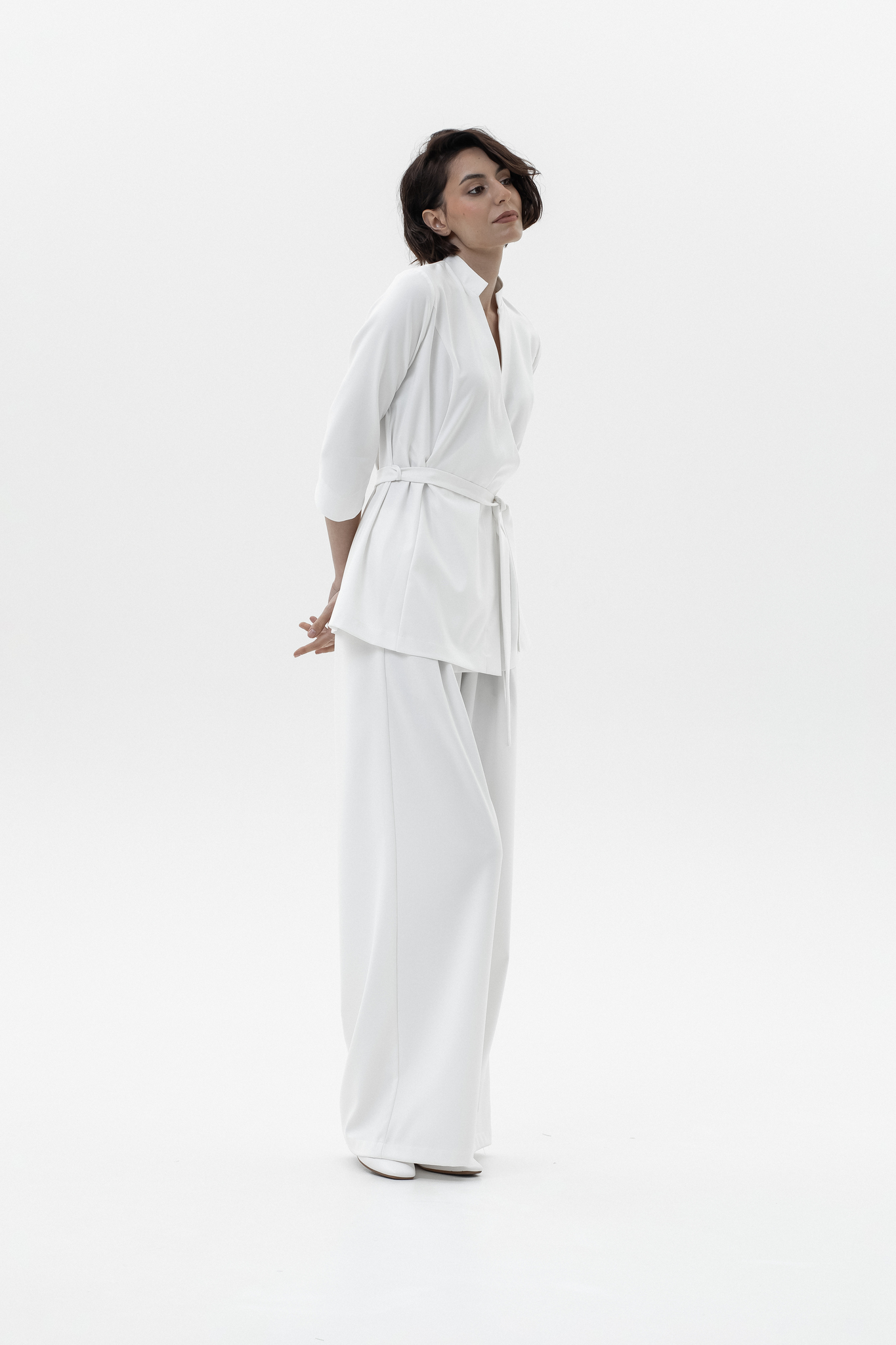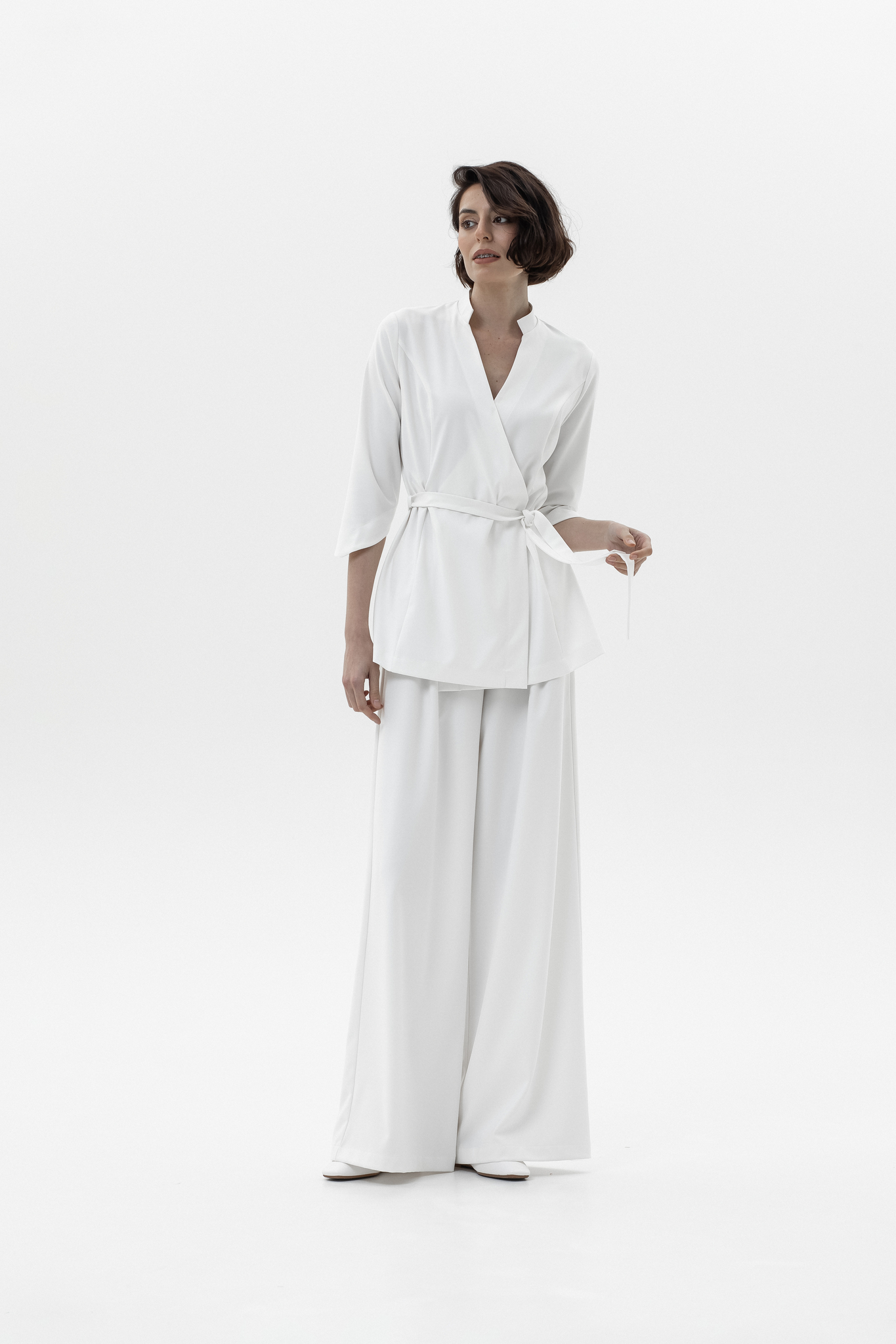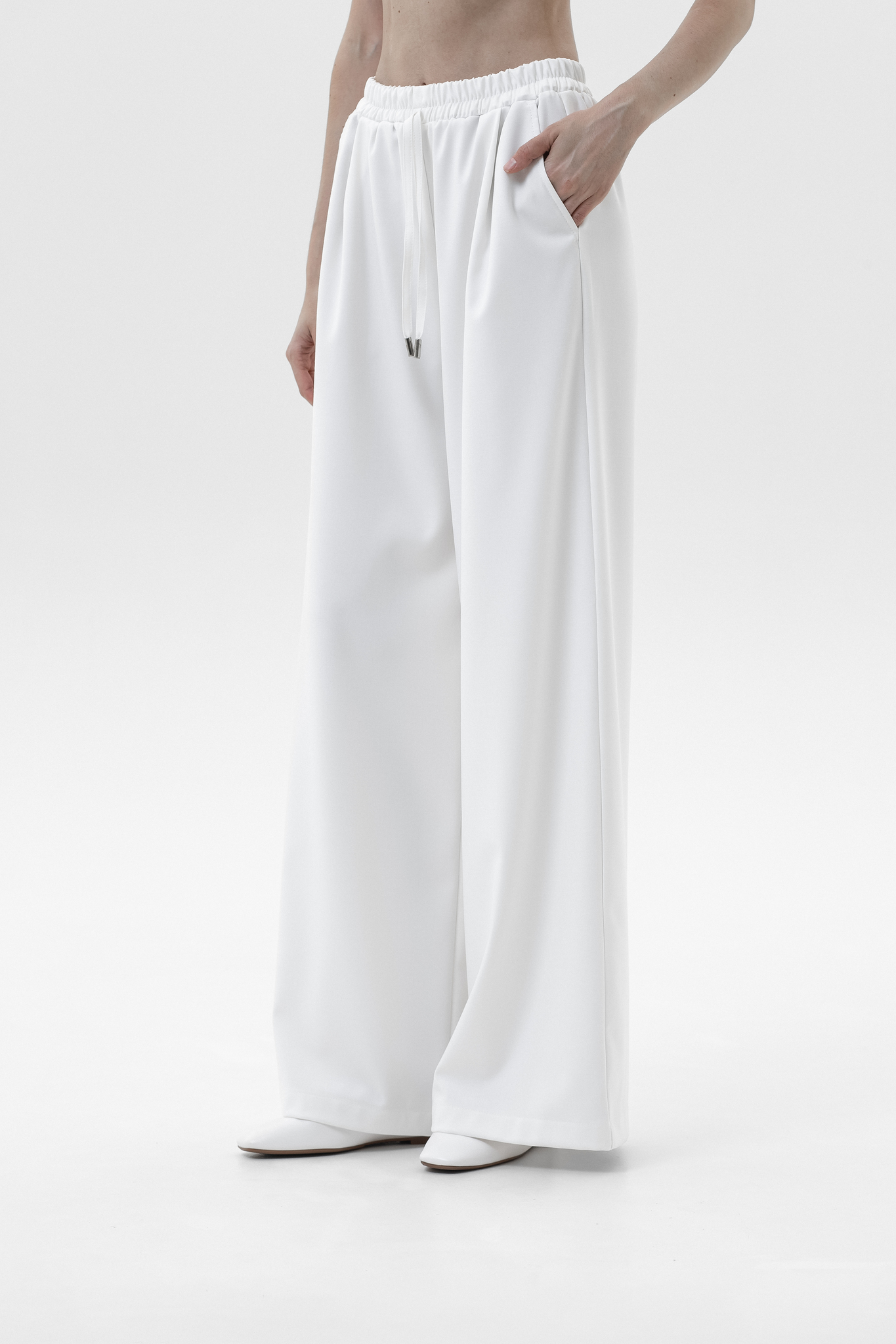 Для брюк в белом цвете используется уплотненная поливискоза (82% вискоза, 14% полиэстер, 4% эластан). Более плотная структура ткани исключает просвечивание и повышает износостойкость, сохраняя при этом мягкость, воздухопроницаемость и шелковистый внешний вид.