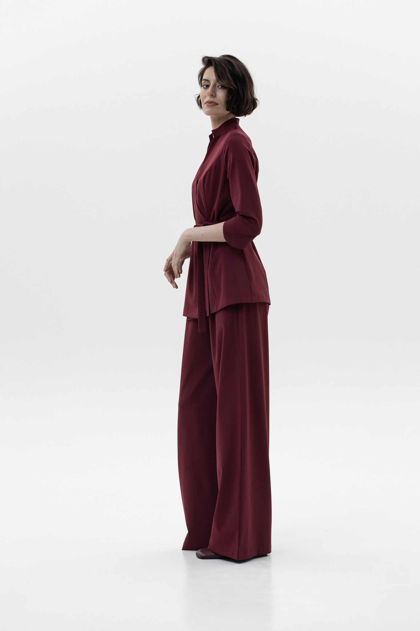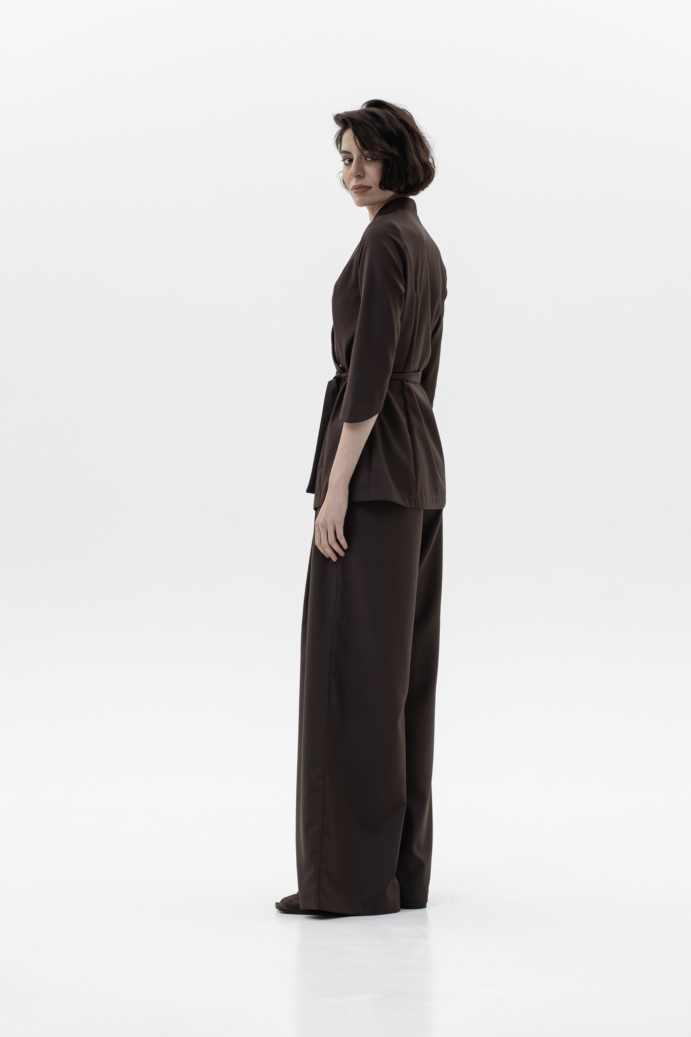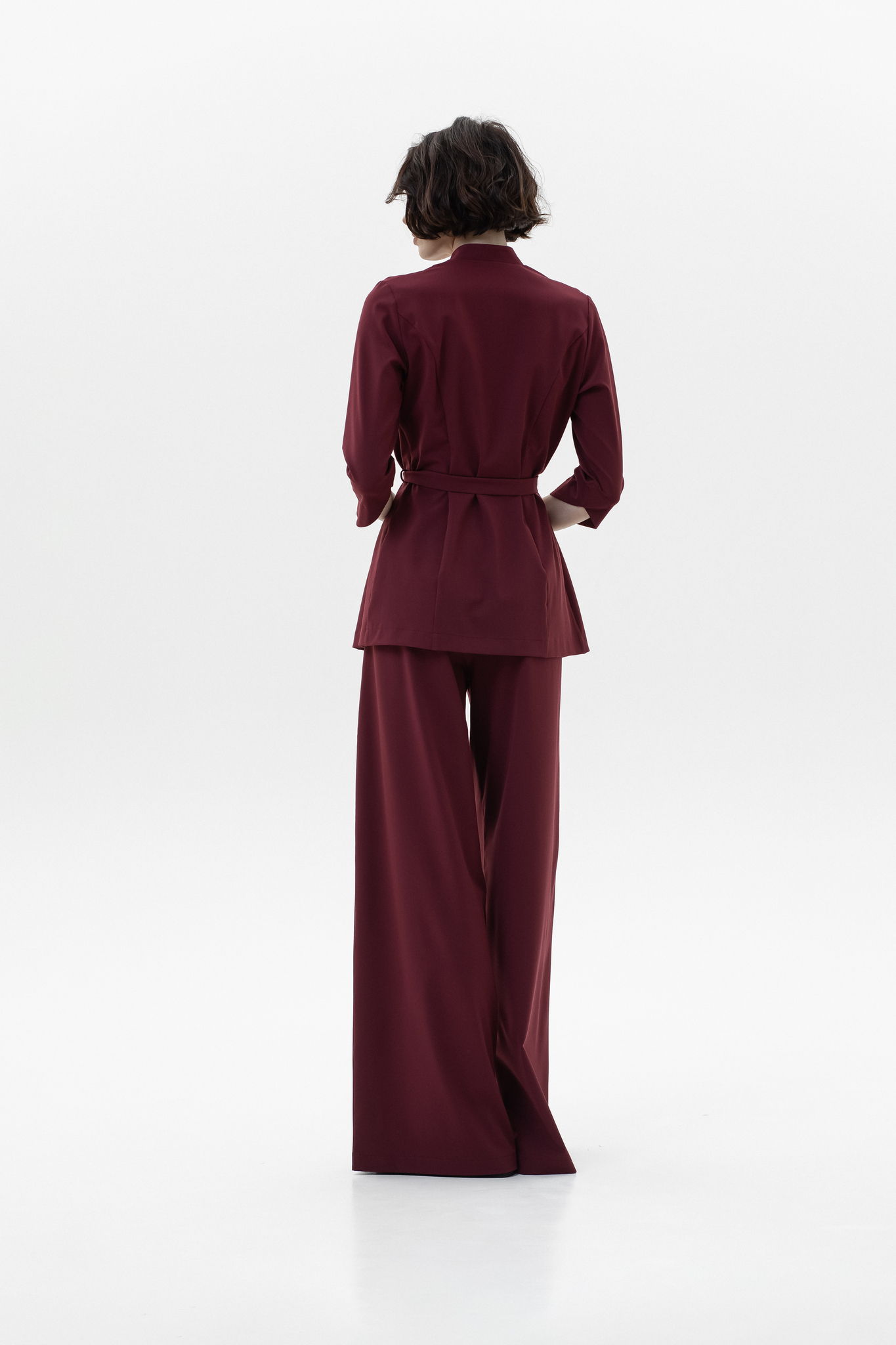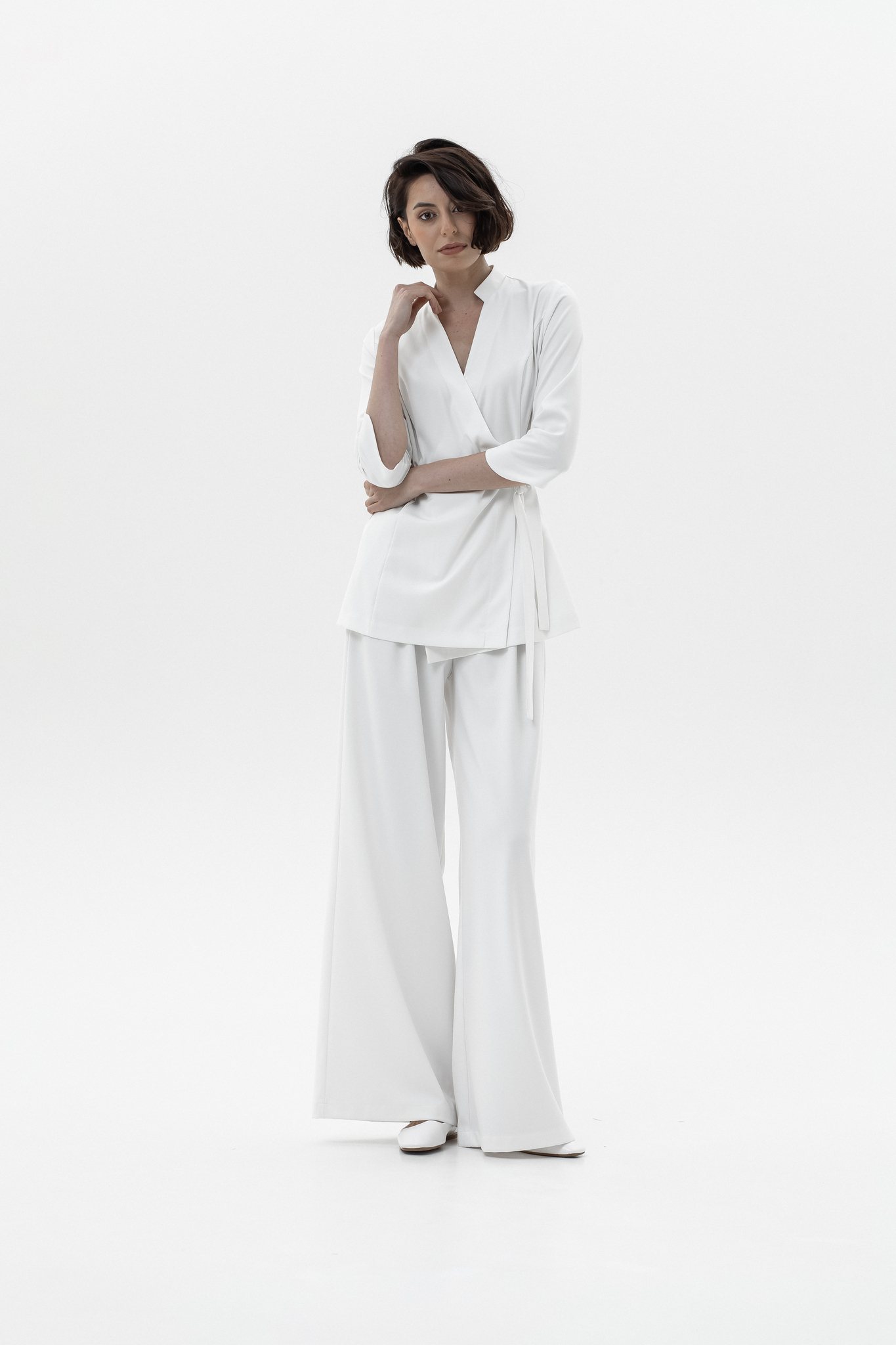 Для брюк в белом цвете используется уплотненная поливискоза (82% вискоза, 14% полиэстер, 4% эластан). Более плотная структура ткани исключает просвечивание и повышает износостойкость, сохраняя при этом мягкость, воздухопроницаемость и шелковистый внешний вид.