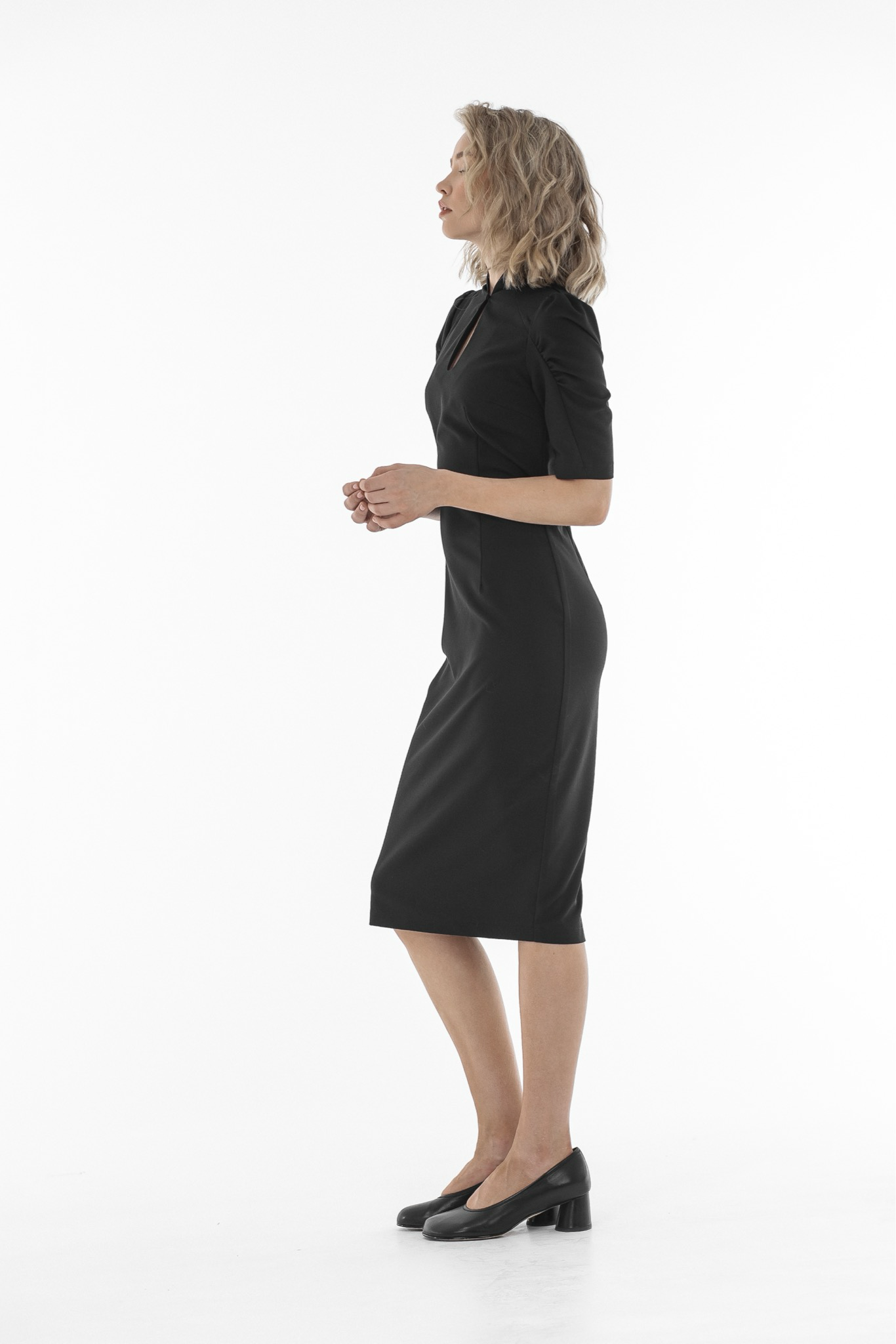 Нежное платье с фигурным вырезом-стойкой и декоративной пуговицей для элегантного образа. Приталенный силуэт и длина ниже колена подчеркивают женственность, а объемный рукав-фонарик добавляет легкости. Потайная молния на спинке обеспечивает удобство при надевании. Идеальный выбор для особых случаев или торжественных мероприятий.