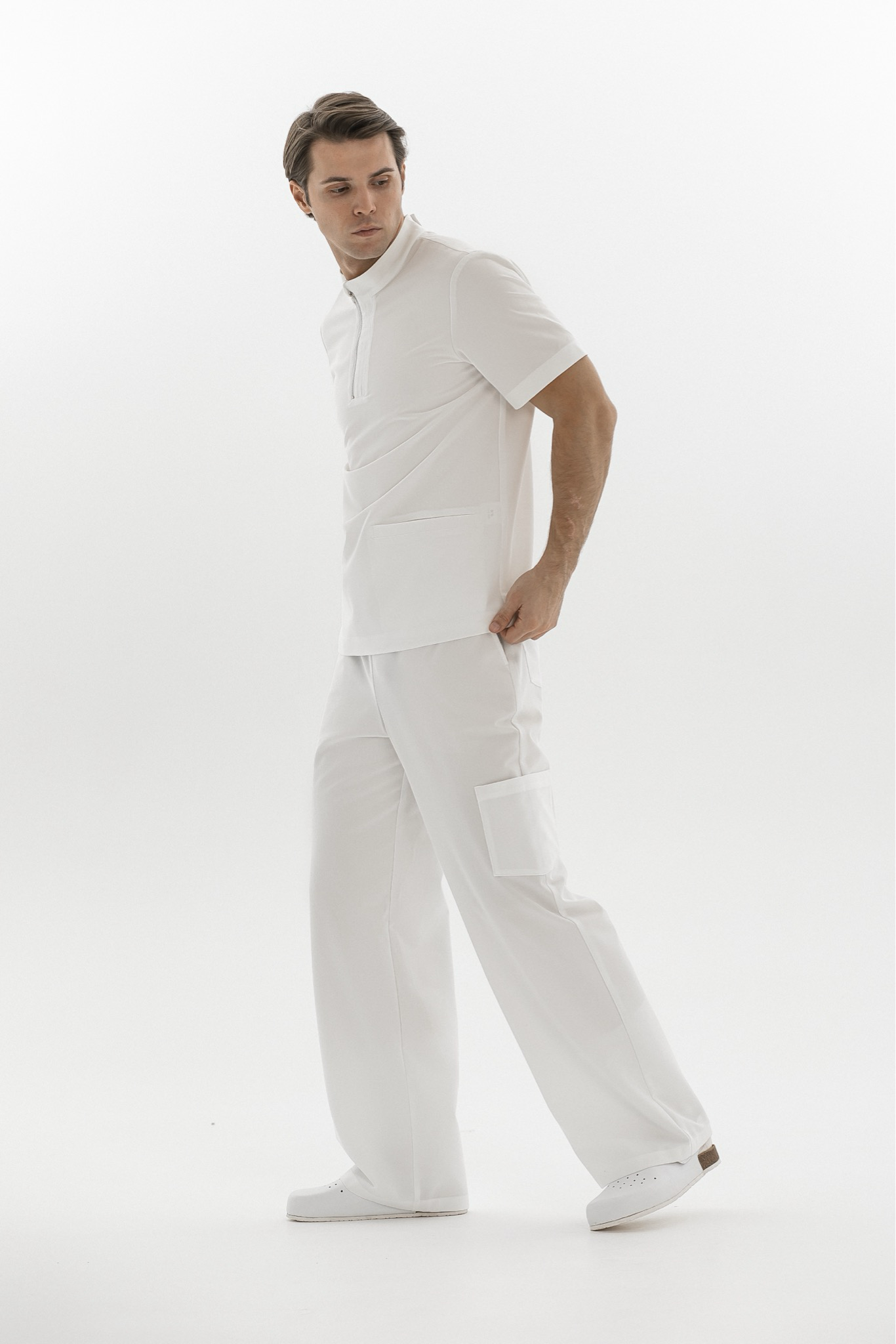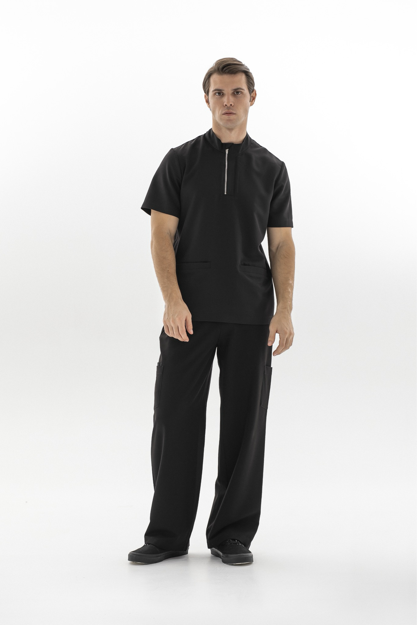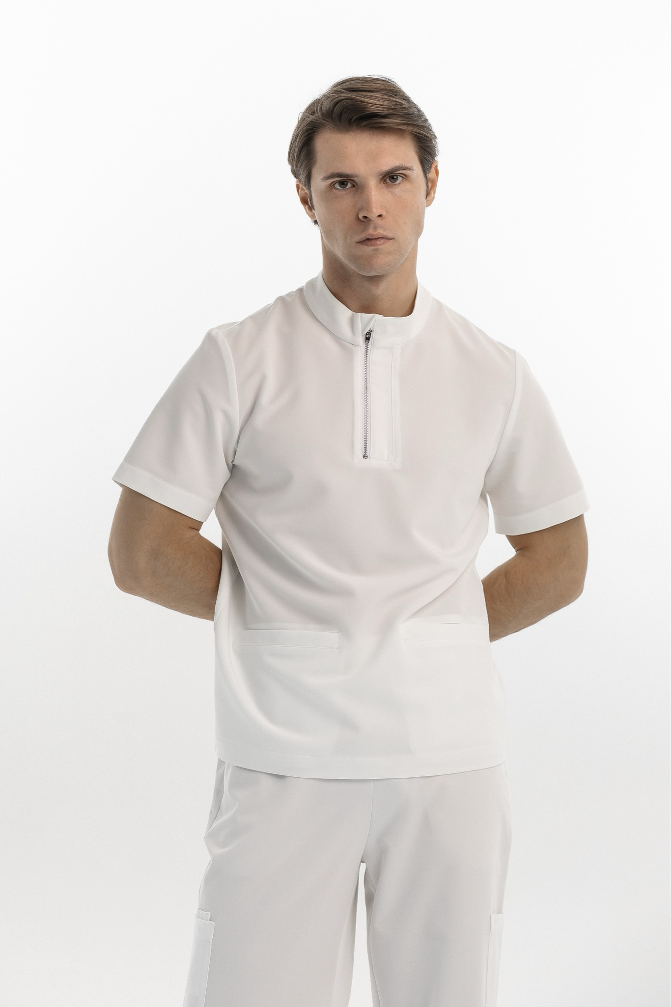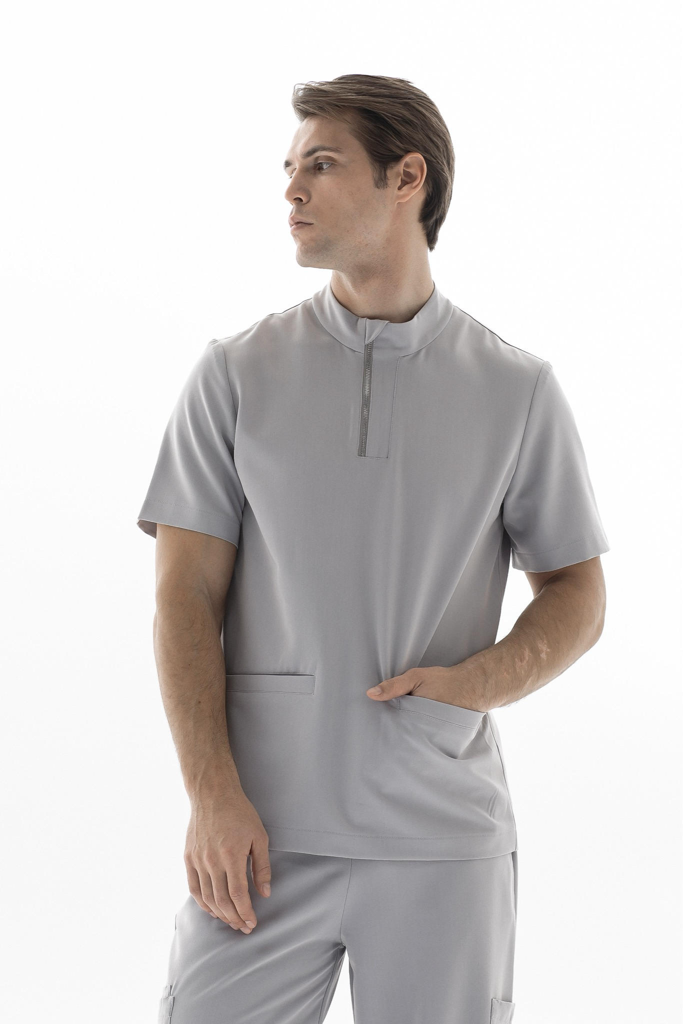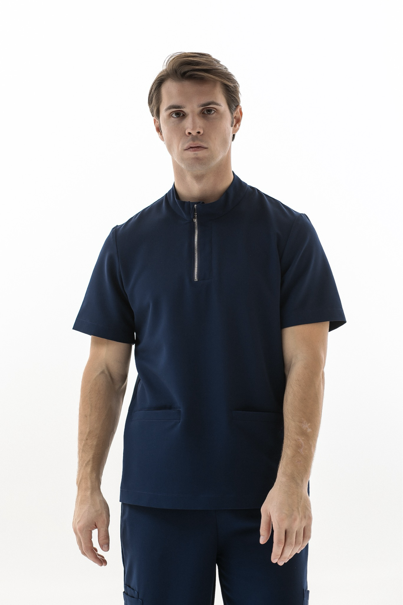 Основной особенностью поло Астер является воротник-стойка с планкой и металлическая молния, которая не только добавляет элегантности, но и позволяет регулировать прилегание горловины. Два просторных передних кармана идеально подходят для хранения всех необходимых рабочих мелочей. Свободный крой и короткие рукава делают это поло универсальным выбором для различных медицинских специальностей.